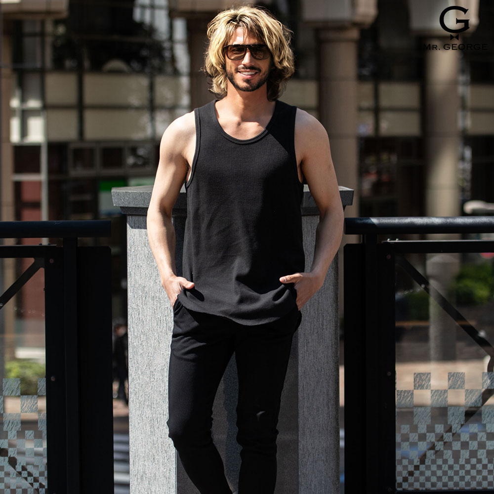 Tシャツ タンクトップ メンズ ミスタ―ジョージ 40代 50代 ファッション おしゃれ イケオジ ブランド ちょいワル 大きいサイズ ノースリーブ 白T トップス インナー レイヤード ワッフル スリット 無地 シンプル 大人 ホワイト ブラック