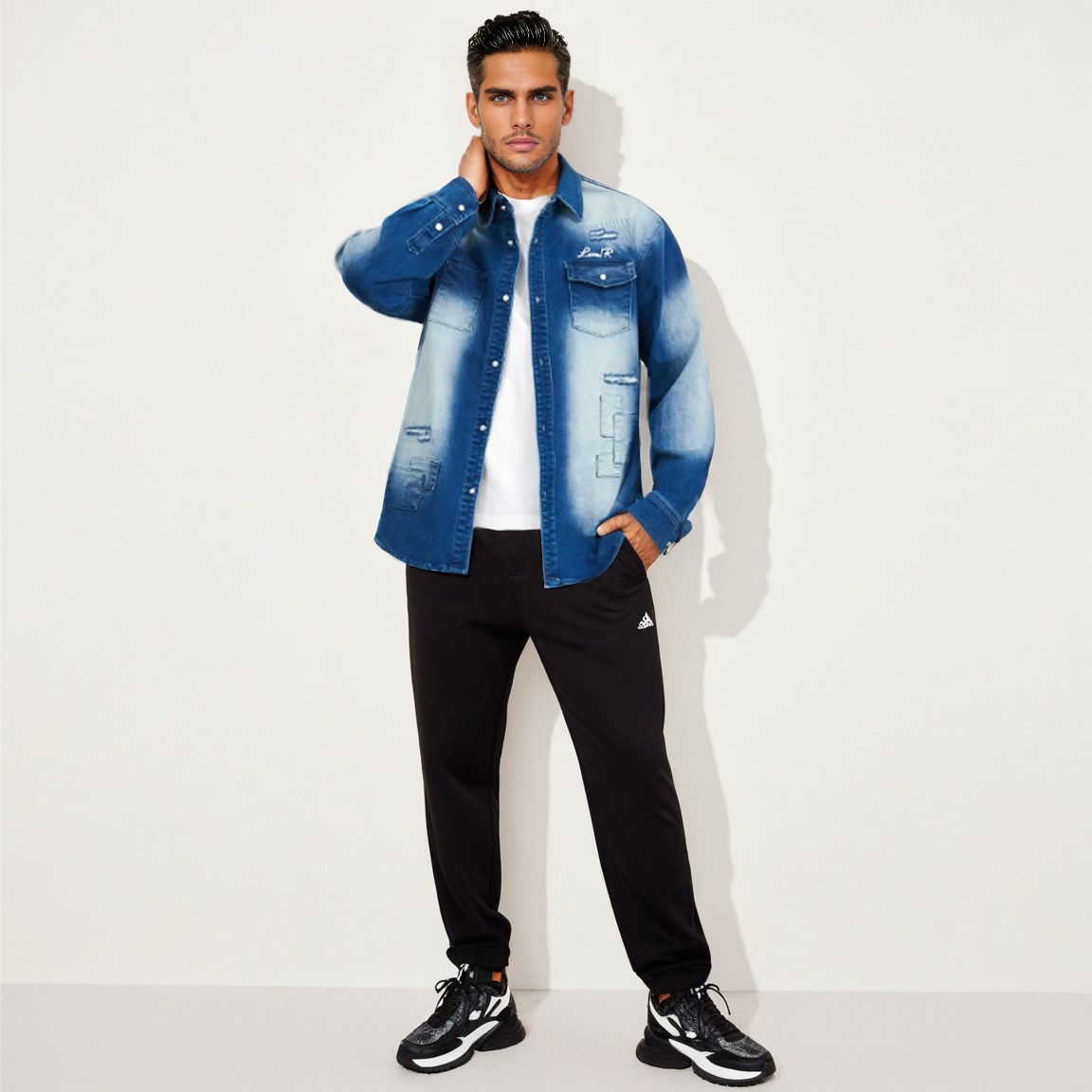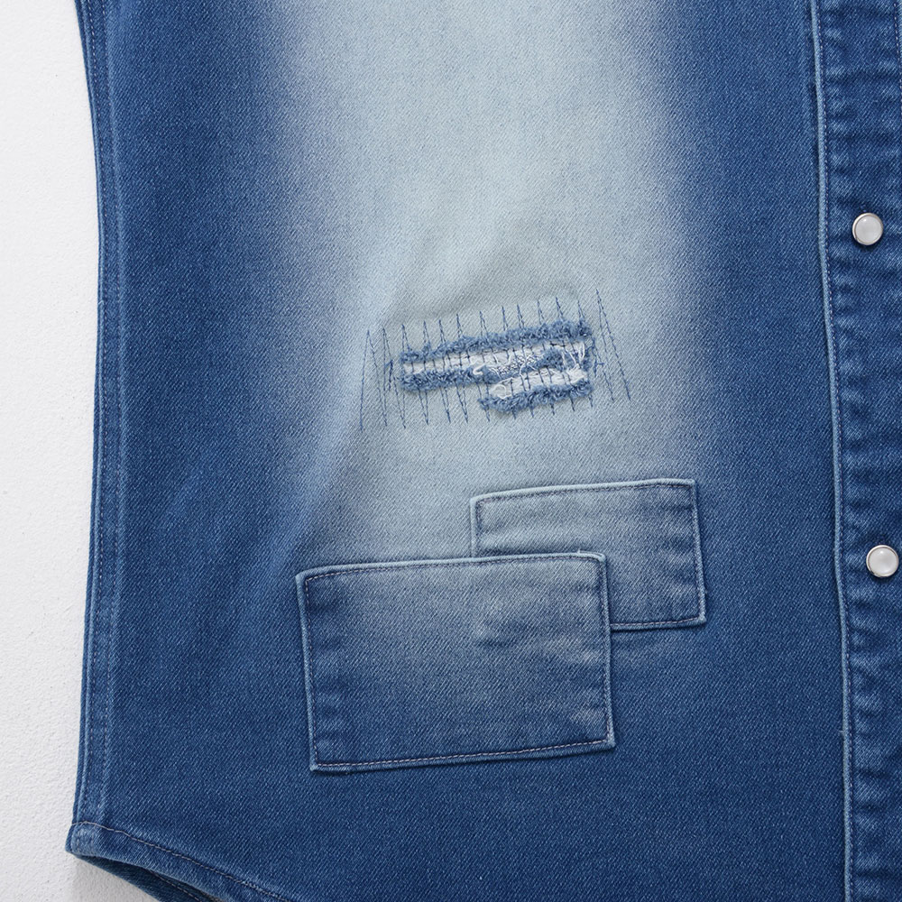 イケオジ おしゃれ シャツ デニムシャツ メンズ ブランド 長袖シャツ ちょい悪 オヤジ ミスタ—ジョージ ダンディ 40代 50代 60代 ファッション ブリーチ加工 ダメージ加工 リペア加工 古着 ヴィンテージ 大人 サックス ブルー カジュアルシャツ 中年男性 服 春