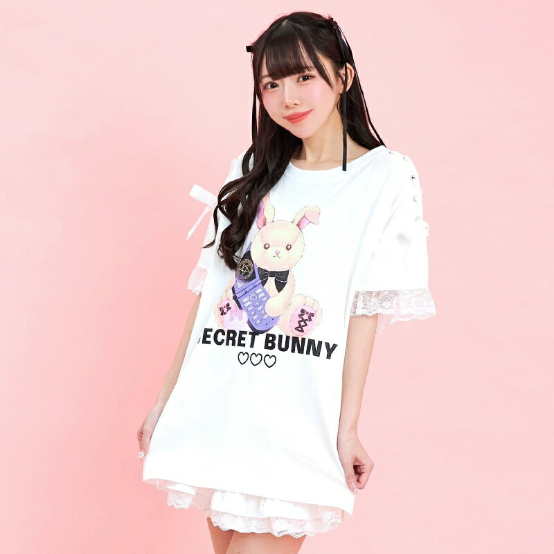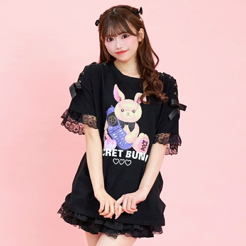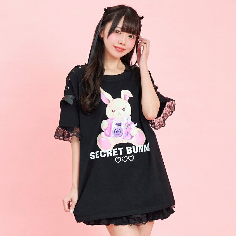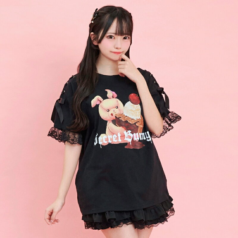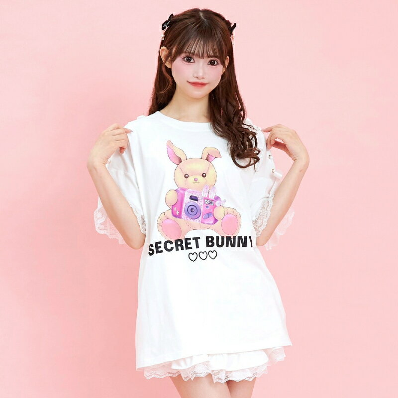 肩レースアップうさぎプリントTシャツ3/7 12:00 新色販売スタート2/14 12:00 販売スタートsecrethoney シークレットハニー シーハニ 量産型 レディース ガーリー ホワイト 白 ブラック 黒