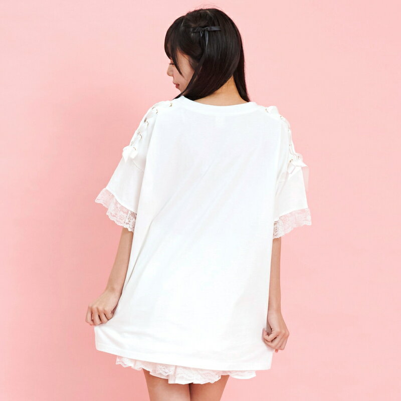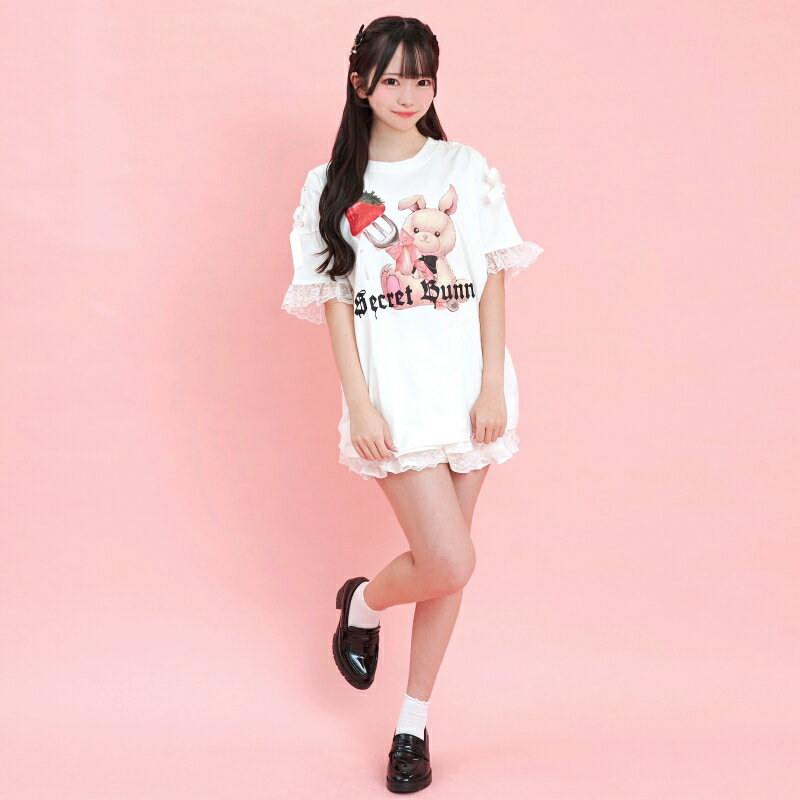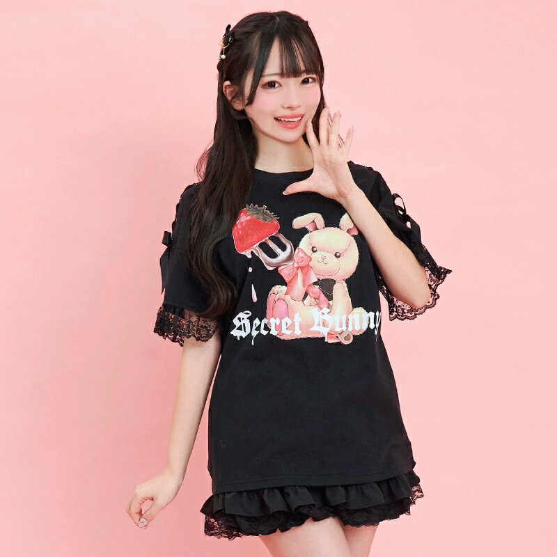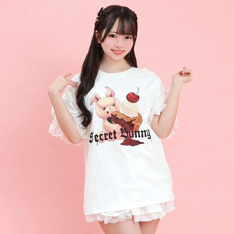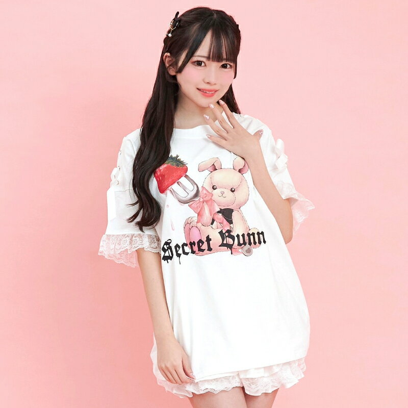肩レースアップうさぎプリントTシャツ3/7 12:00 新色販売スタート2/14 12:00 販売スタートsecrethoney シークレットハニー シーハニ 量産型 レディース ガーリー ホワイト 白 ブラック 黒