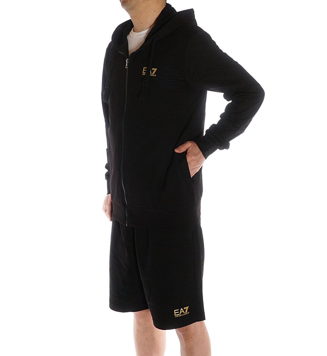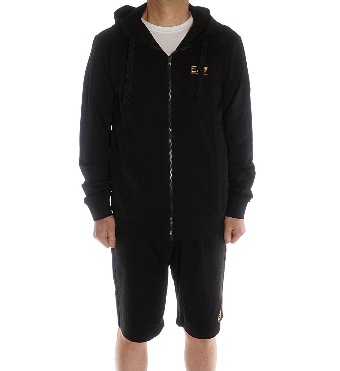 エンポリオアルマーニ EMPORIO ARMANI EA7 セットアップ スウェット上下 ジップパーカー ハーフパンツ メンズ ブラック×ゴールドロゴ 8NPM03 8NPS02 PJ05Z 0208