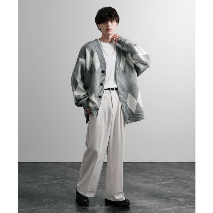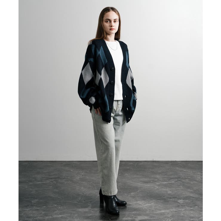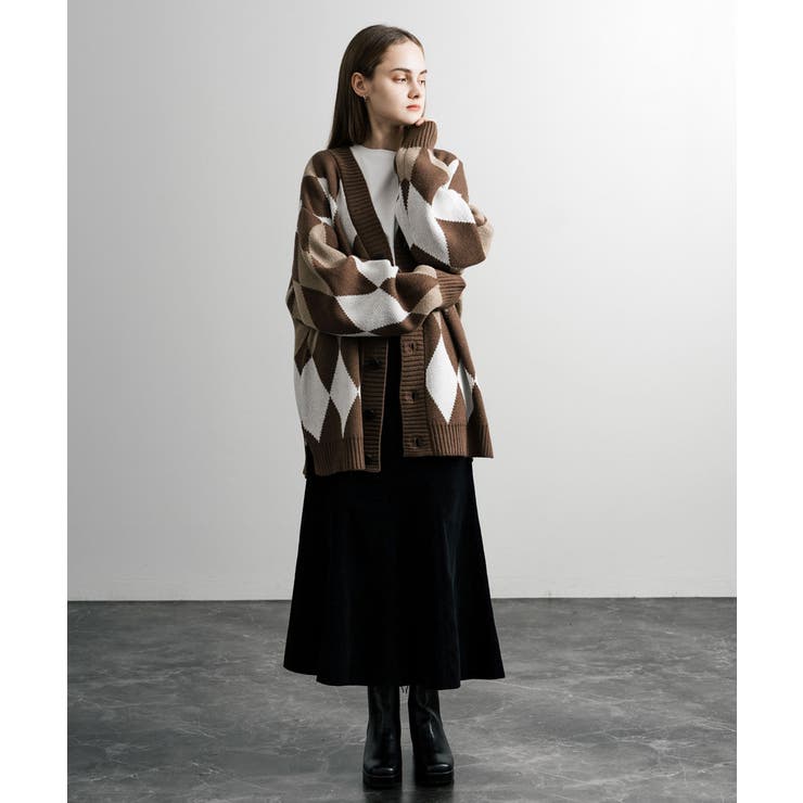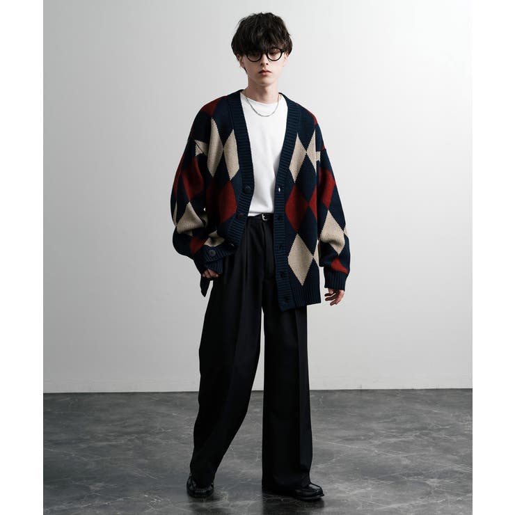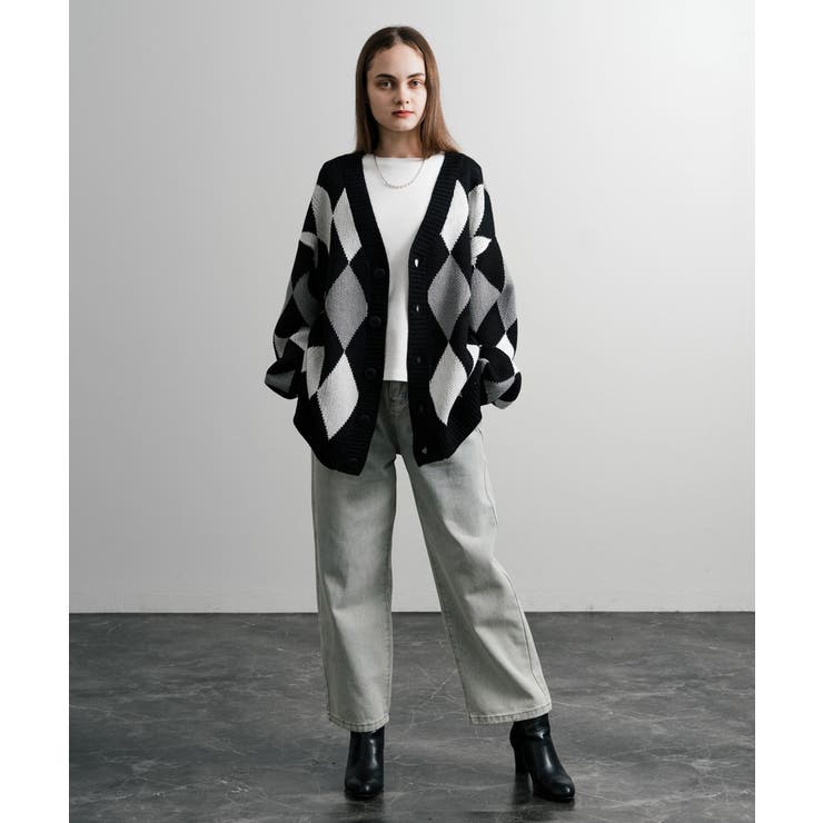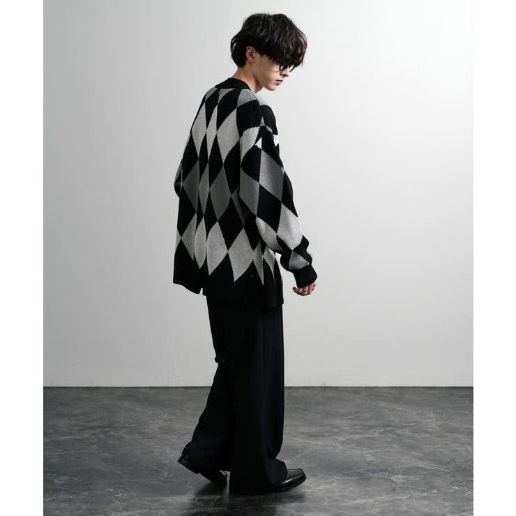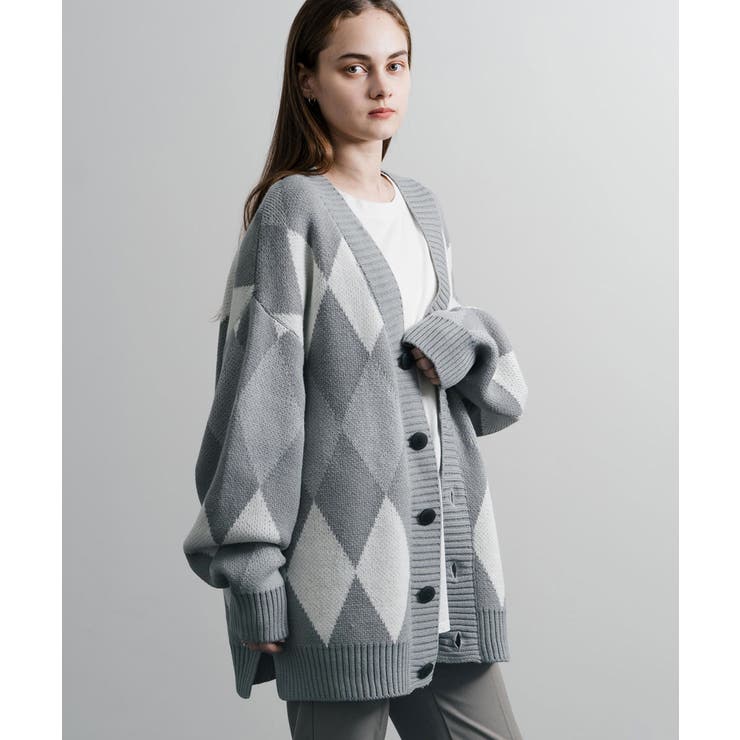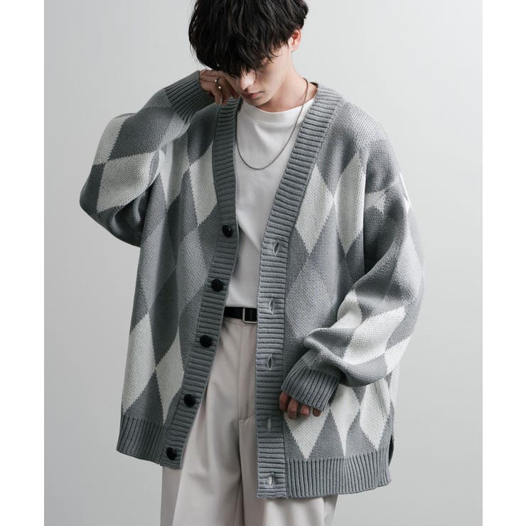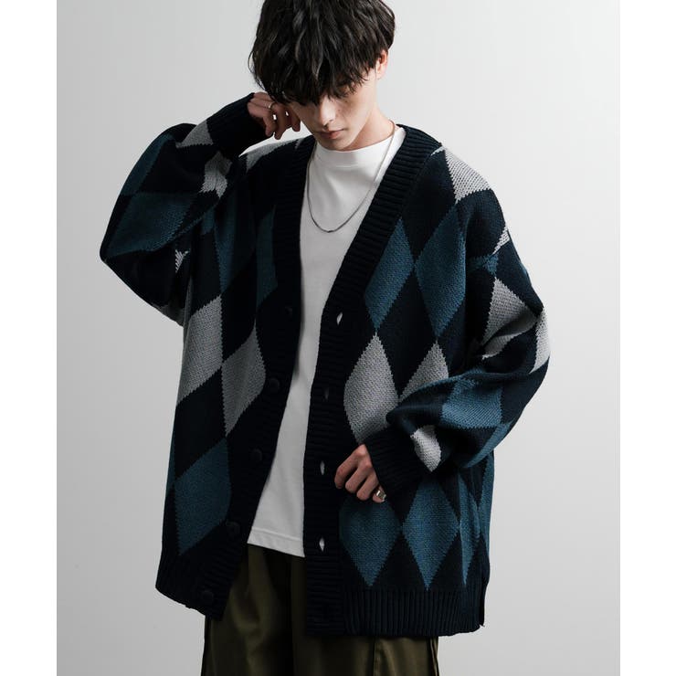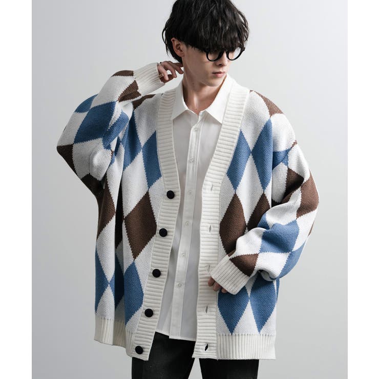 ニットカーディガン オーバーサイズ 総柄 メンズ レディース ライトアウター ルーズ ゆるニット ミドルゲージ 7G ビッグシルエット リラックス アクリル ルームウェア カジュアル きれいめ ストリート アーガイル チェック ブロッキング 古着 ユニセックス 春秋冬 11618