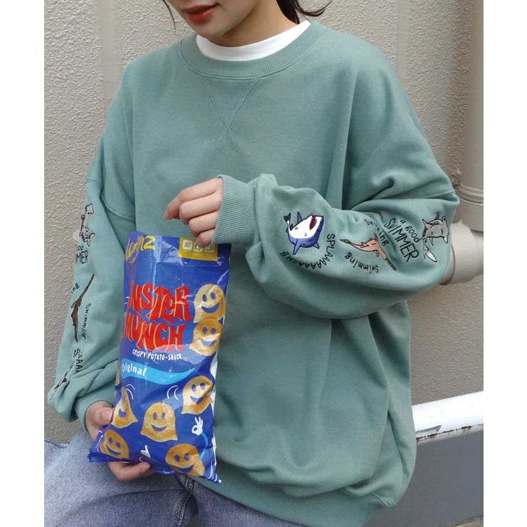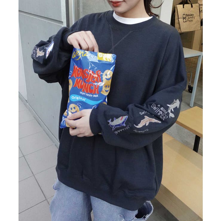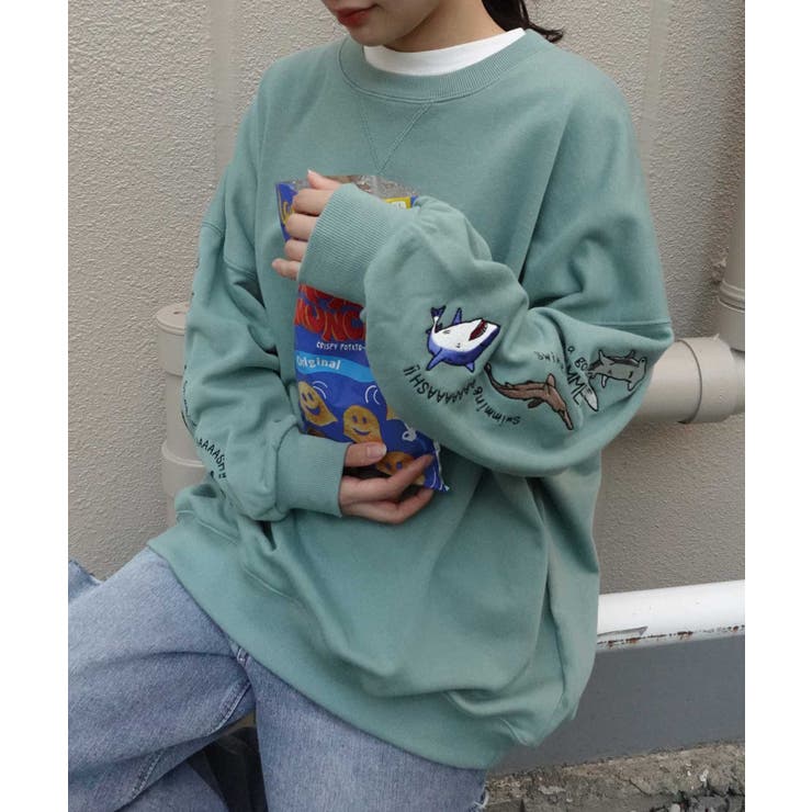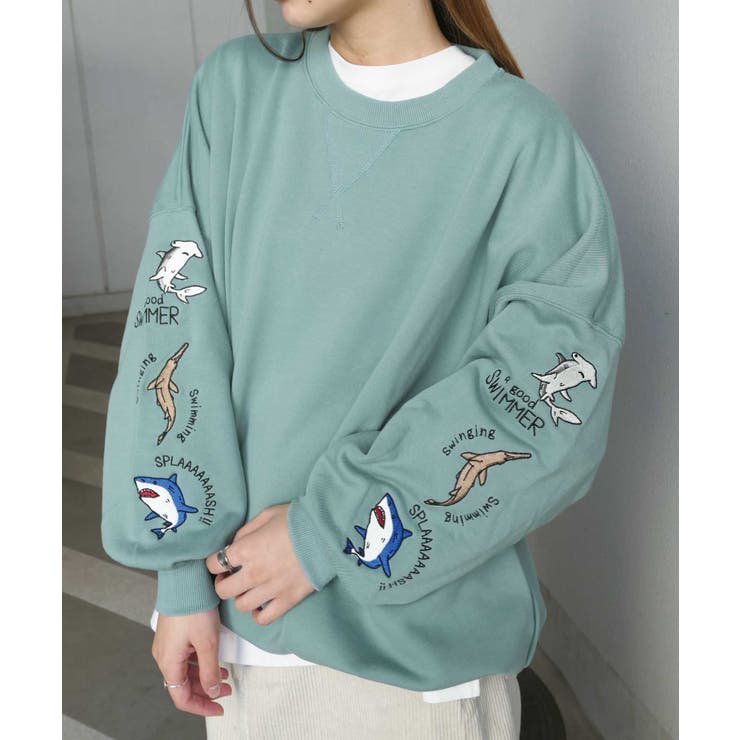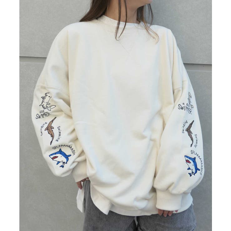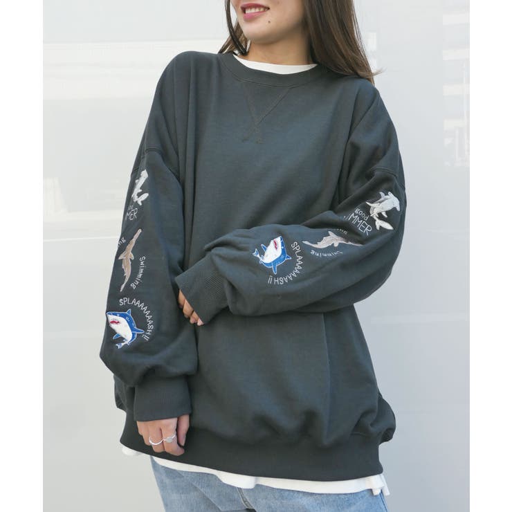 【2/10 1:59まで 10%OFFクーポン】袖サメ刺繍オーバーサイズトレーナー