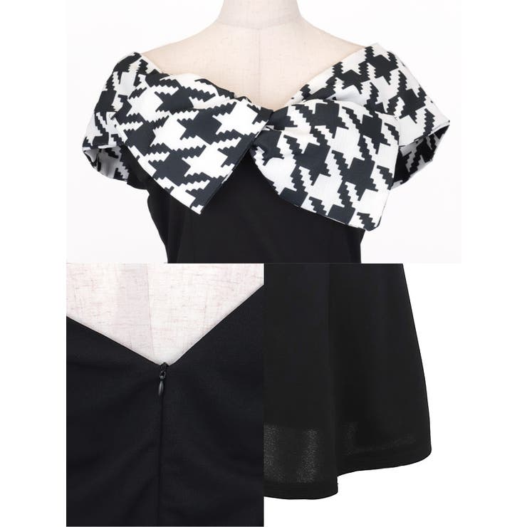 my minette 千鳥格子柄リボンオフショル×オープンバッククラシカルミニドレス ガーリードレス フレアドレス 袖なし Aライン キャバドレス キャバ ドレス S-Lサイズ ブラック モノトーン 斉藤らな myMinette マイミネット ワンピース