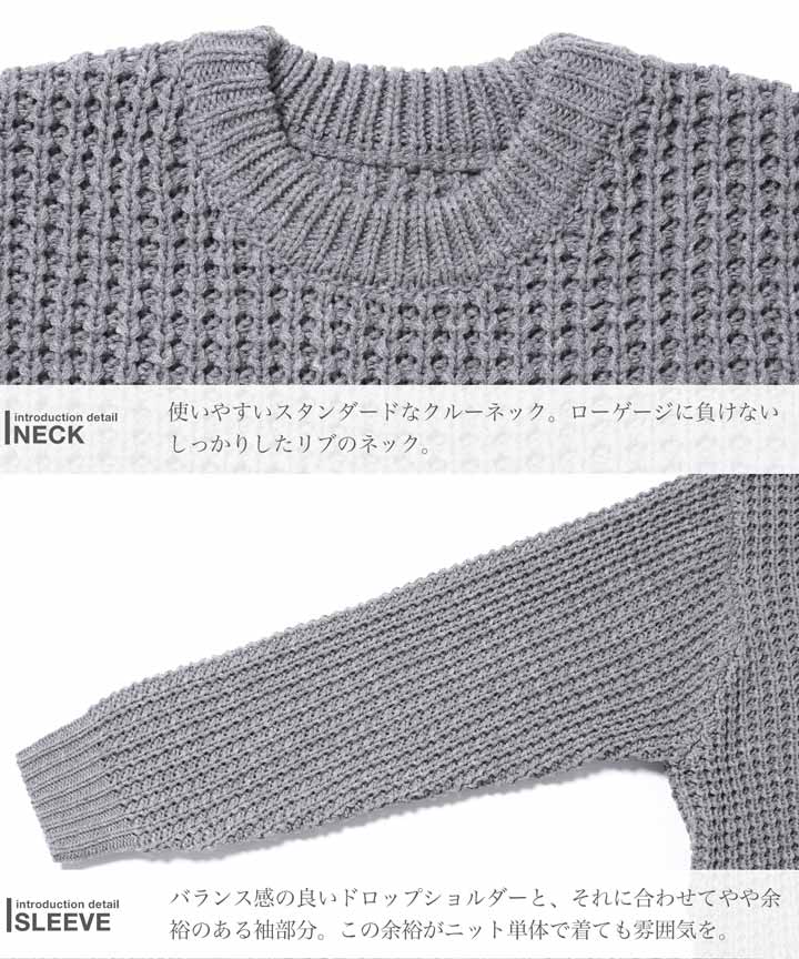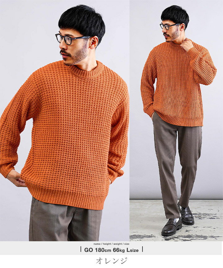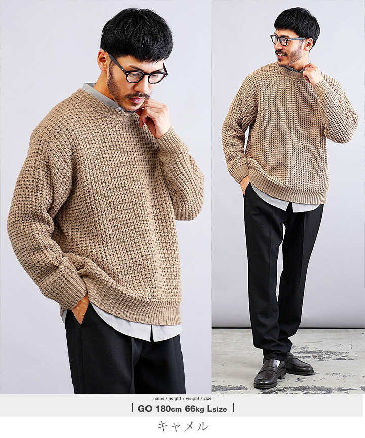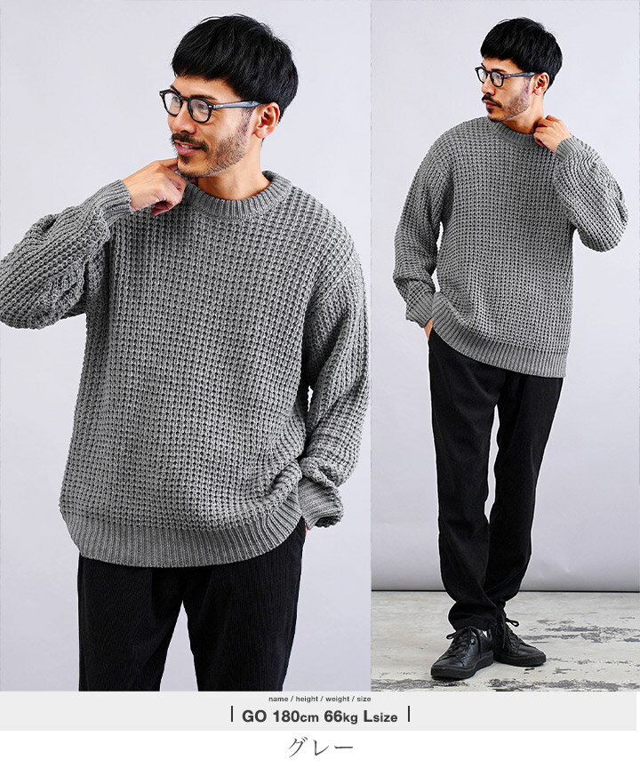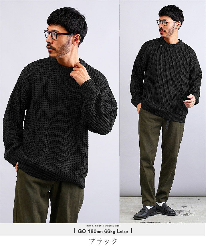 セーター メンズ ニット ニットセーター 厚手 冬物 チクチクしない◆ビッグワッフルクルーネックニット◆ワッフル素材 肉厚 長袖 黒 丸首 クルーネック メンズファッション 服 秋服 秋物 冬服 冬 おしゃれ 暖かい