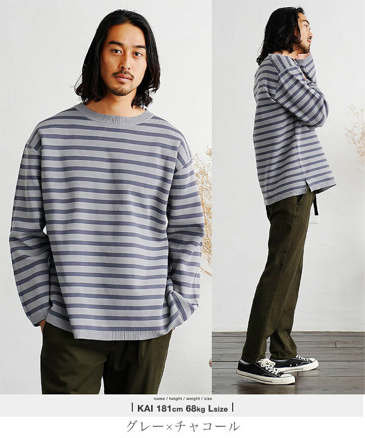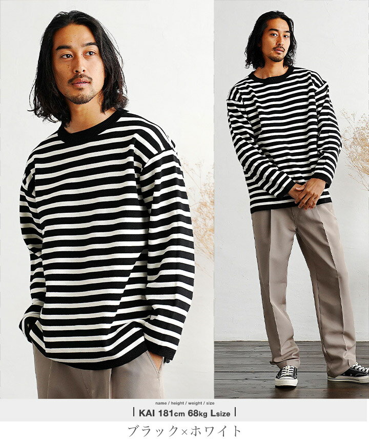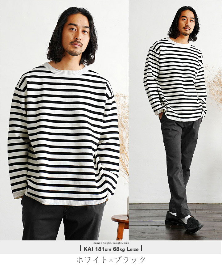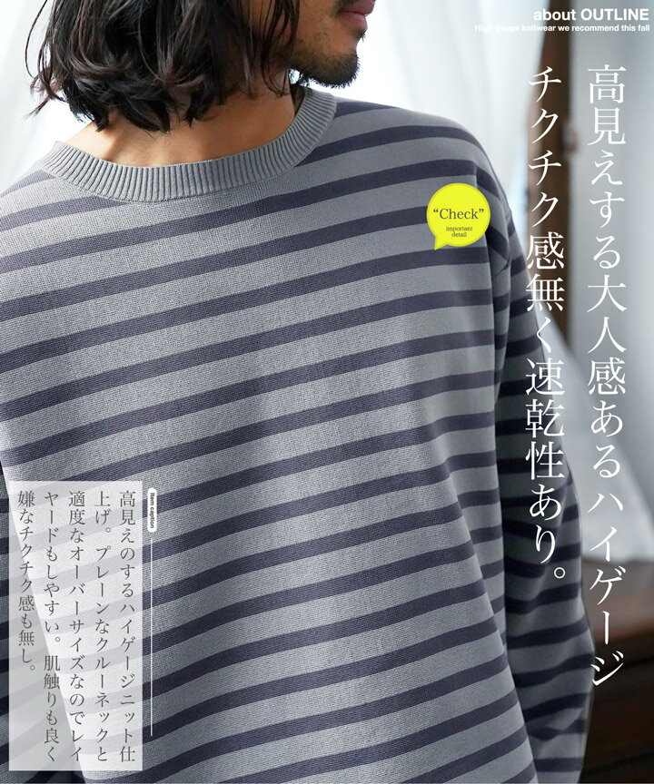 セーター メンズ ニット ニットセーター チクチクしない◆ストレッチドライタッチボーダーニット◆ストレッチ 伸縮性 柄 ボーダー 薄手 軽い 長袖 黒 丸首 クルーネック 速乾性 服 秋服 秋物 春服 冬 おしゃれ