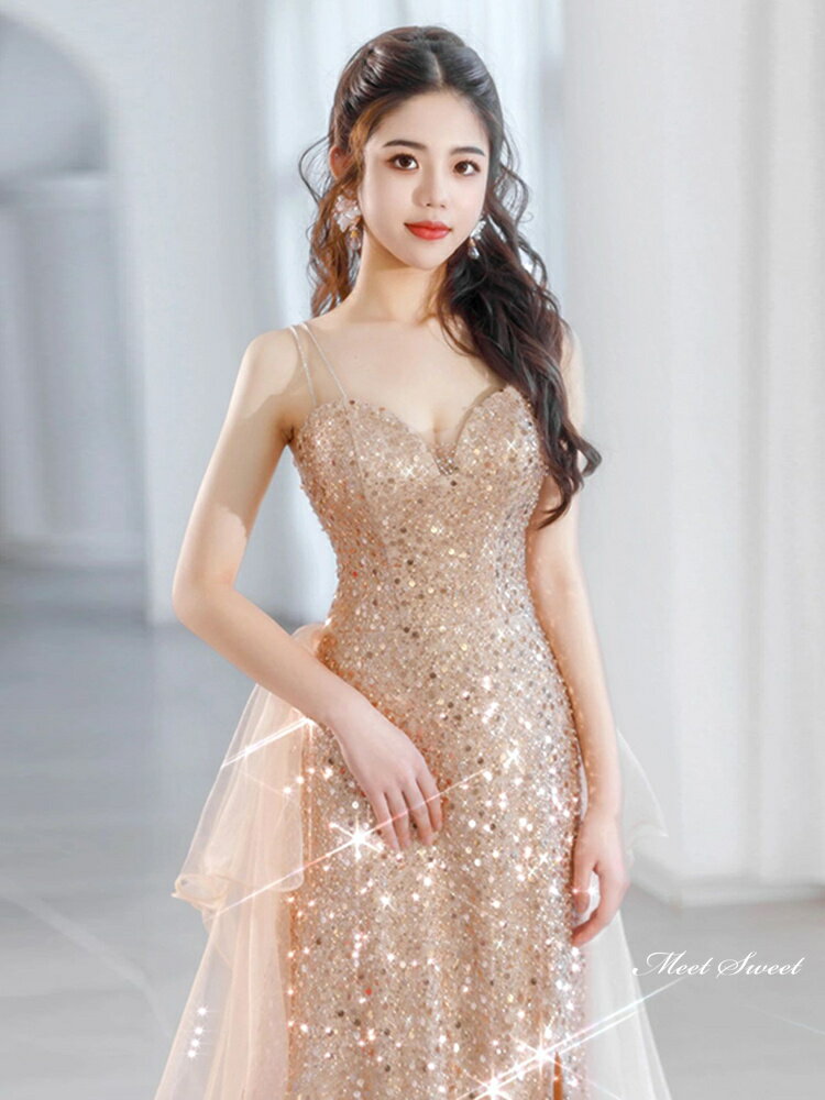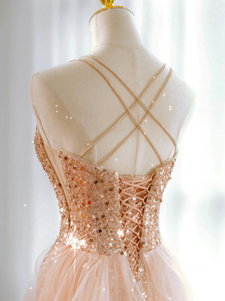カラードレス ロングドレス パーティードレス ピンクゴールド キラキラ ウェディングドレス ウエディングドレス 結婚式 二次会 花嫁 前撮り 演奏会 発表会 スパンコール ノースリーブ 披露宴 ブライダル フォーマルドレス コンサート 舞台 演出 イブニングドレス