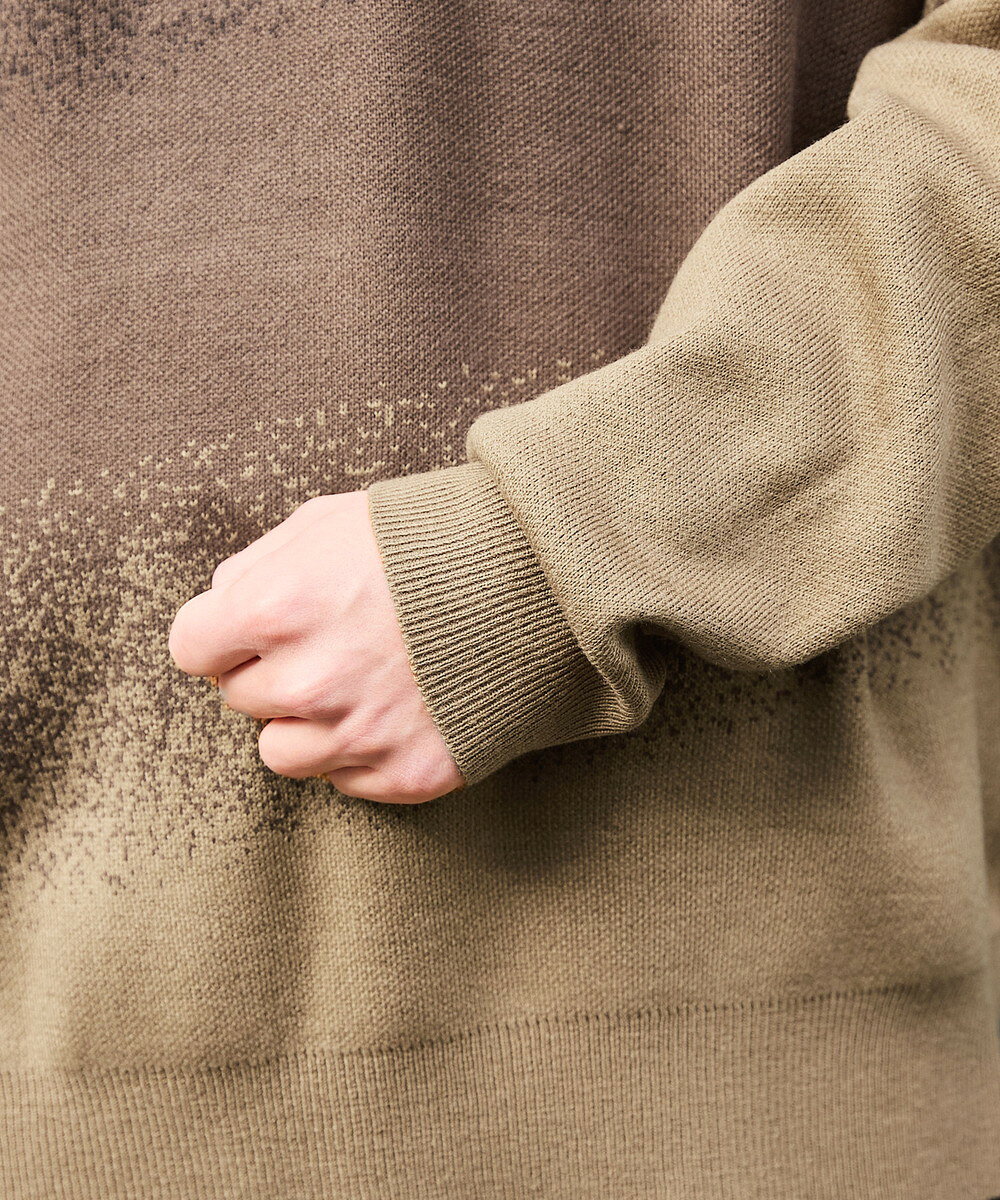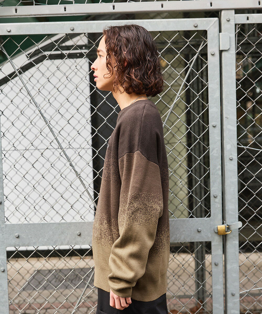 ニット トップス メンズ グラデーション ワンポイント ロゴ ロゴ刺繍 長袖 オーバーサイズ クルーネック ブラック ブラウン S M L XL