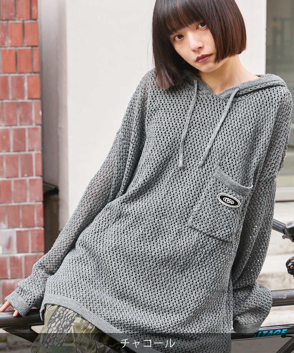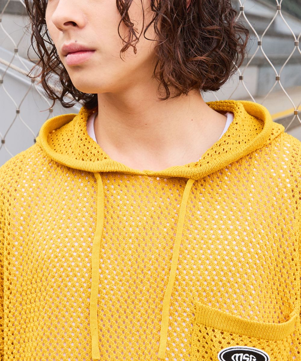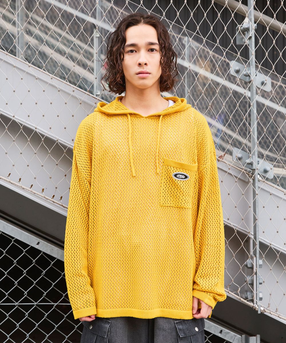 ニット メンズ プルパーカー プルオーバー ニット ブランドロゴ サイドスリット ルーズシルエット ビッグサイズ ドロップショルダー ユニセックス メッシュニット グレー チャコール パープル マスタード ブラック MSG 春 春服 夏 夏服