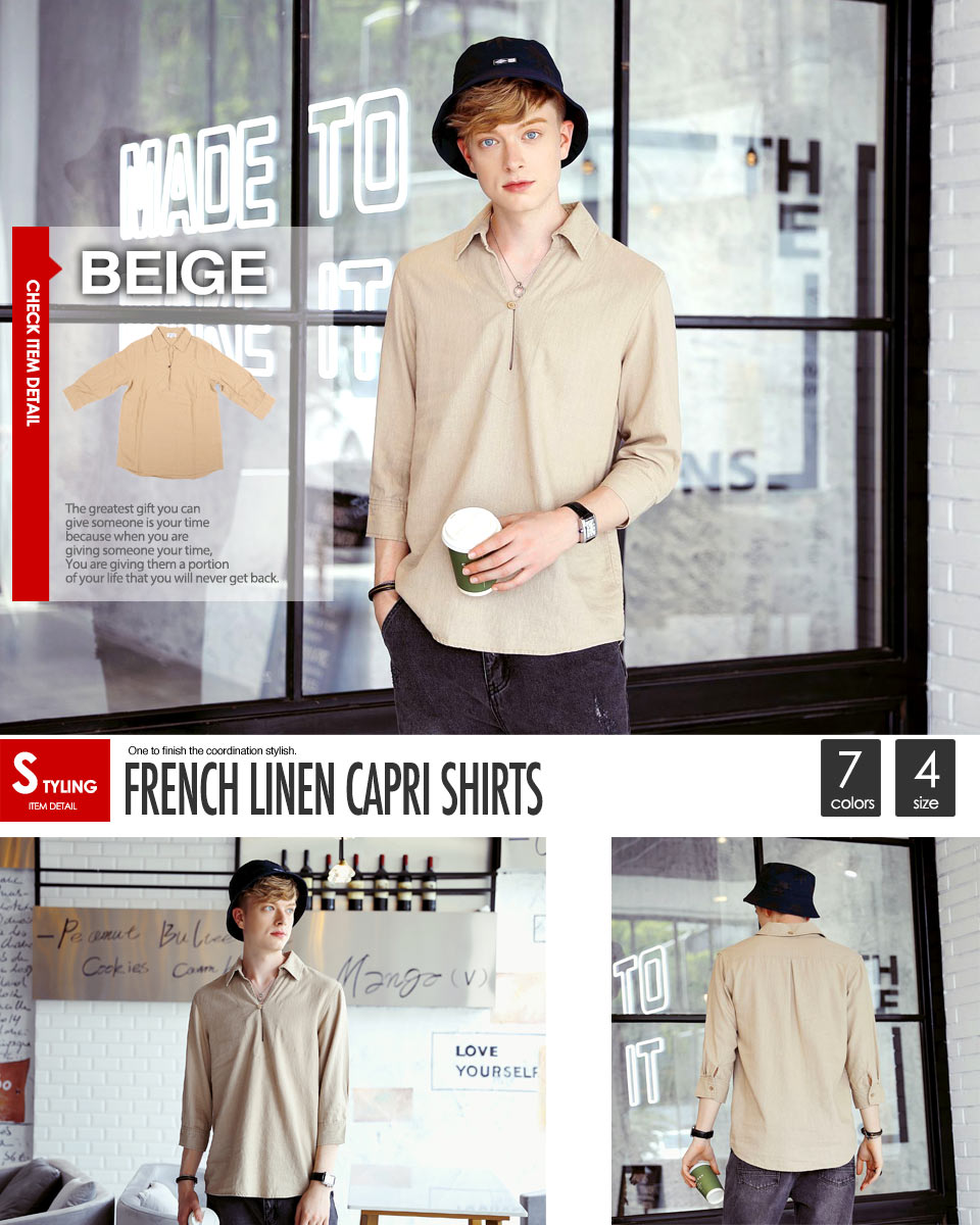 シャツ メンズ カプリシャツ 七分袖 フレンチリネン 綿麻 カジュアルシャツ ストライプ リネン 麻 無地 半袖 白シャツ shirt シャツ シンプル ざっくり きれいめ 夏 綿麻シャツ スタイリッシュ