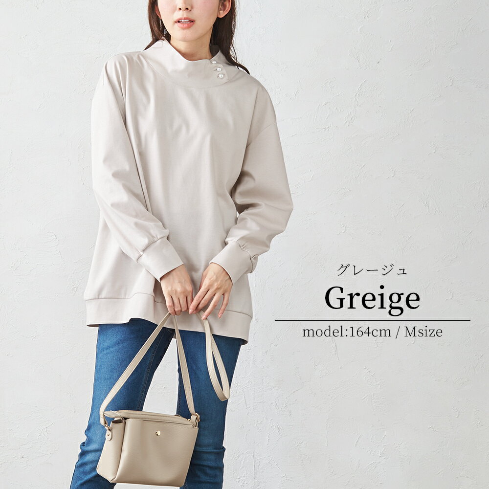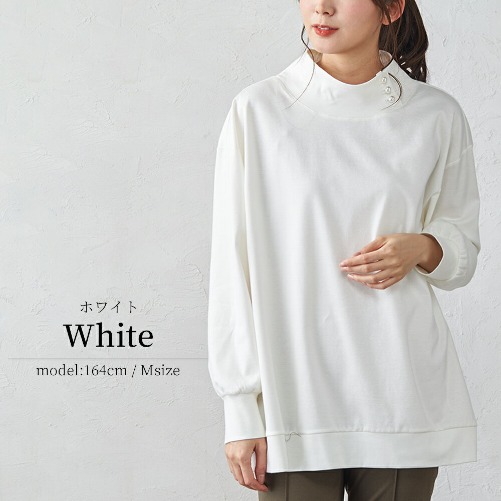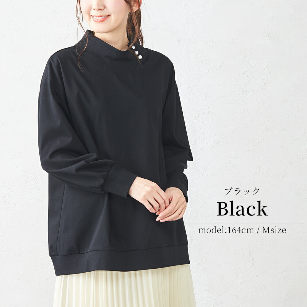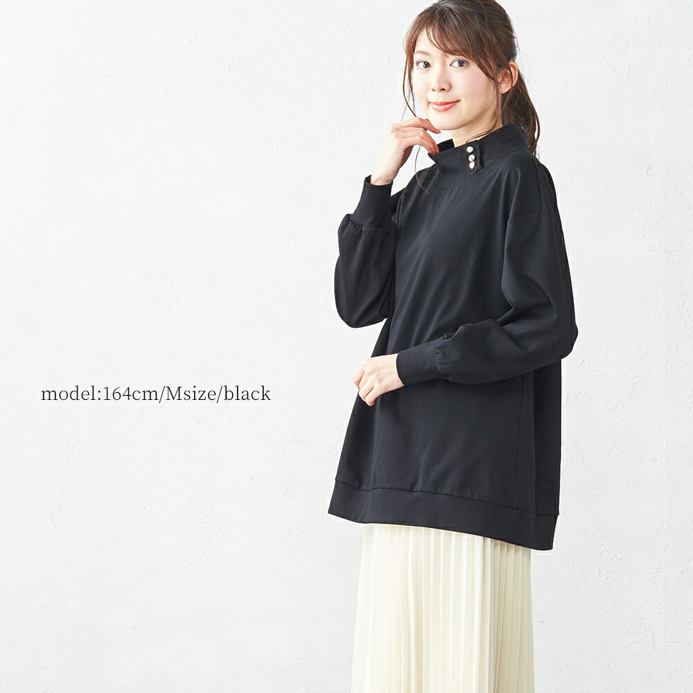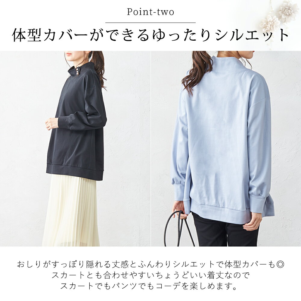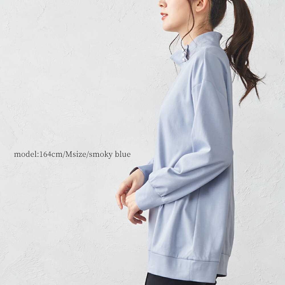 日本製 オーガニックコットン 高見え パール 付き ワンポイント 衿付き ポンチトレーナー プルオーバー 長袖 綿100% 30代 40代 50代 60代 ファッション カジュアル 大人可愛い スウェット 大きめ