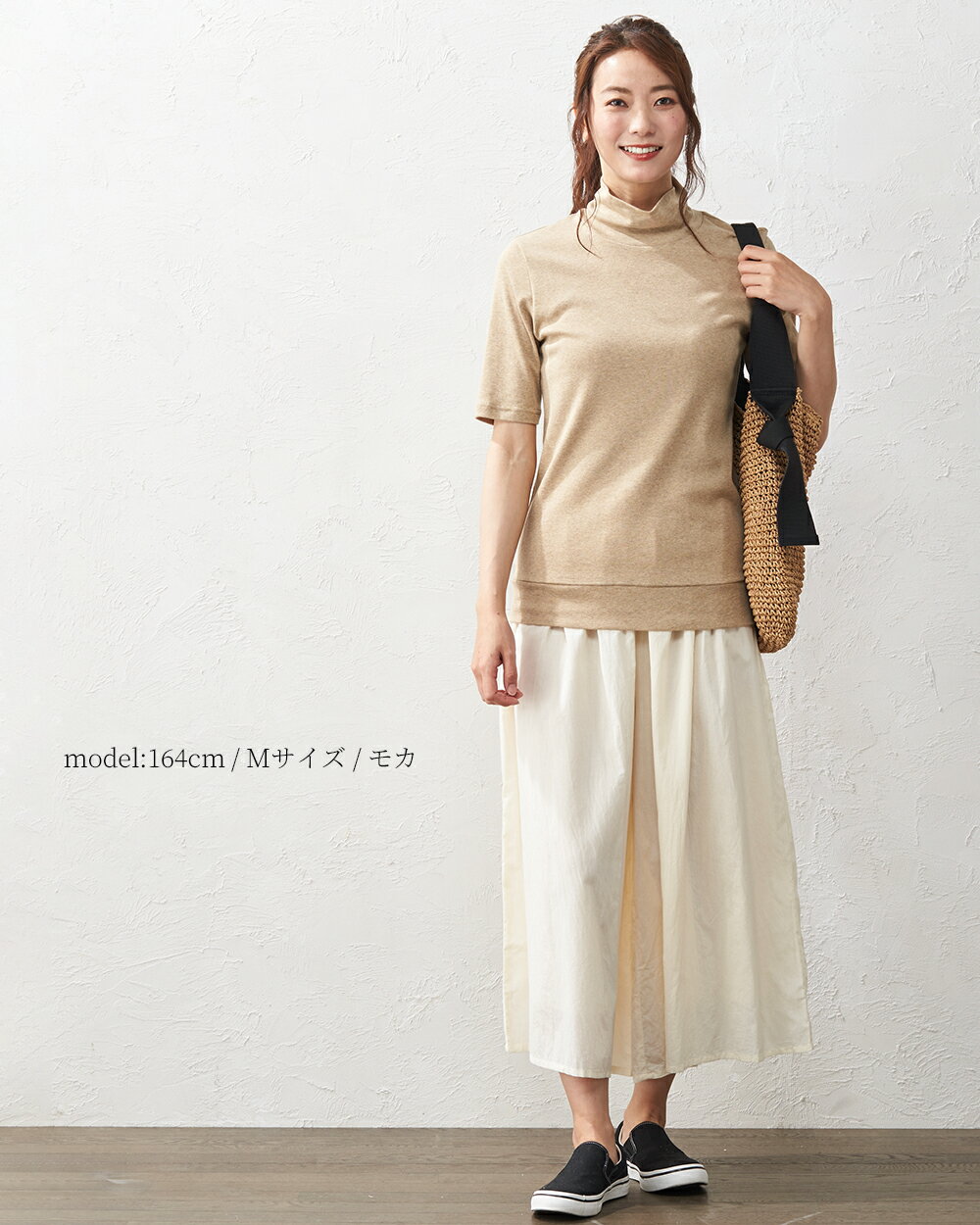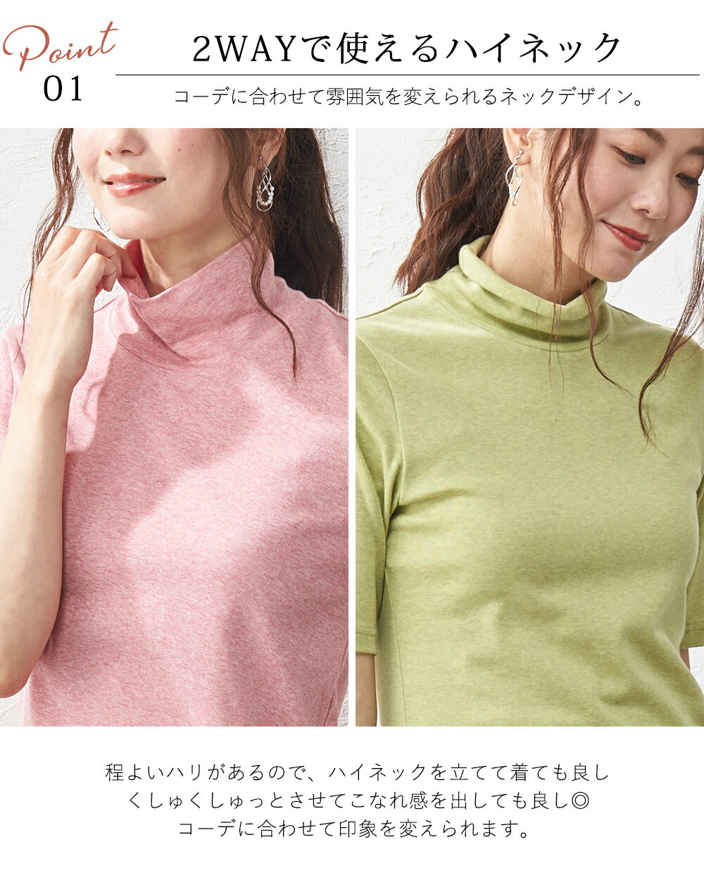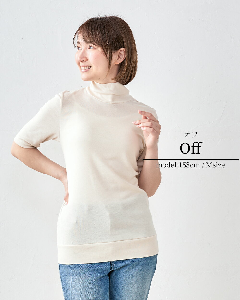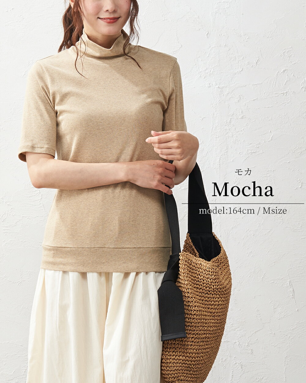 日本製 オーガニックコットン フライス ハイネック モックネック レディース トップス カットソー Tシャツ インナー 半袖 5分袖 春夏 綿 コットン 二の腕 体型カバー 洗える きれいめ ベーシック オフィス 事務服