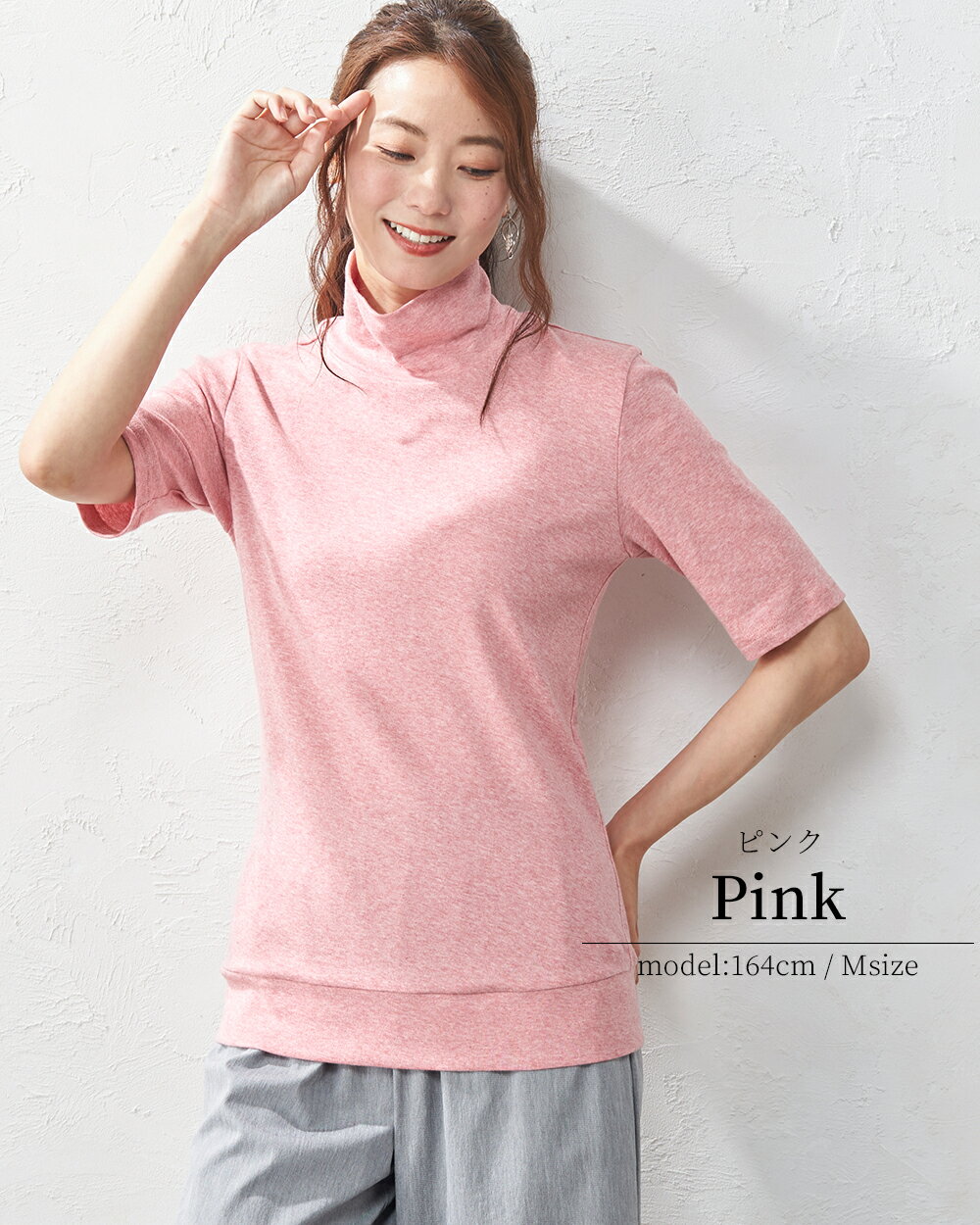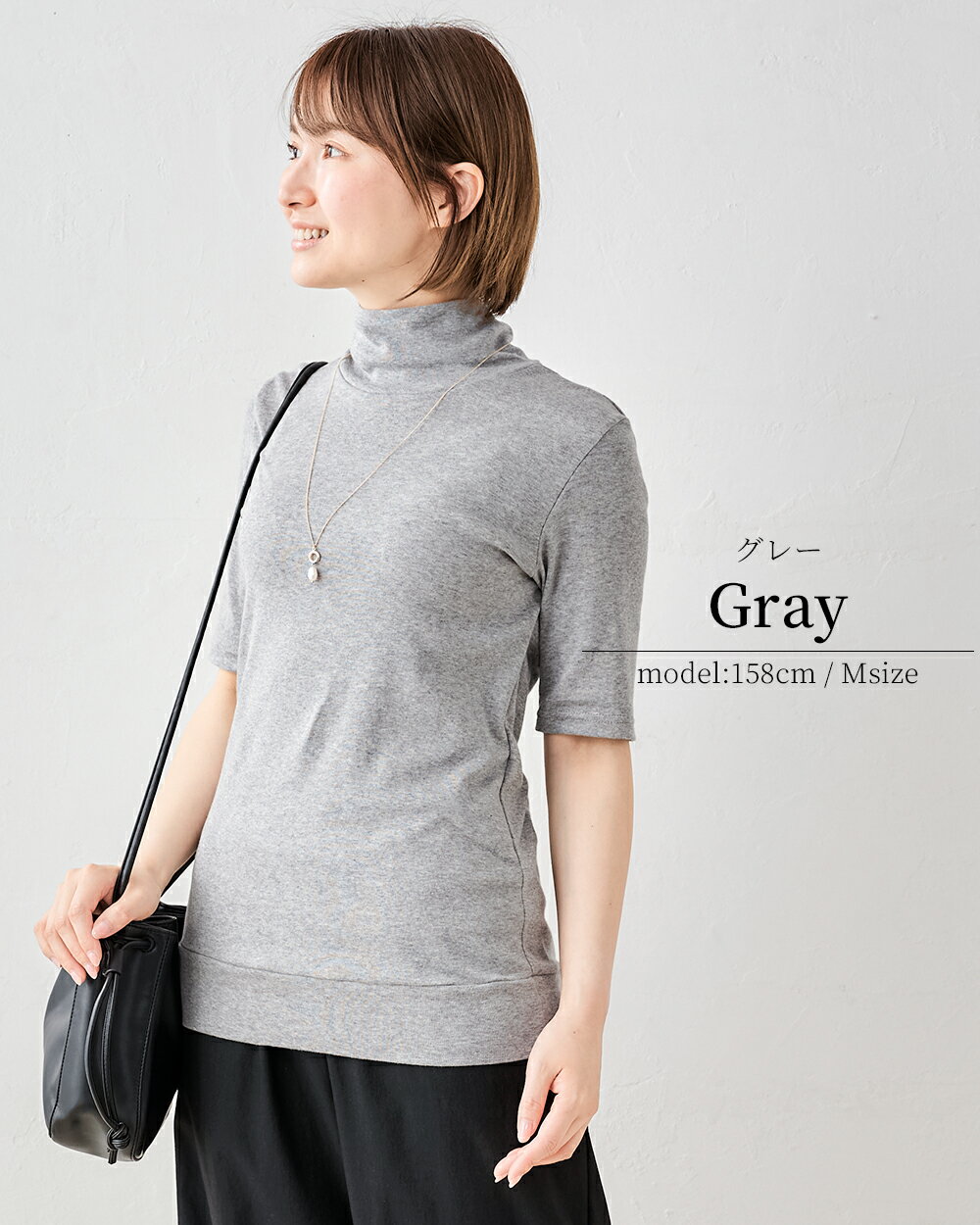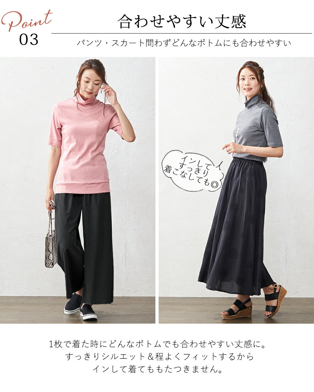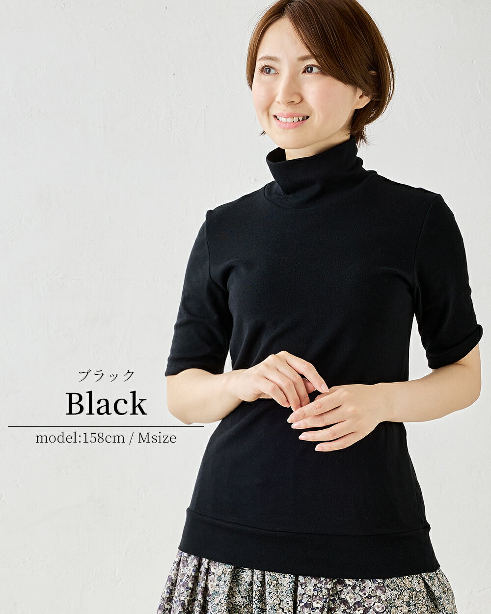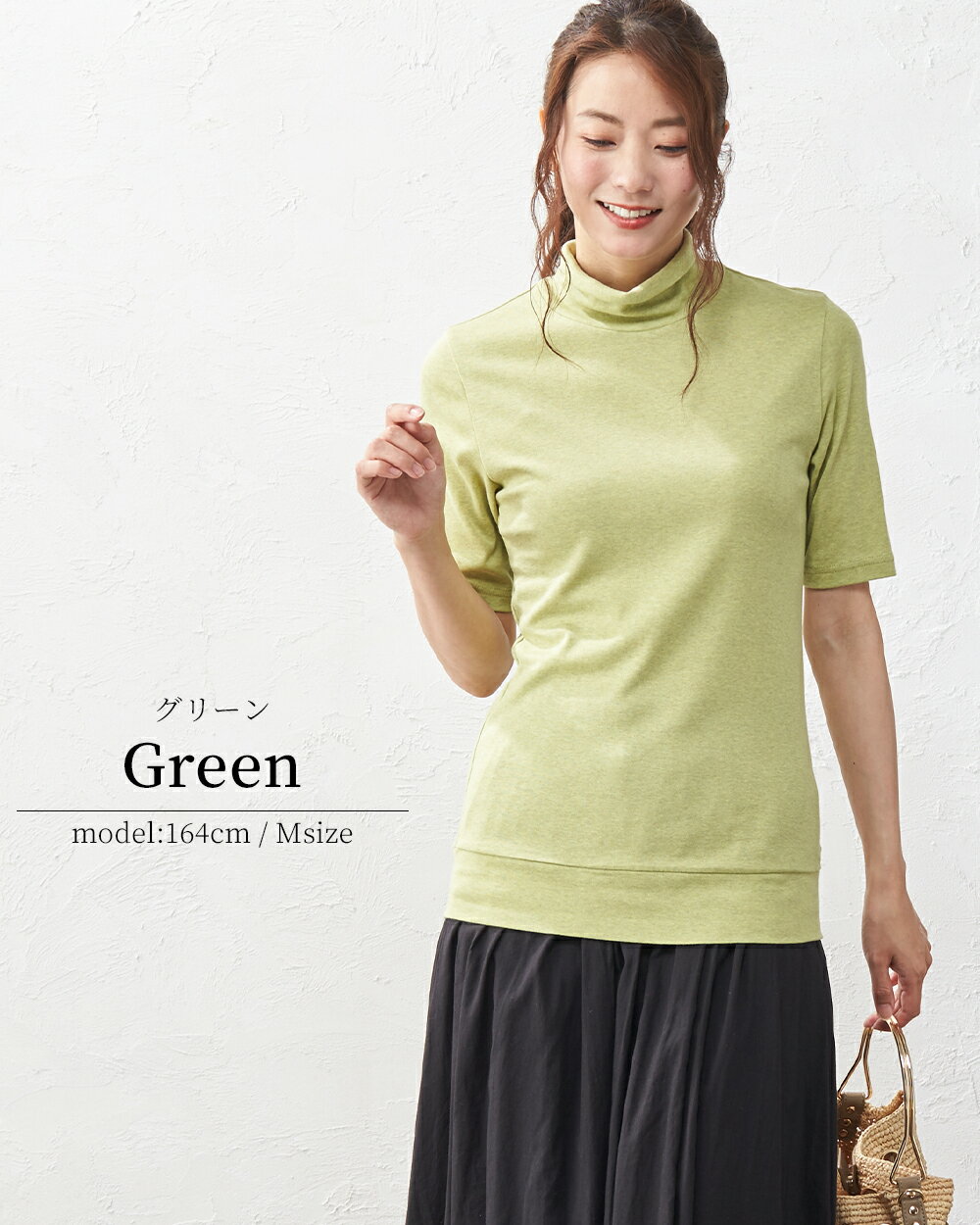 日本製 オーガニックコットン フライス ハイネック モックネック レディース トップス カットソー Tシャツ インナー 半袖 5分袖 春夏 綿 コットン 二の腕 体型カバー 洗える きれいめ ベーシック オフィス 事務服