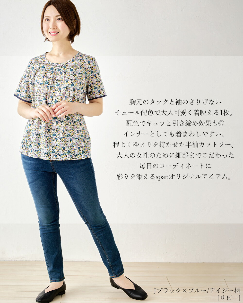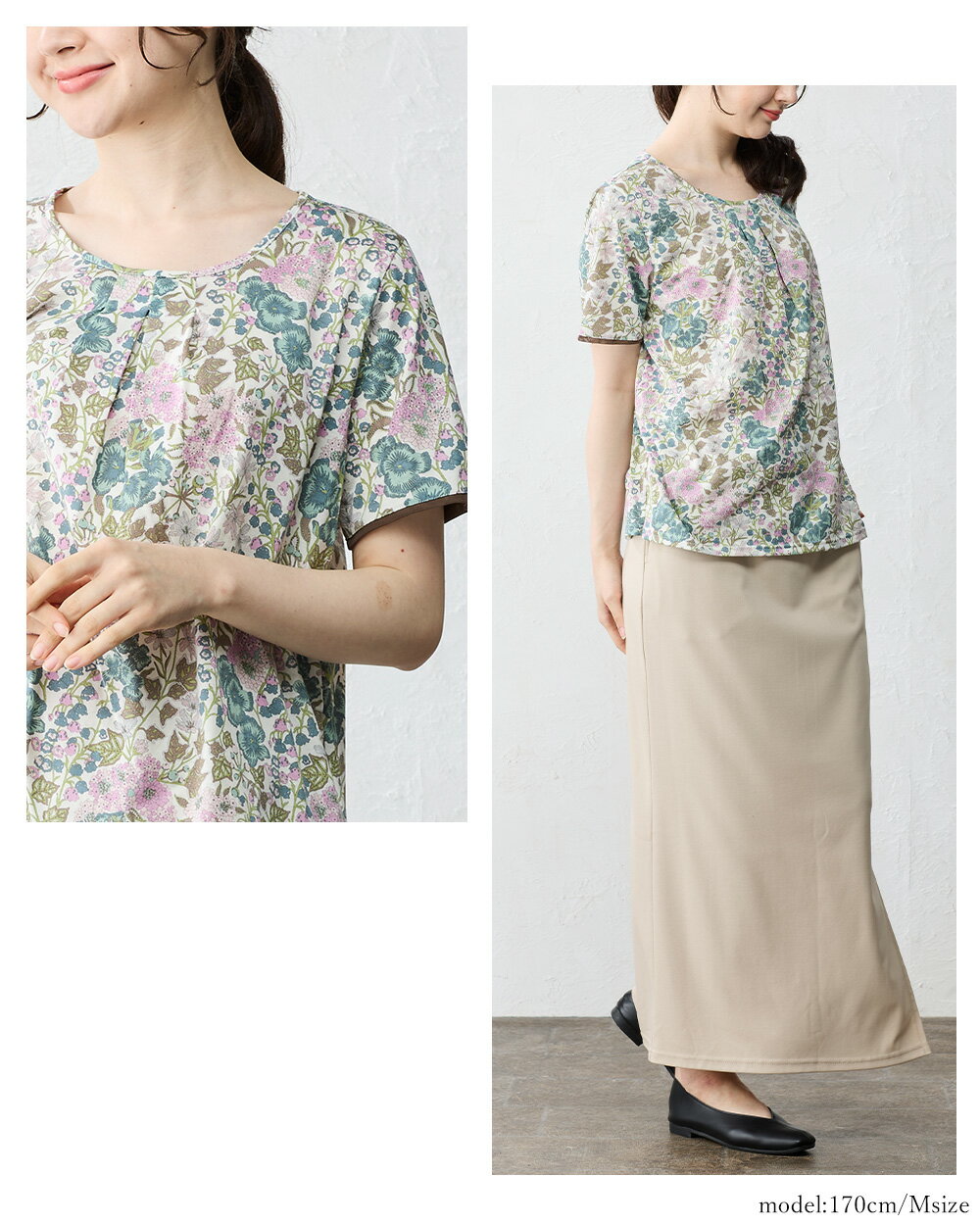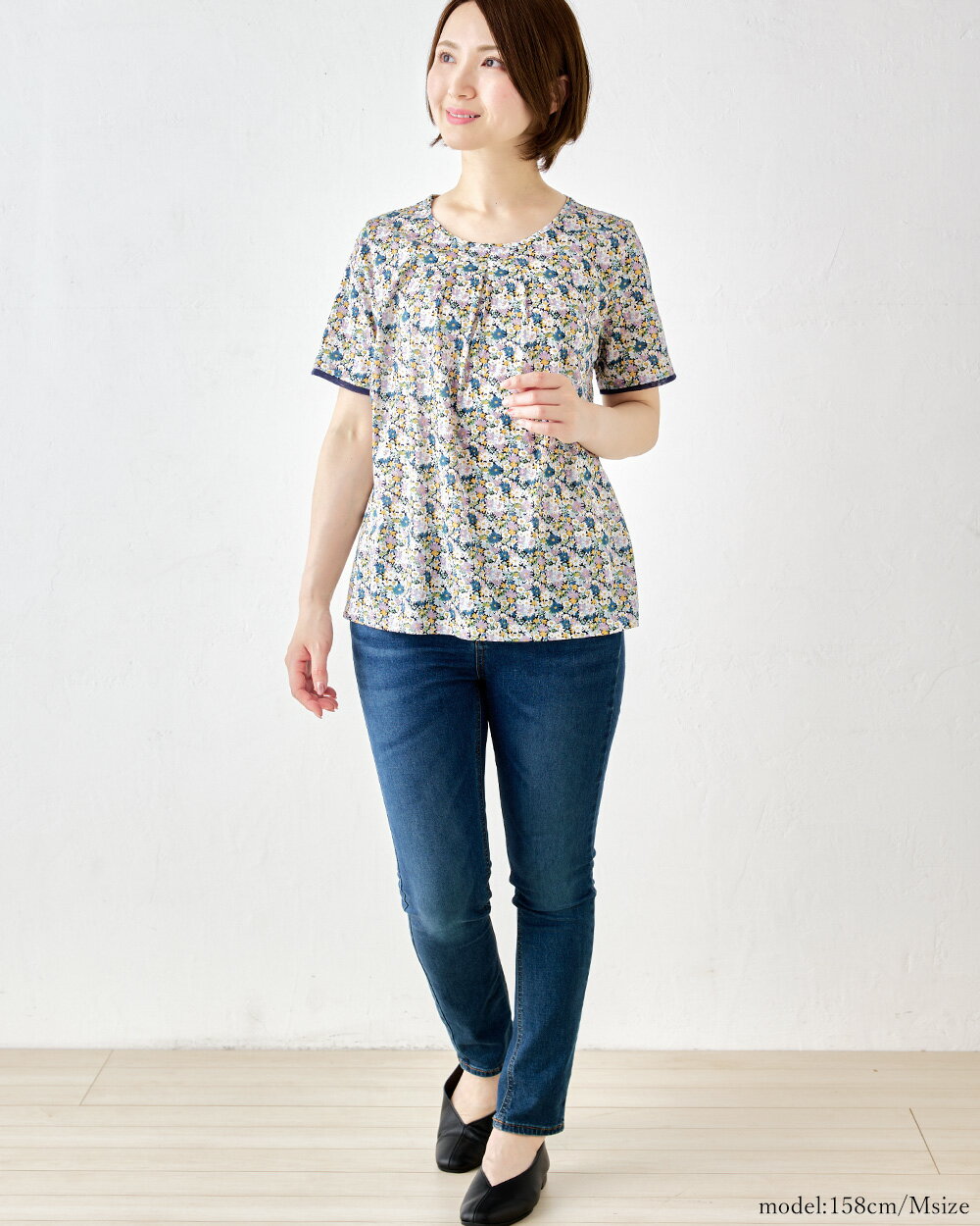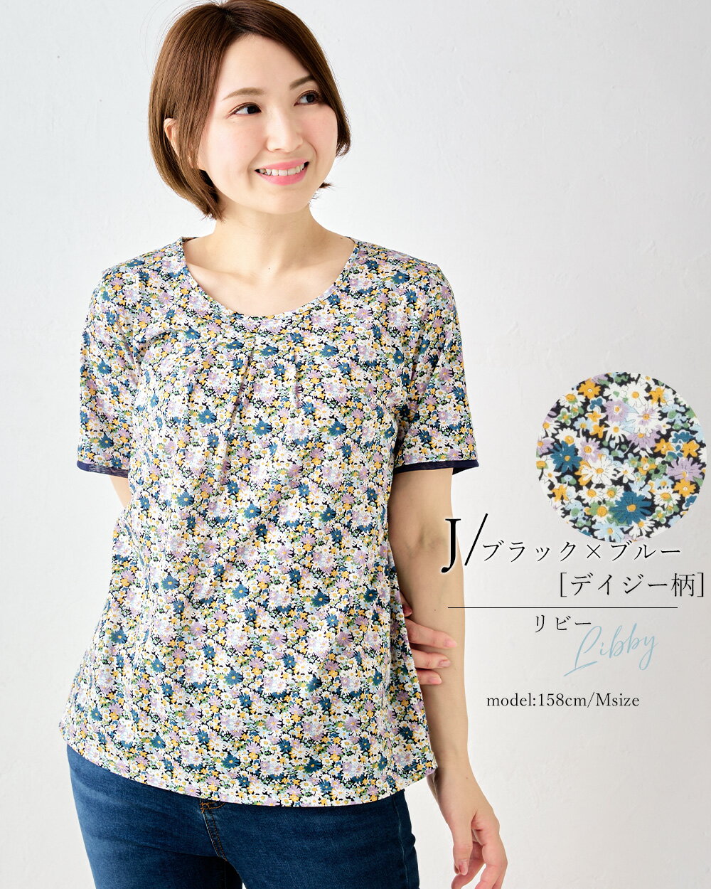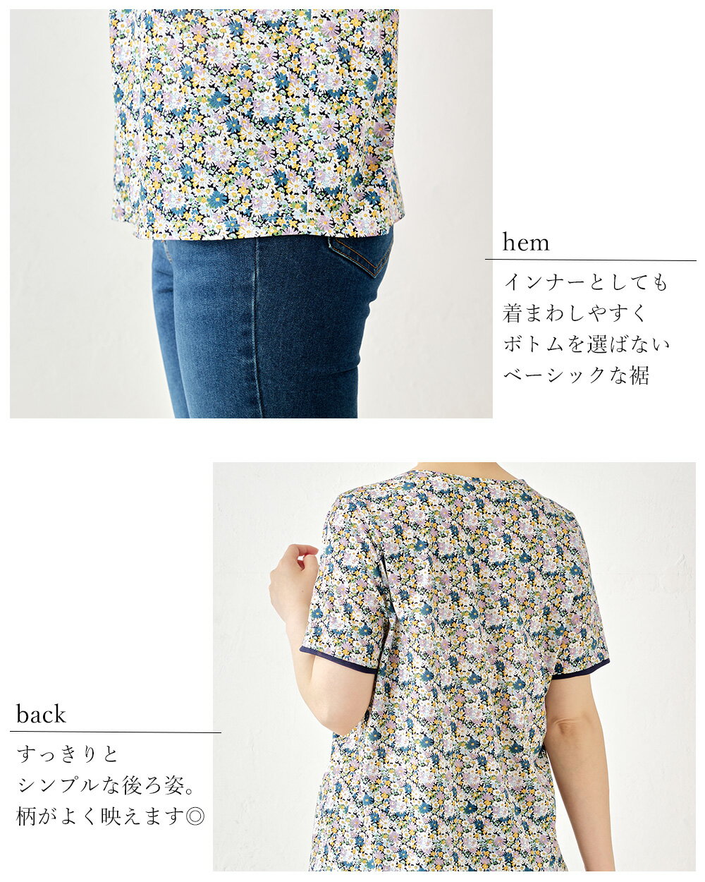 リバティ LIBERTY チュール 切替 カットソー 日本製 花柄 フラワー 草花 ボタニカル プリント 綿100% コットン 綿 Tシャツ プルオーバー 半袖 ファッション レディース お出かけ 春 夏 トップス インナー ストレッチ カジュアル