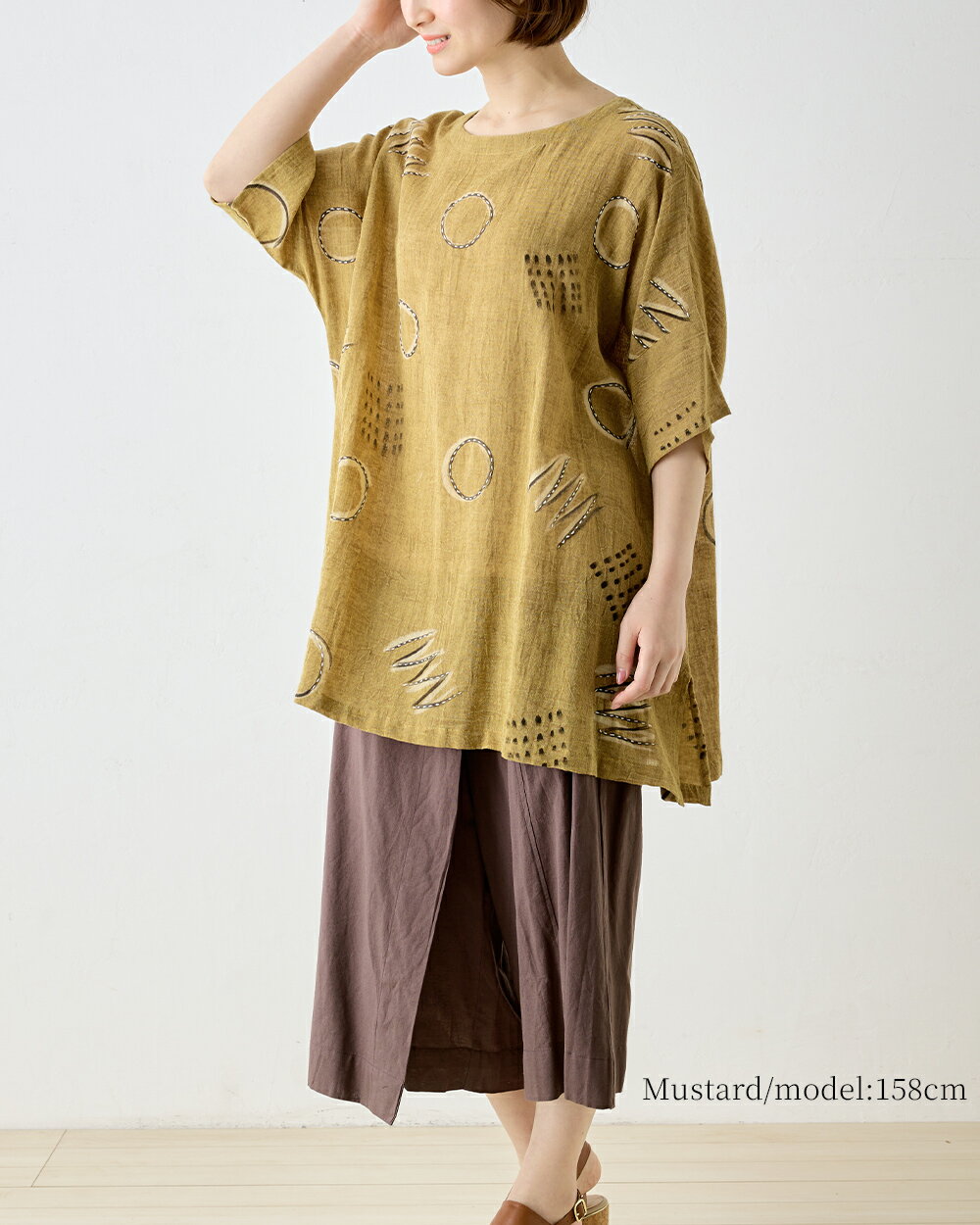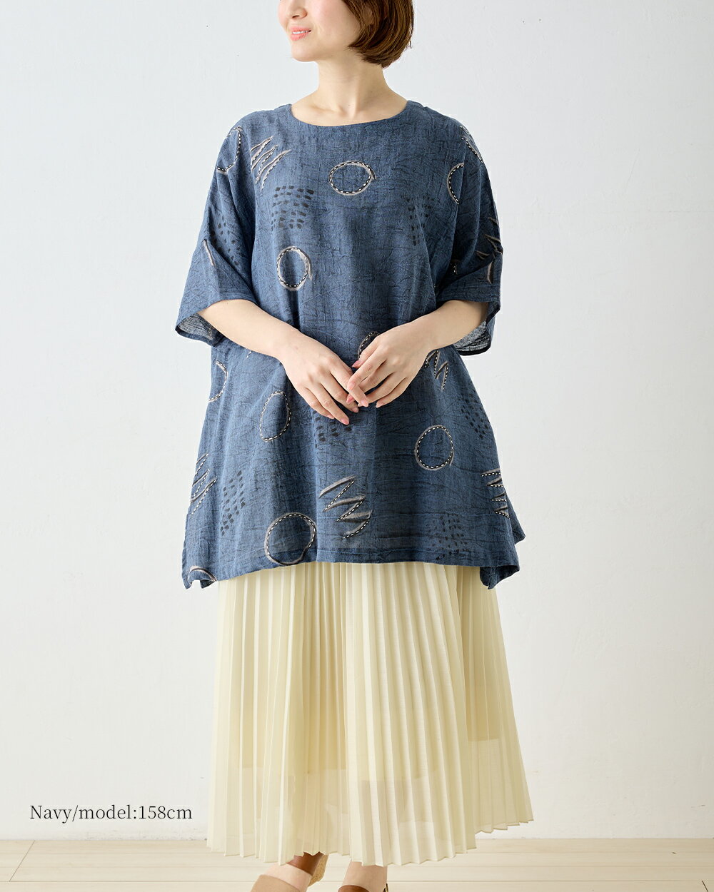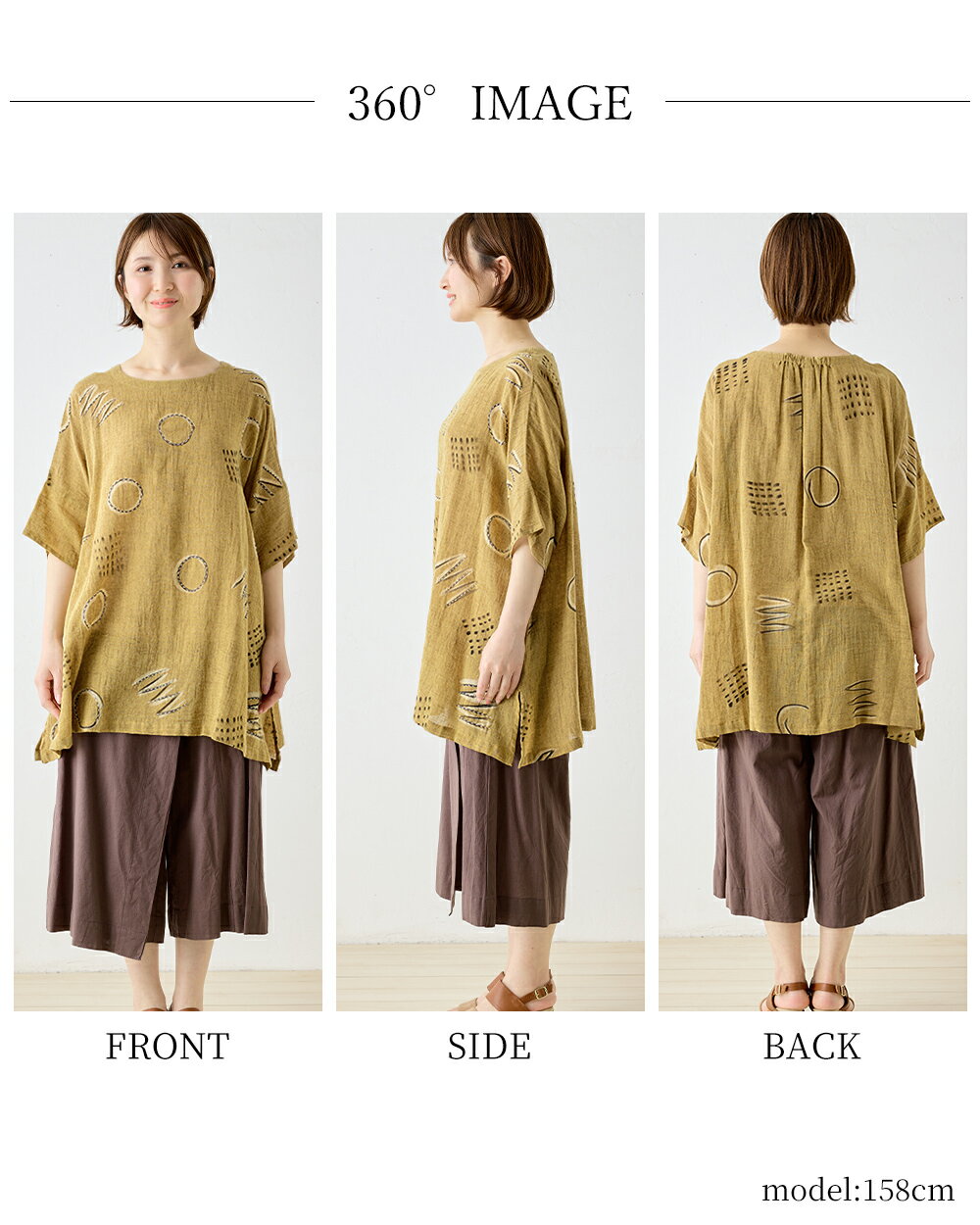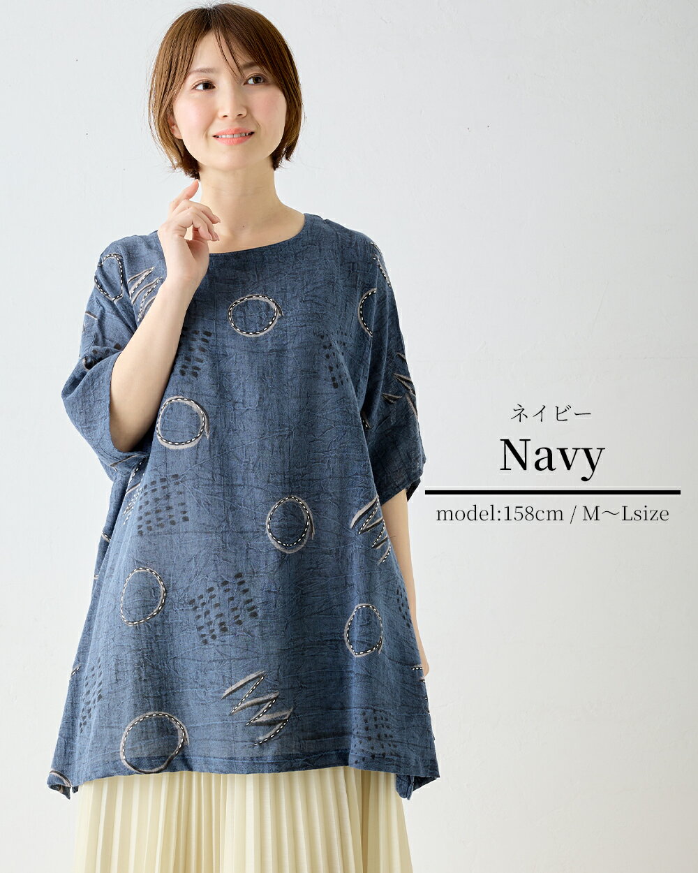 インド綿 チュニック レディース 七分袖 綿麻 刺繍 アシッドウォッシュ スノーウォッシュ コットンリネン M~L ゆったりシルエット 体型カバー 大人可愛い 春夏 快適 涼しい