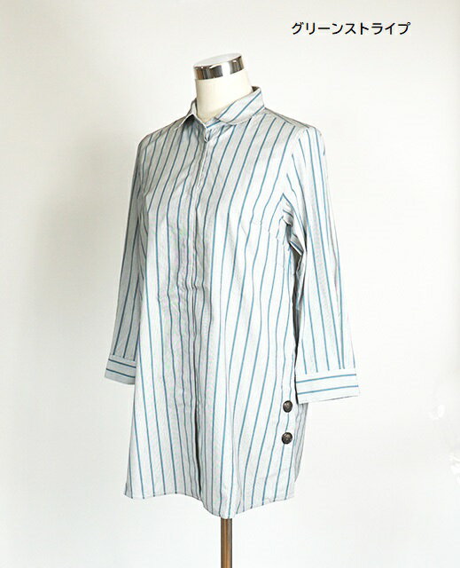 高級感のあるハリと光沢感 ボタンデザインUVカットコットンミックス ストレッチシャツチュニック(M)グリーンストライプ