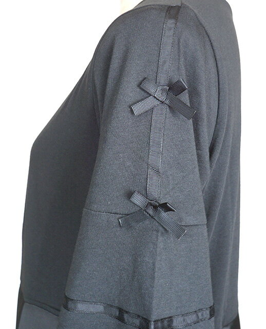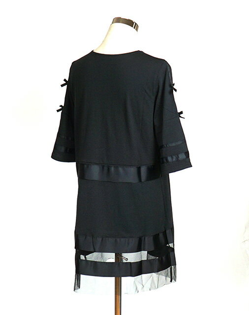 フリルレース&リボン グログラン使いリボンカットソーチュニック(M・L)ブラック・チャコール2色