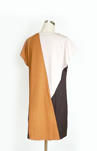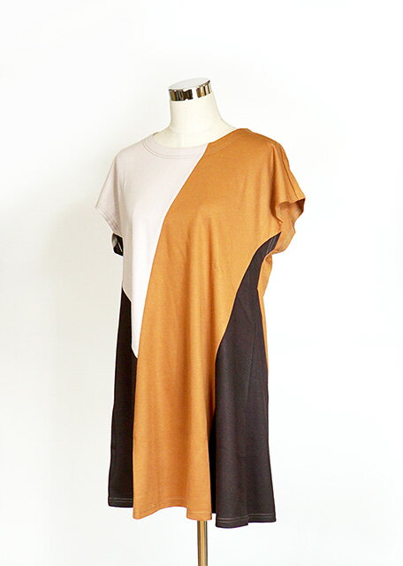 残りわずか!配色切替デザインチュニック(M) キャメル系 すっきり細見え【秋冬】