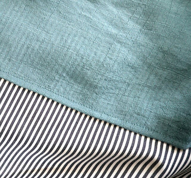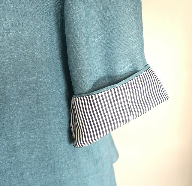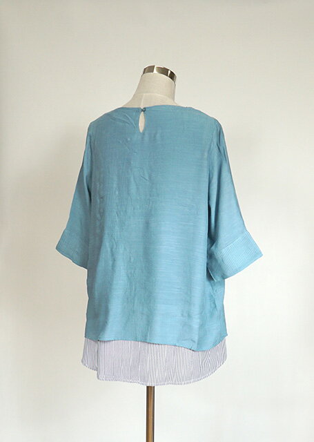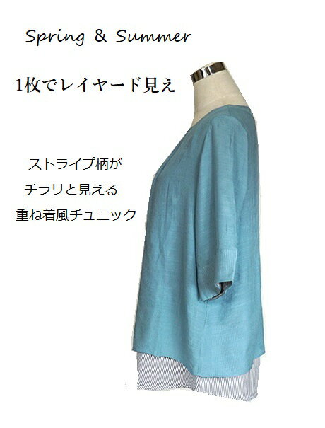 春夏もの入荷!重ね着風デザイン スラブ素材 ストライプ重ねチュニック(M・L)エメラルドグリーン