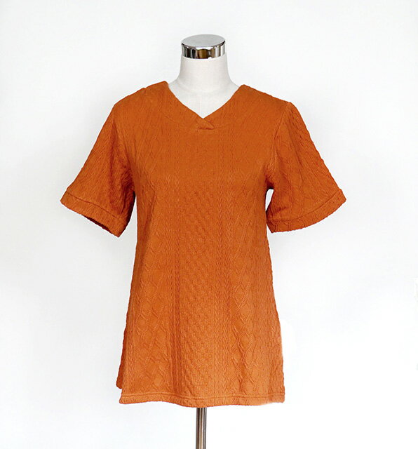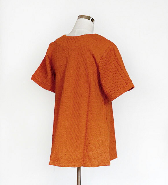 表情豊かなケーブル柄 綿100% ジャカード素材デザインチュニック Vネック 半袖(M 3L)オレンジ