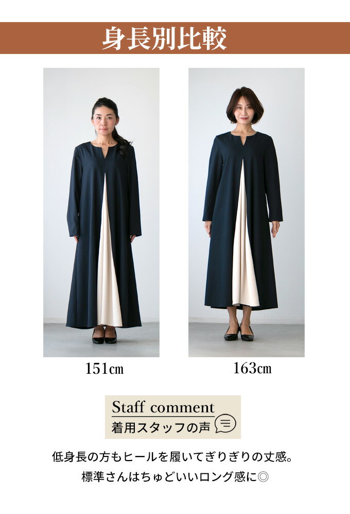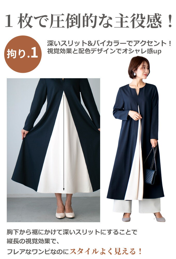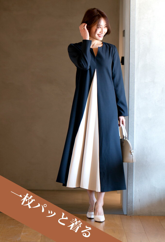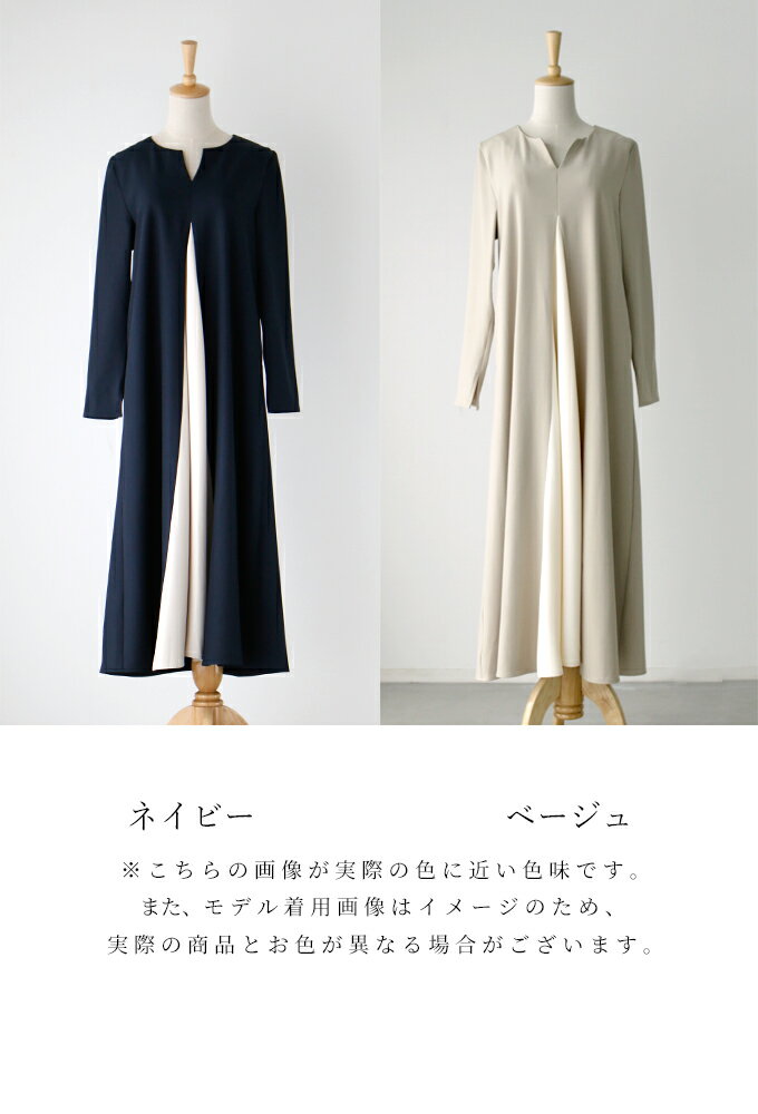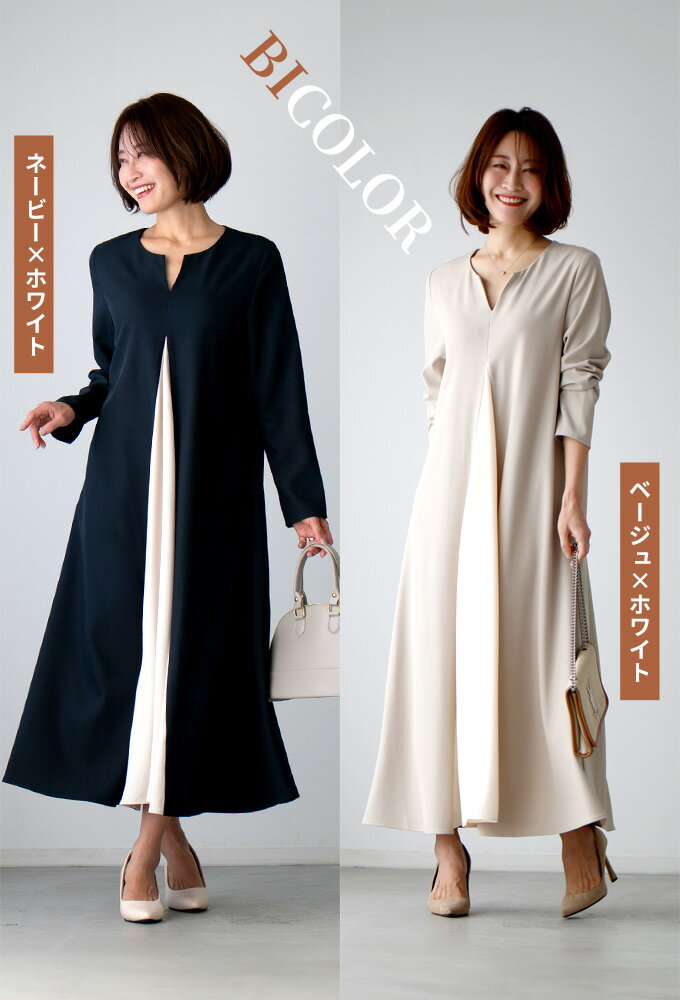 ワンピース ロングワンピース Aライン バイカラー 配色 スリット Vネック フレア レイヤード ジッパー ネイビー ベージュ Ehre style スタイル エーレスタイル【F240413】