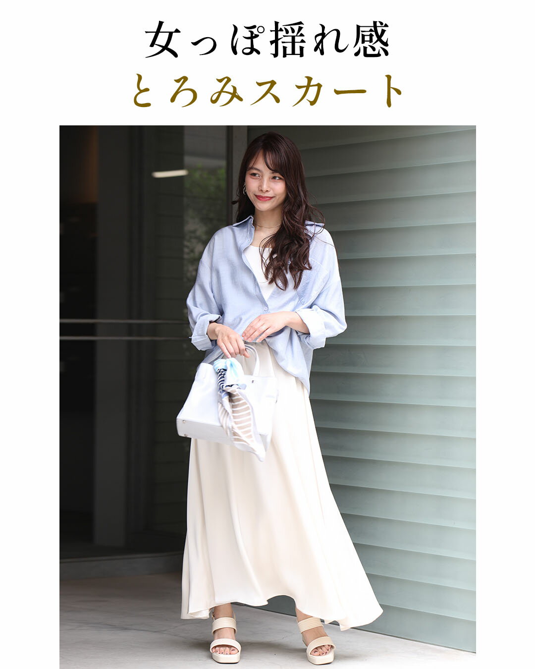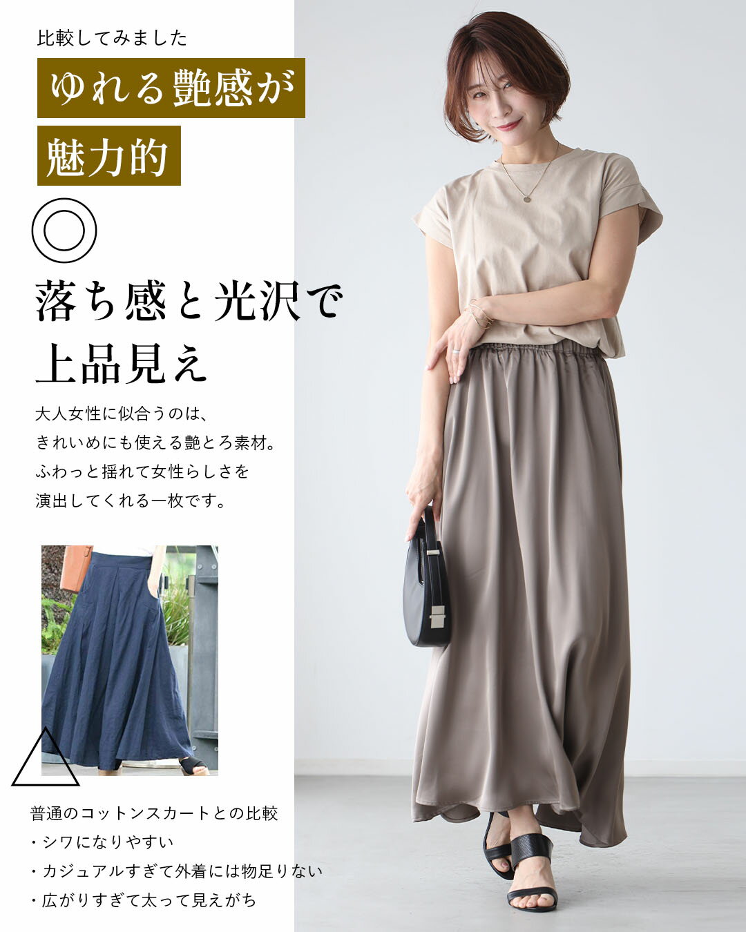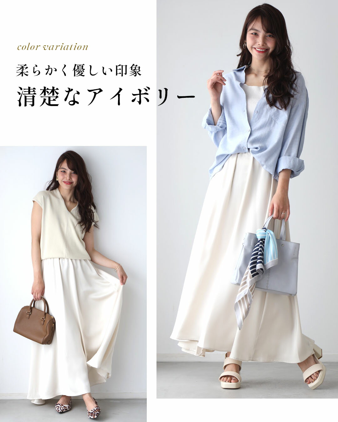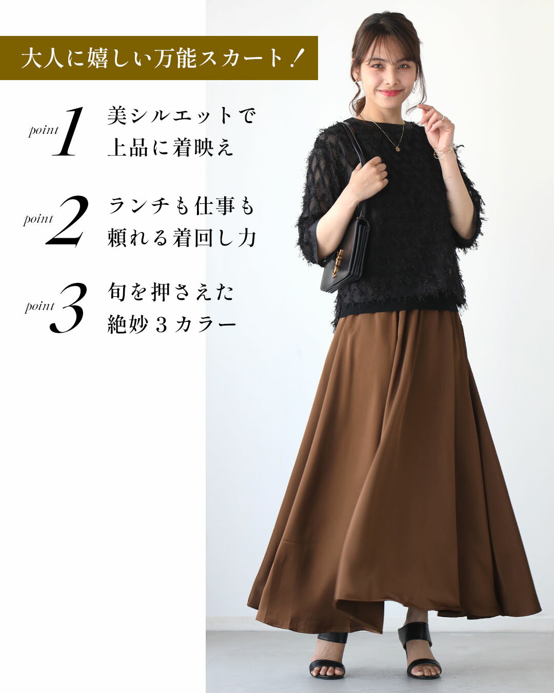 艶スカート フレアロングスカート スカート フレアスカート ロングスカート とろみ 落ち感 光沢 きれいめ 総ゴム ブラウン アイボリー ベージュ brown ivory beige 茶 白 オールシーズン フリーサイズ レディース ファッションEhre style スタイル エーレスタイル【F250615】
