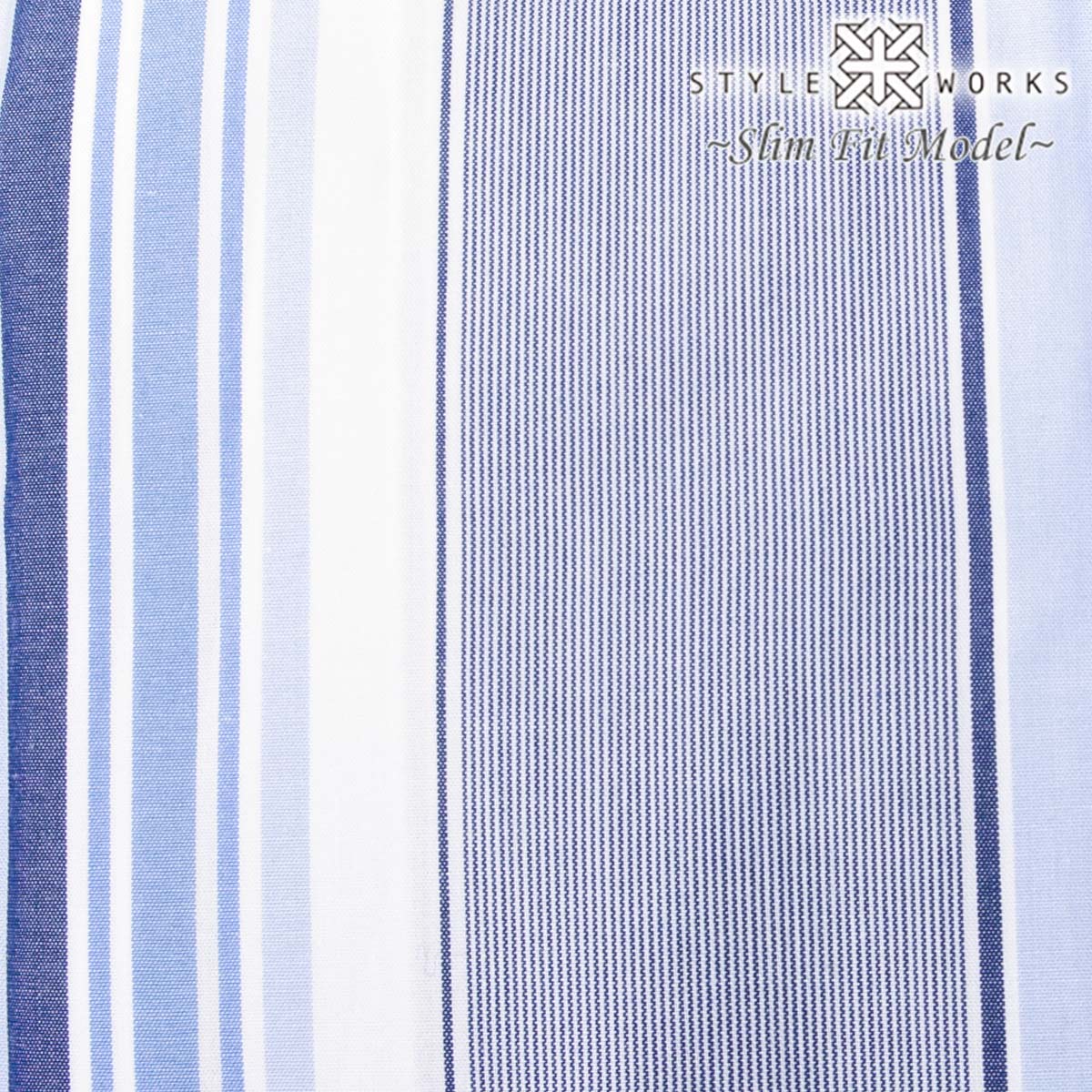 国産長袖 綿100% ドレスシャツ スリムフィット カッタウェイワイドカラー イレギュラーストライプ ブルー ネイビー 2503SS 50par