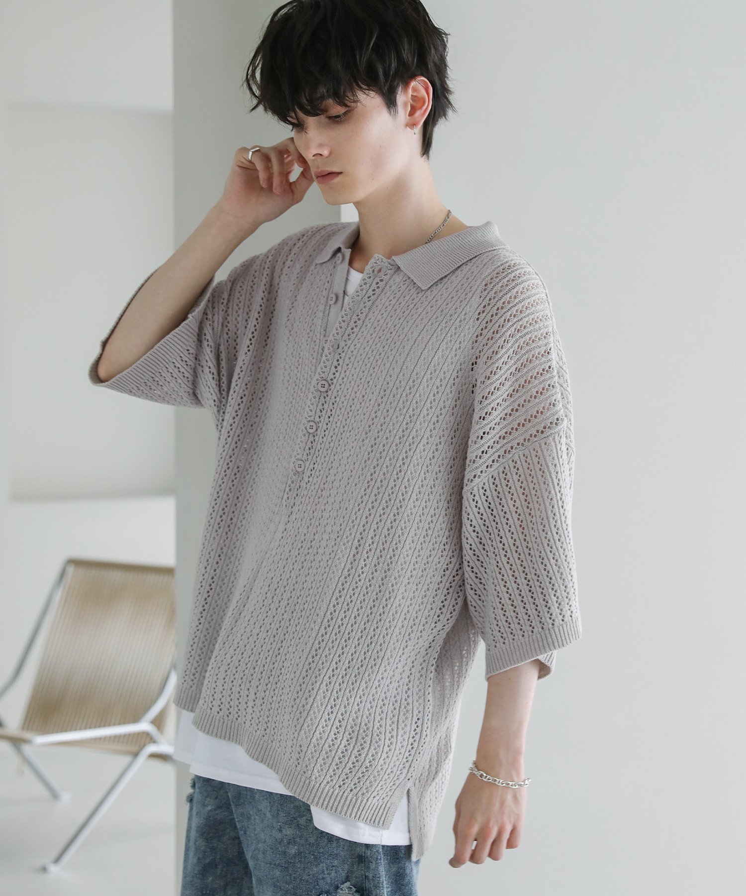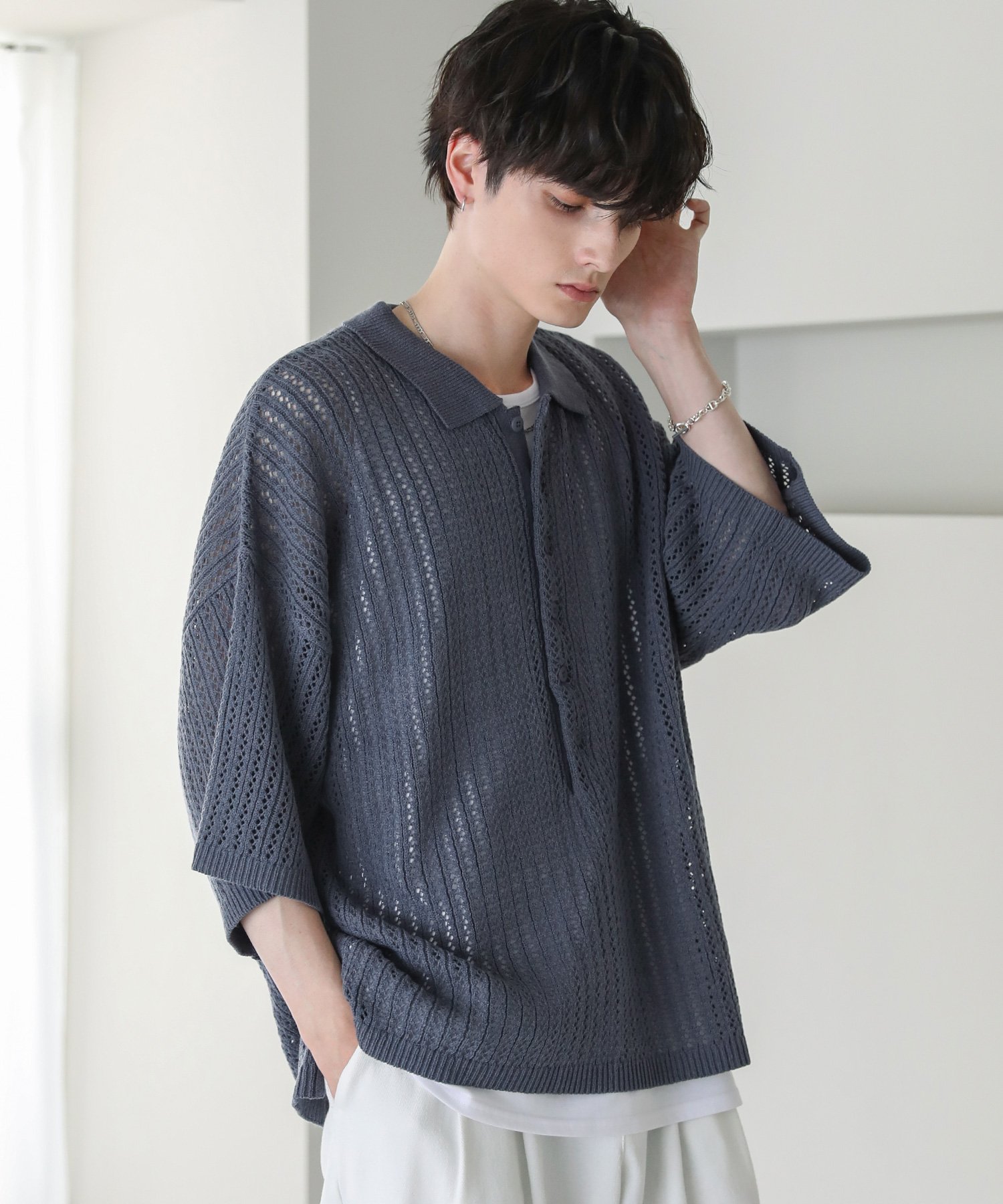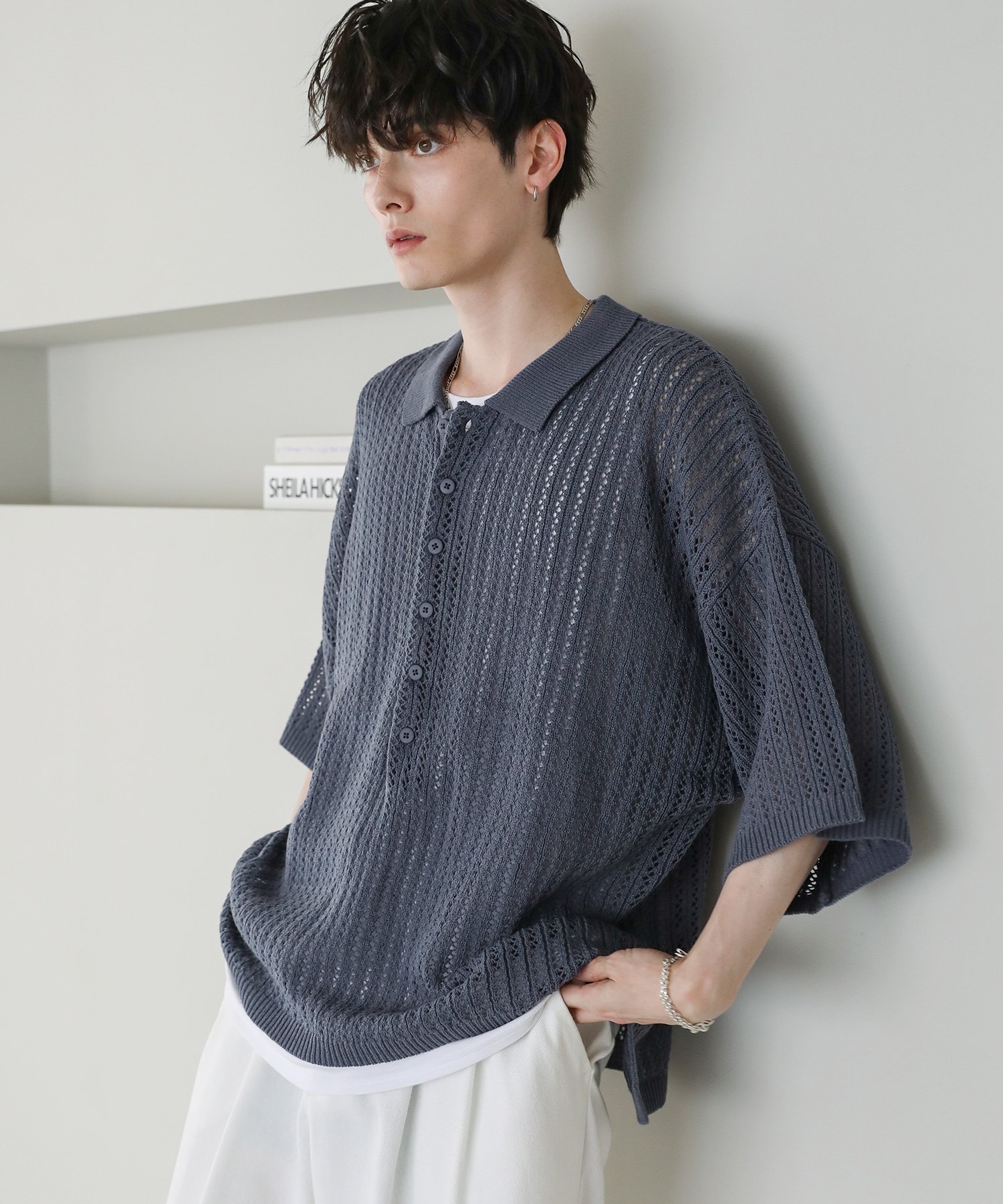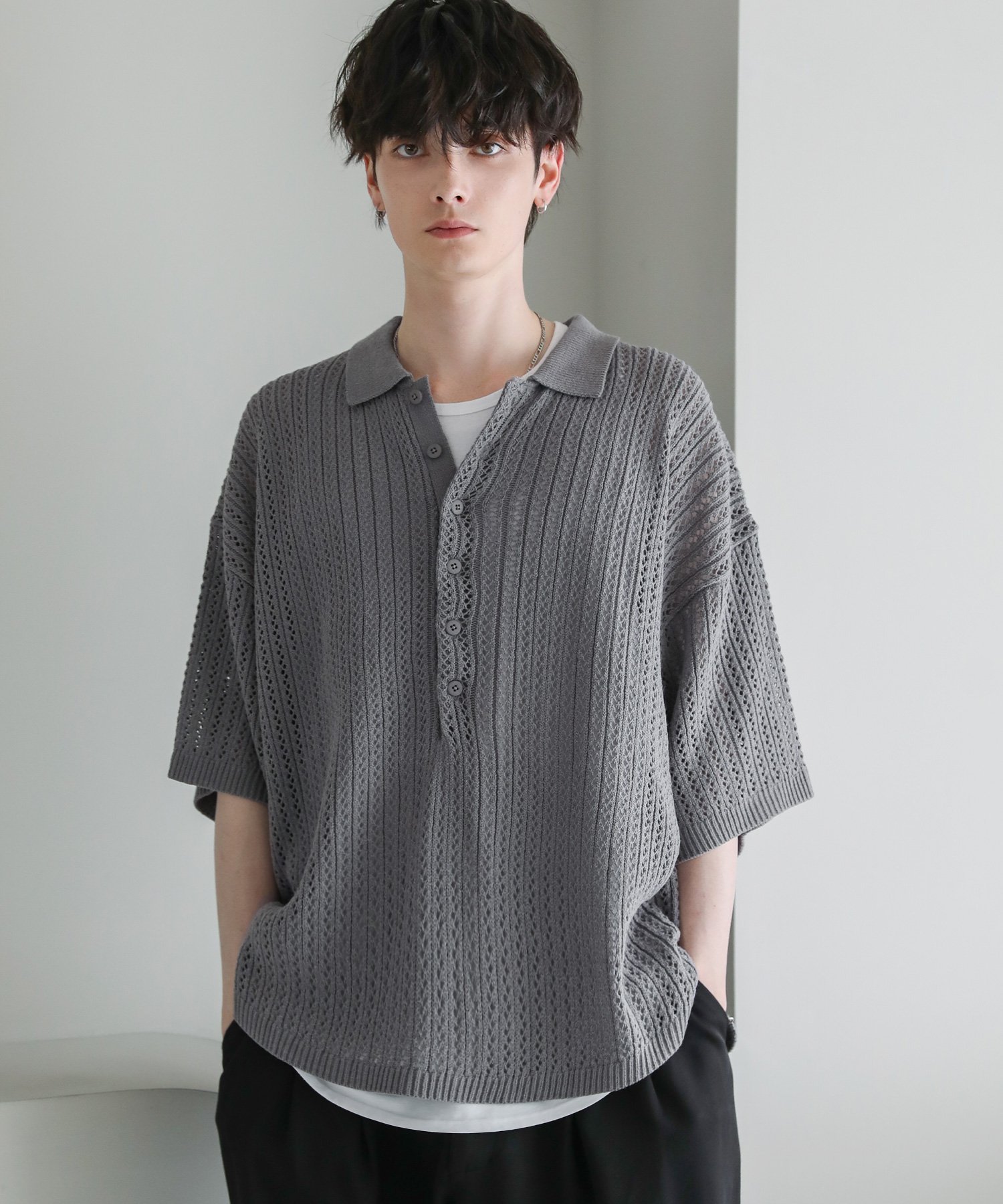 ASTRONOMY オーバーサイズ透かし編み半袖ハーフボタンニットシャツ カジュアル トップス シャツ・ブラウス グレー ブルー ブラック【送料無料】