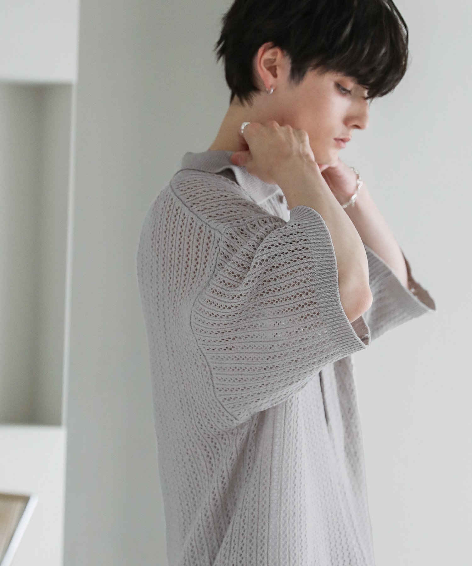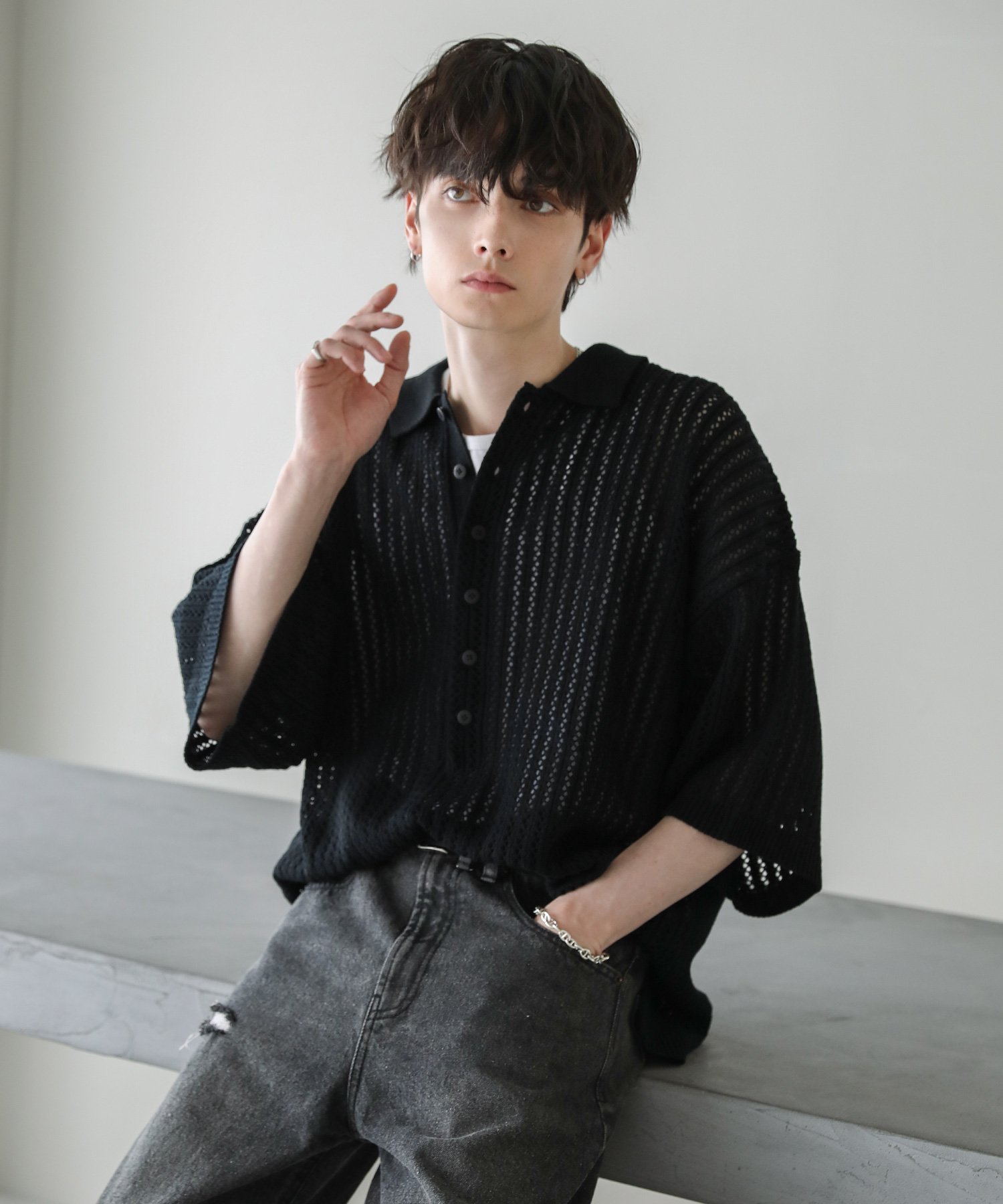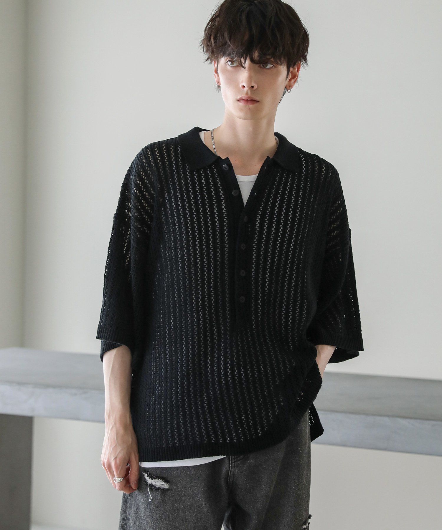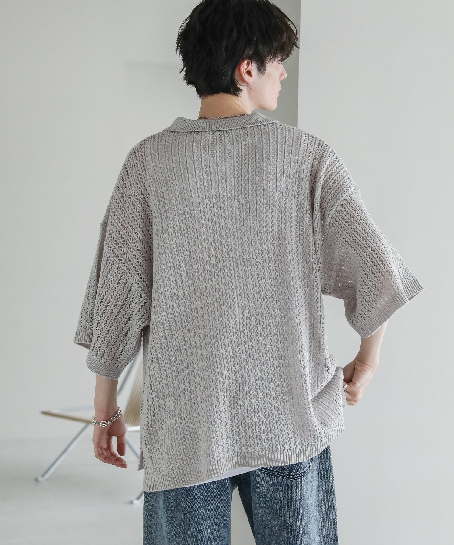 ASTRONOMY オーバーサイズ透かし編み半袖ハーフボタンニットシャツ カジュアル トップス シャツ・ブラウス グレー ブルー ブラック【送料無料】