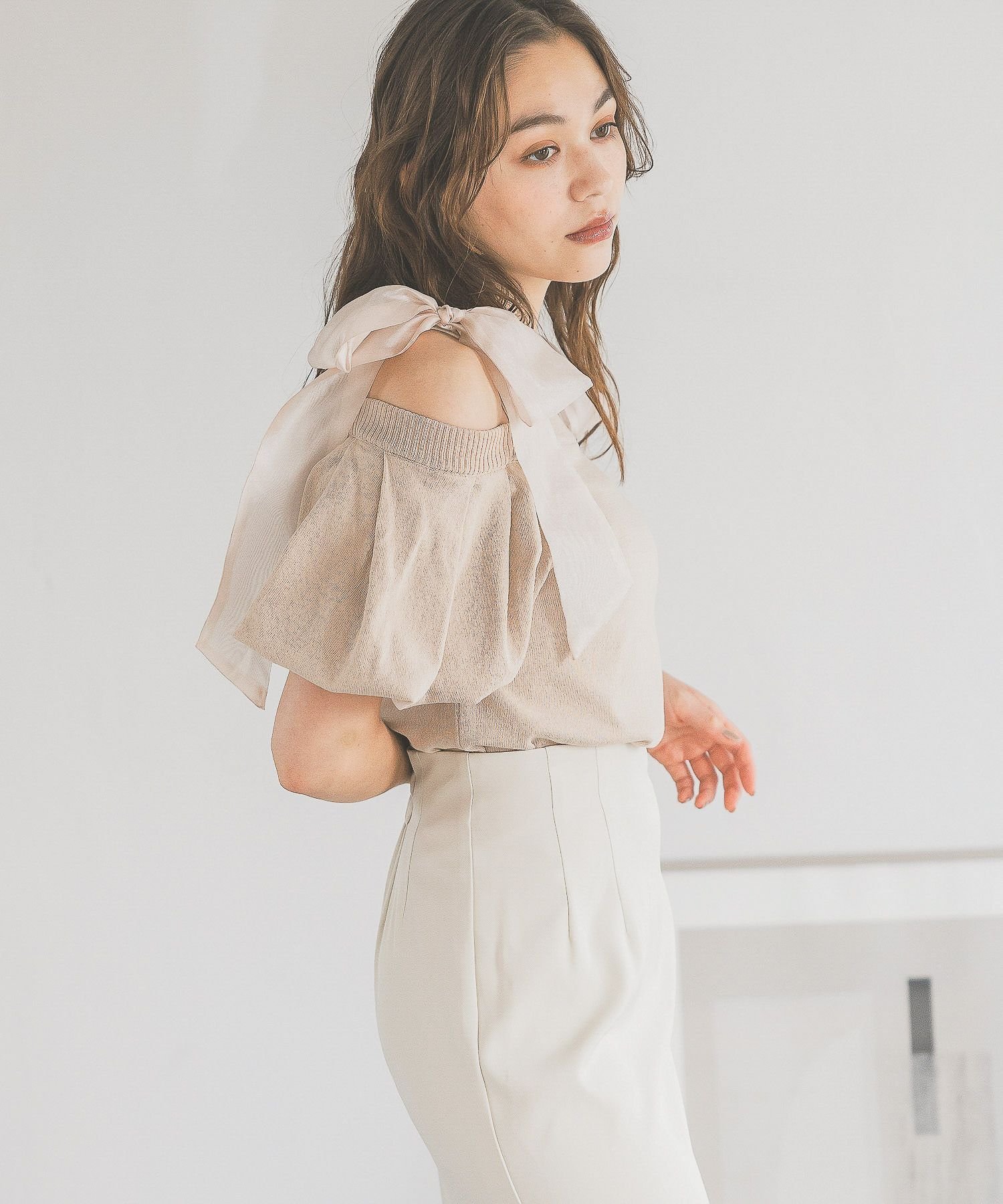 mysty woman 【WEB限定】ショルダーリボンニットプルオーバー ミスティウーマン トップス ニット ホワイト ブラック ベージュ【送料無料】