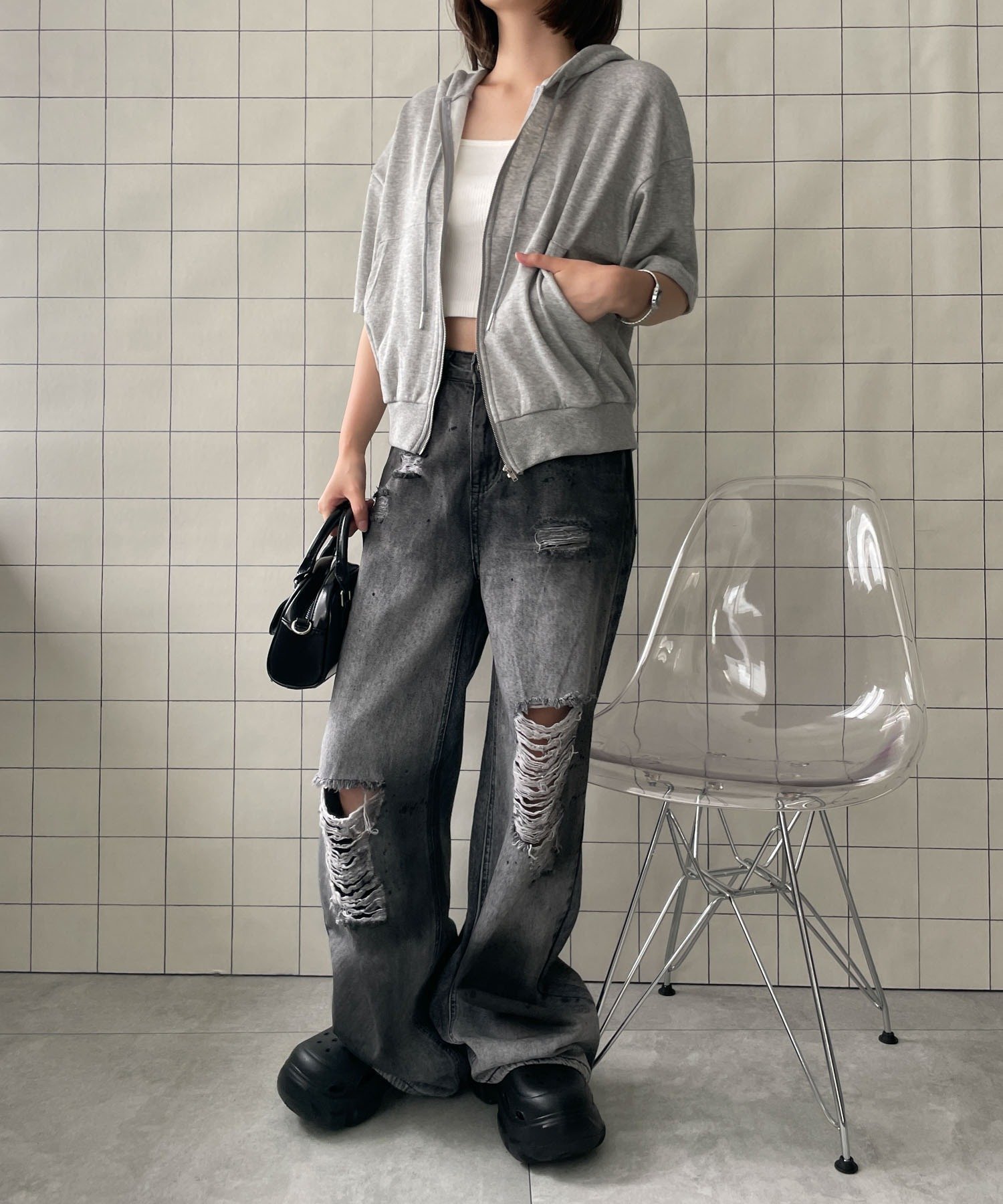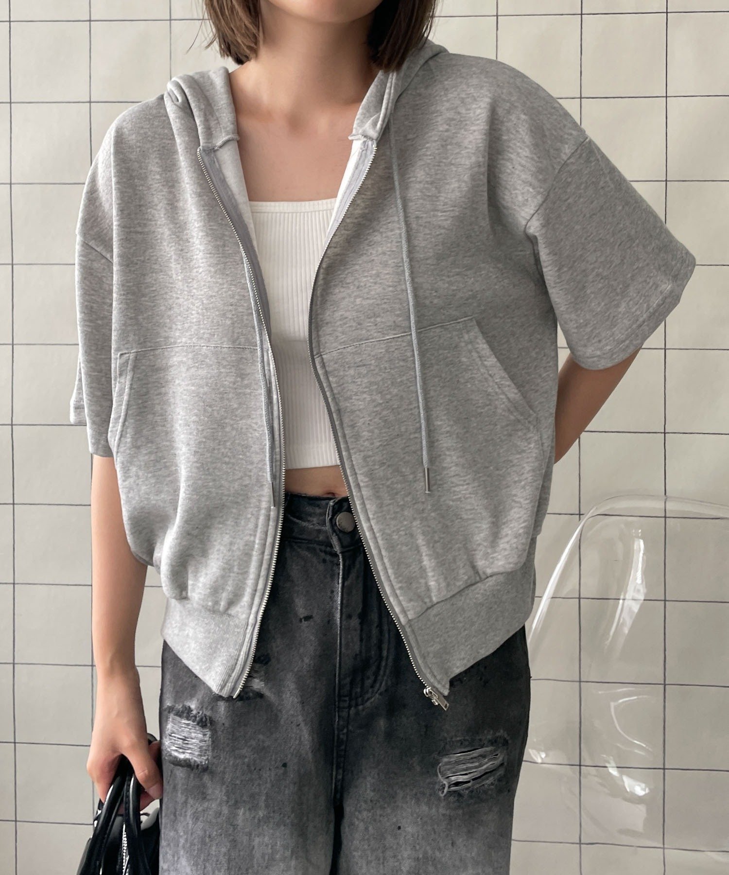 WEGO LADY'S 半袖ジップアップパーカー ウィゴー トップス パーカー・フーディー グレー ブラック