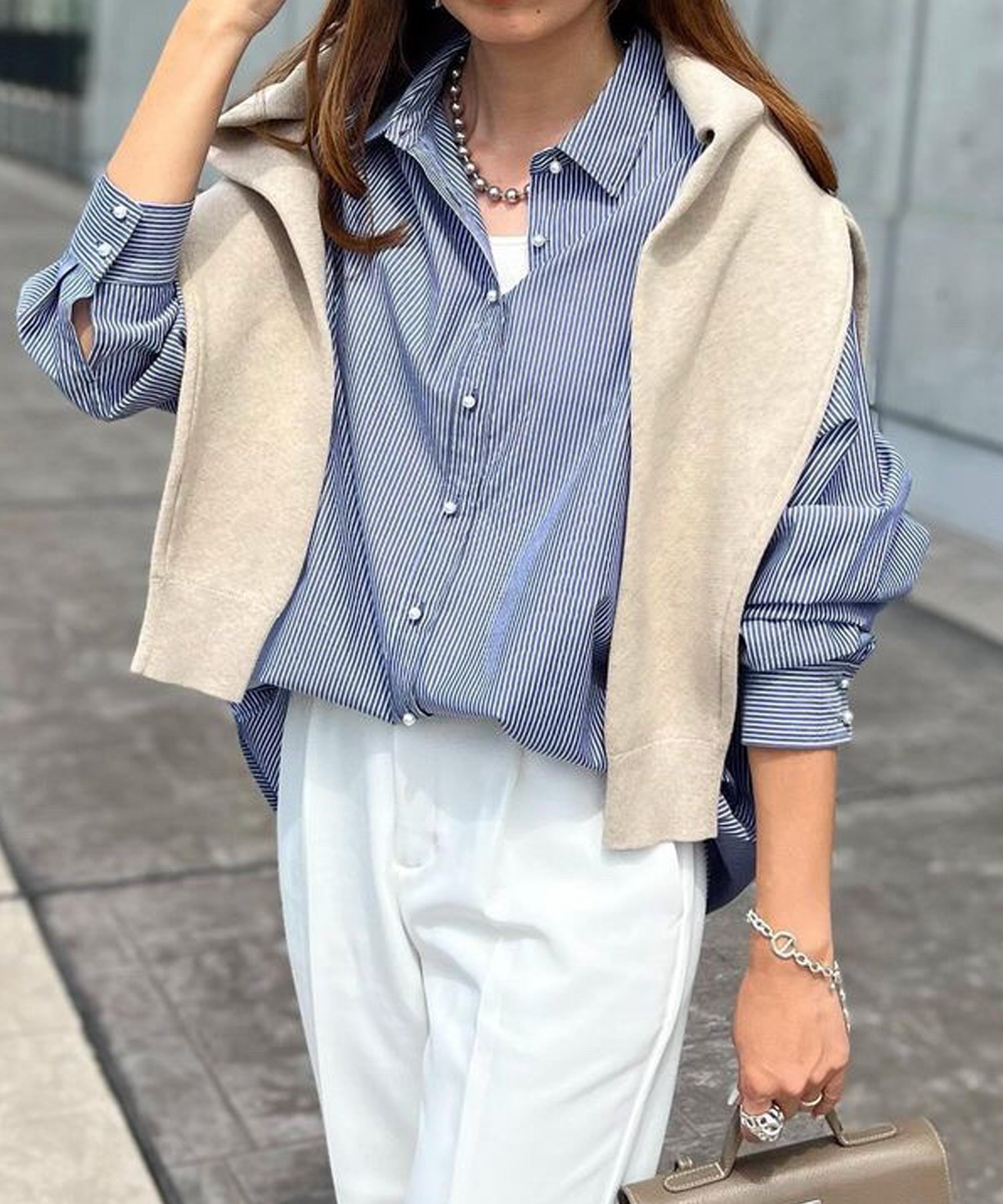 Emma Taylor パール釦オーバーサイズシャツ スタイルドア トップス シャツ・ブラウス ネイビー ベージュ【送料無料】