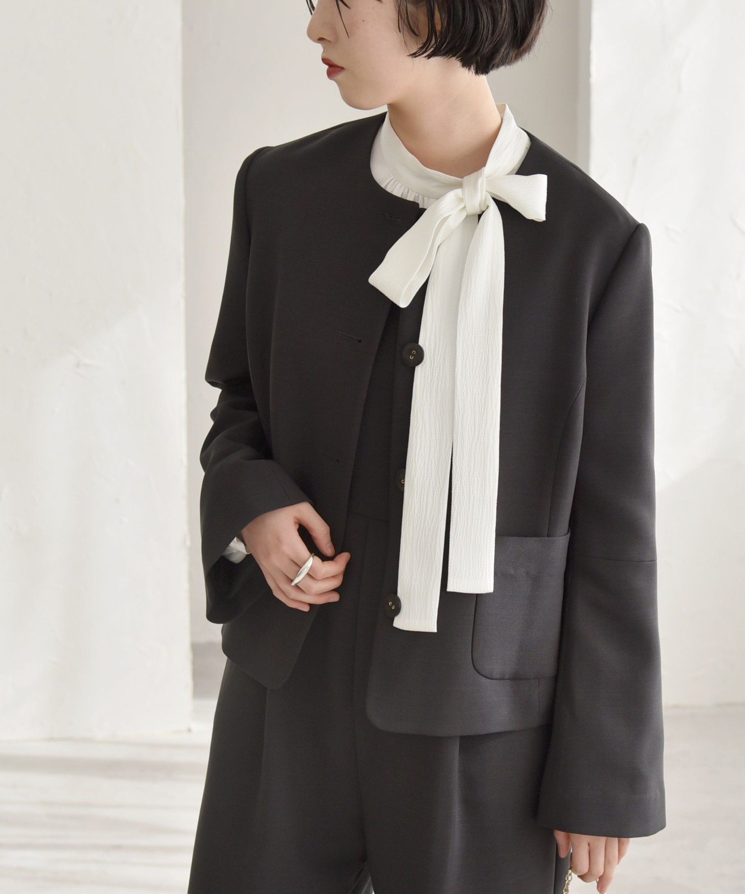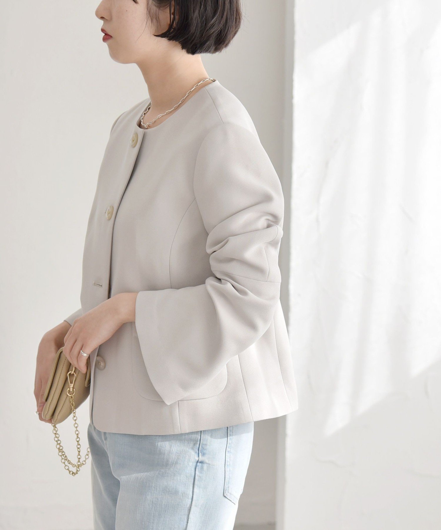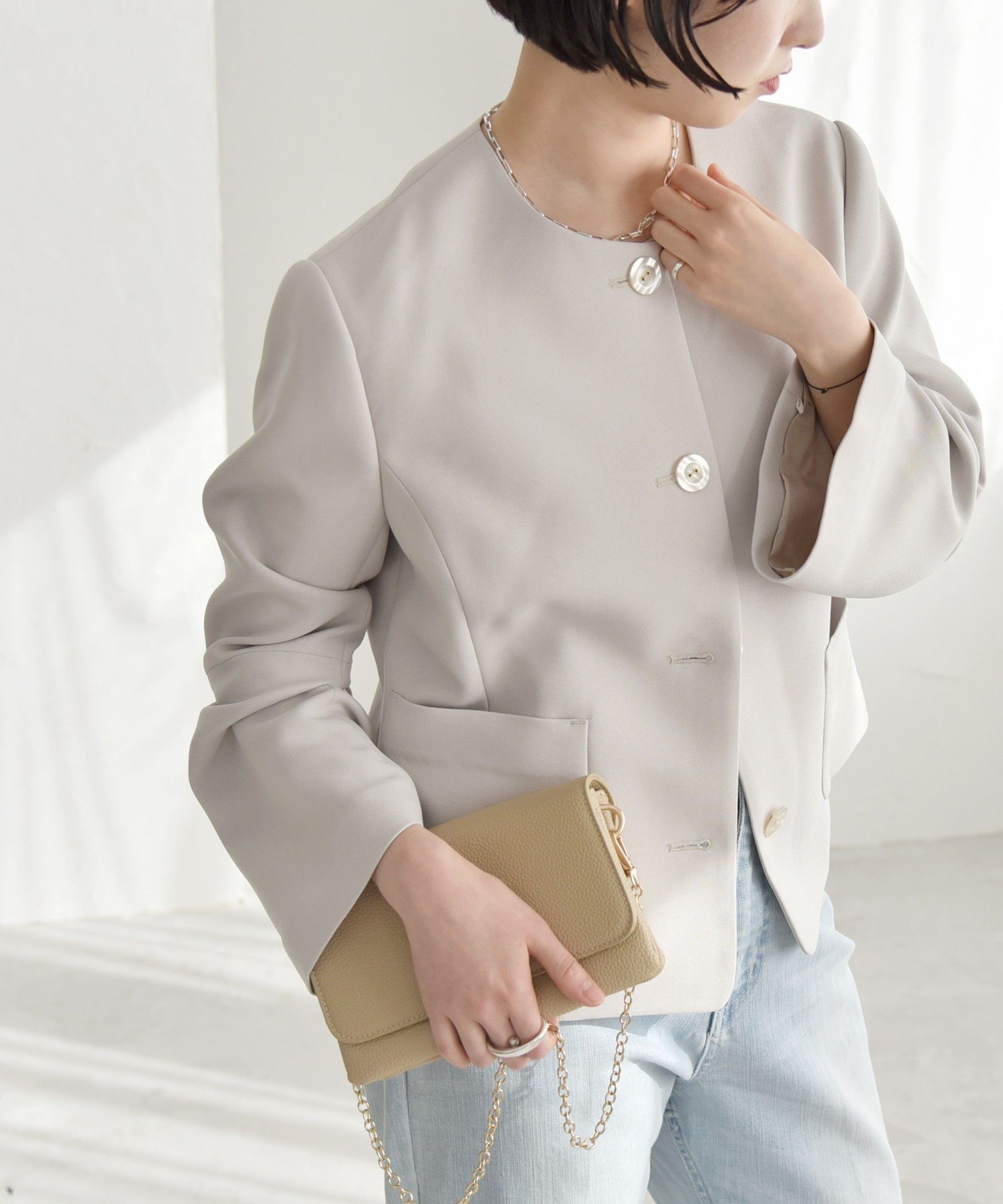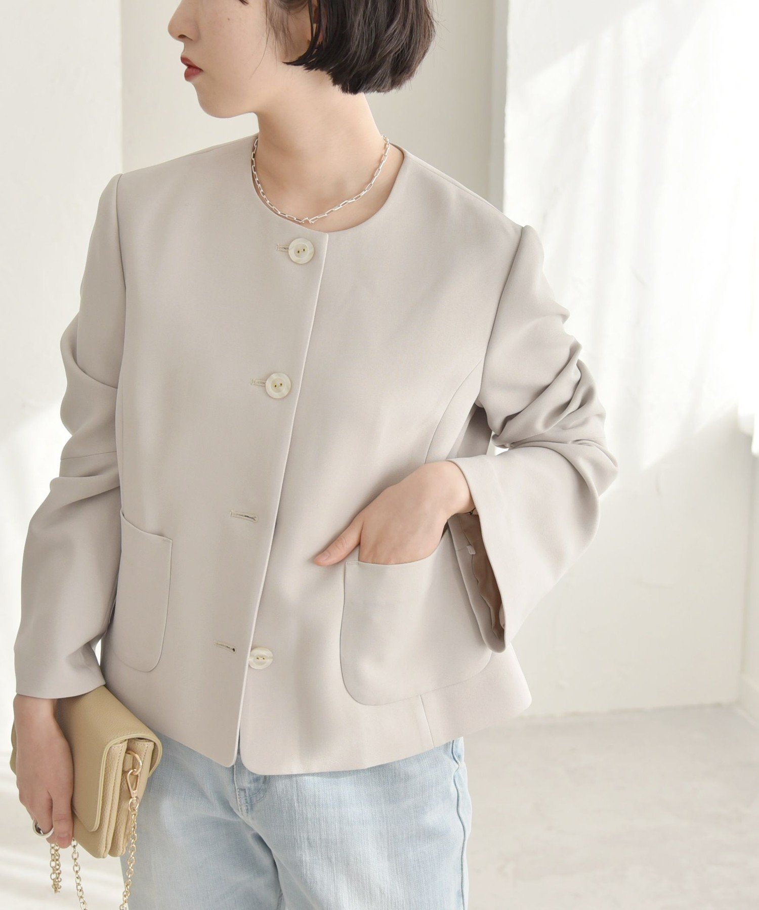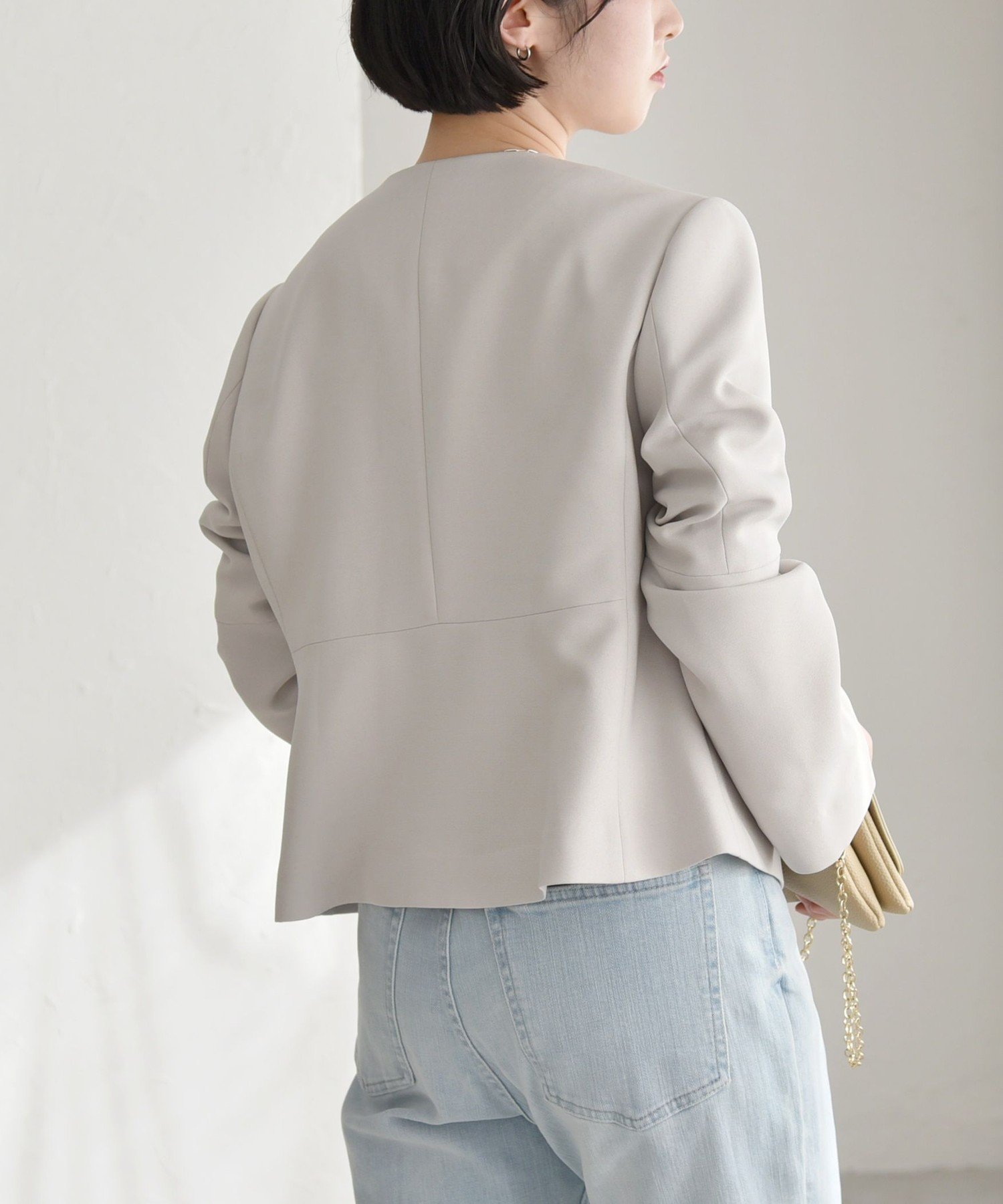 【SALE/30%OFF】quaranciel quaranciel:<洗濯機可能>ダブルクロス フレア ノーカラー ジャケット(セットアップ対応) シップス ジャケット・アウター ノーカラージャケット ベージュ グレー【送料無料】