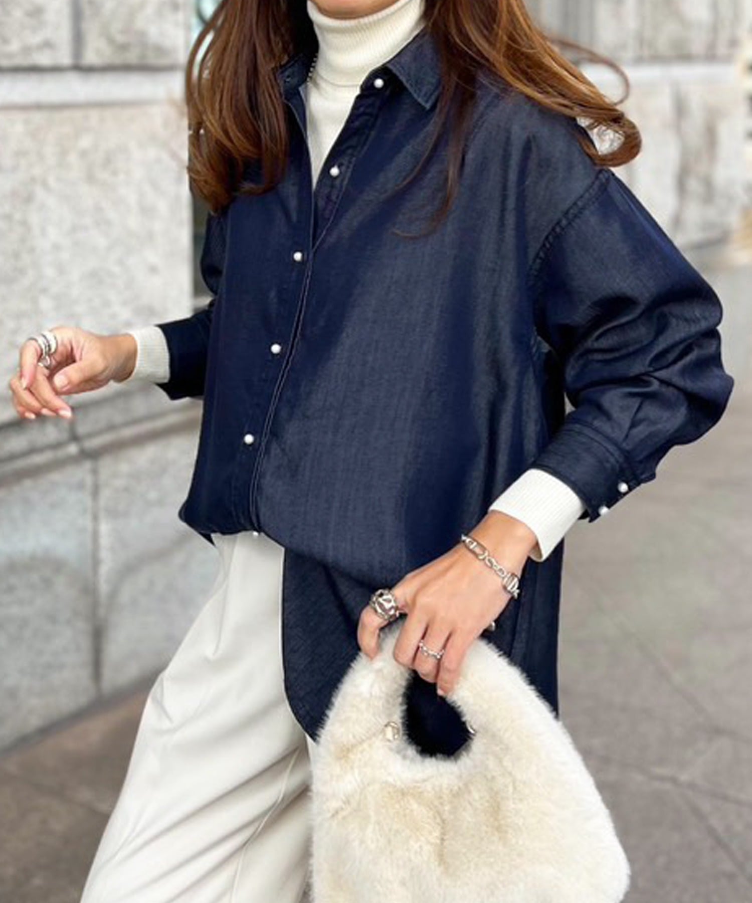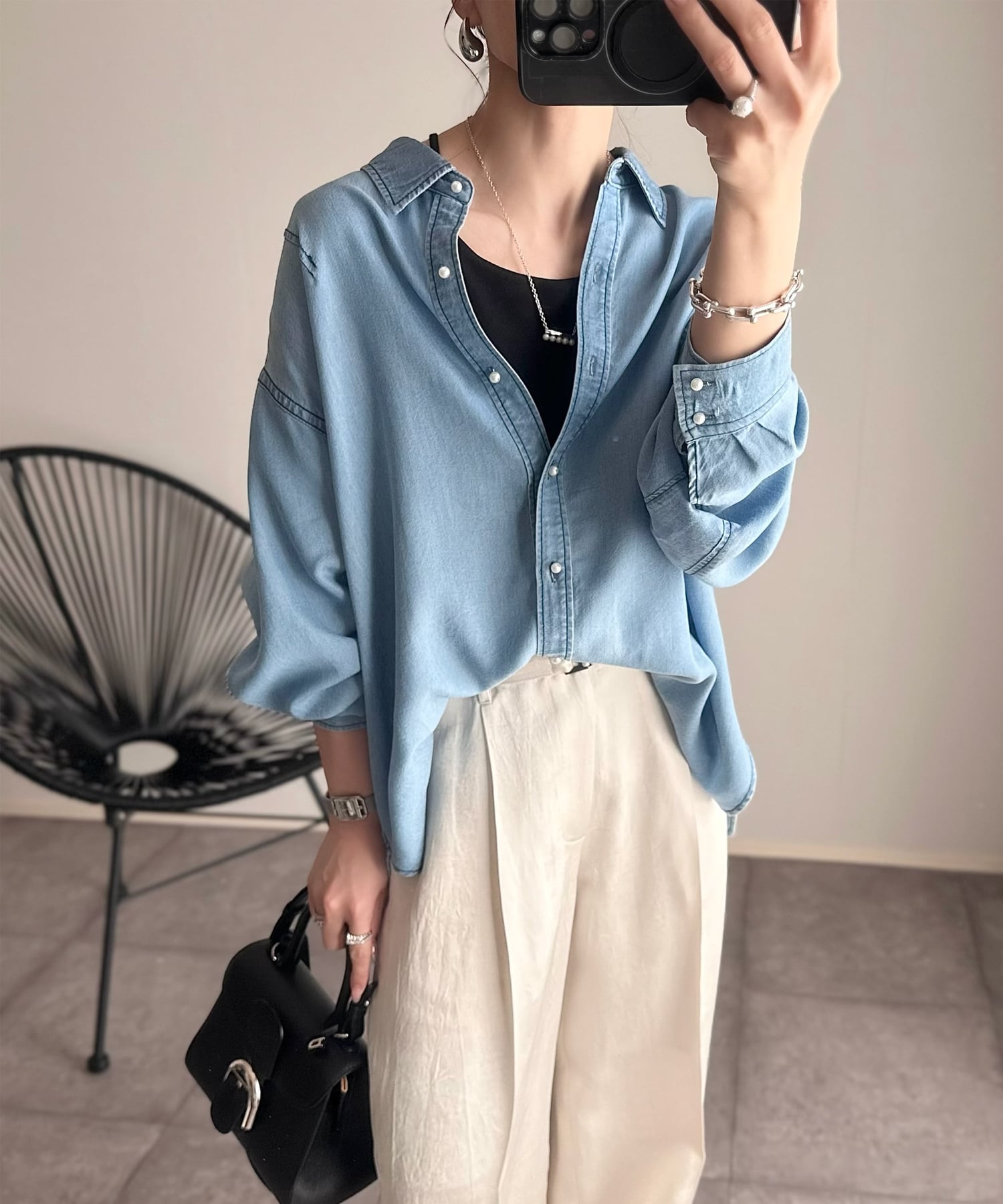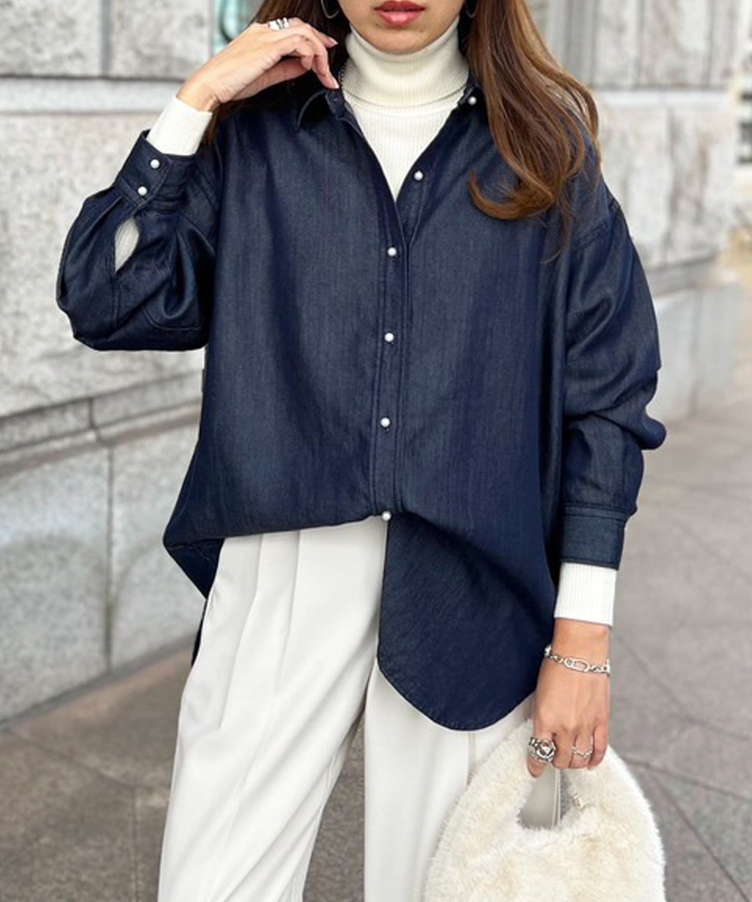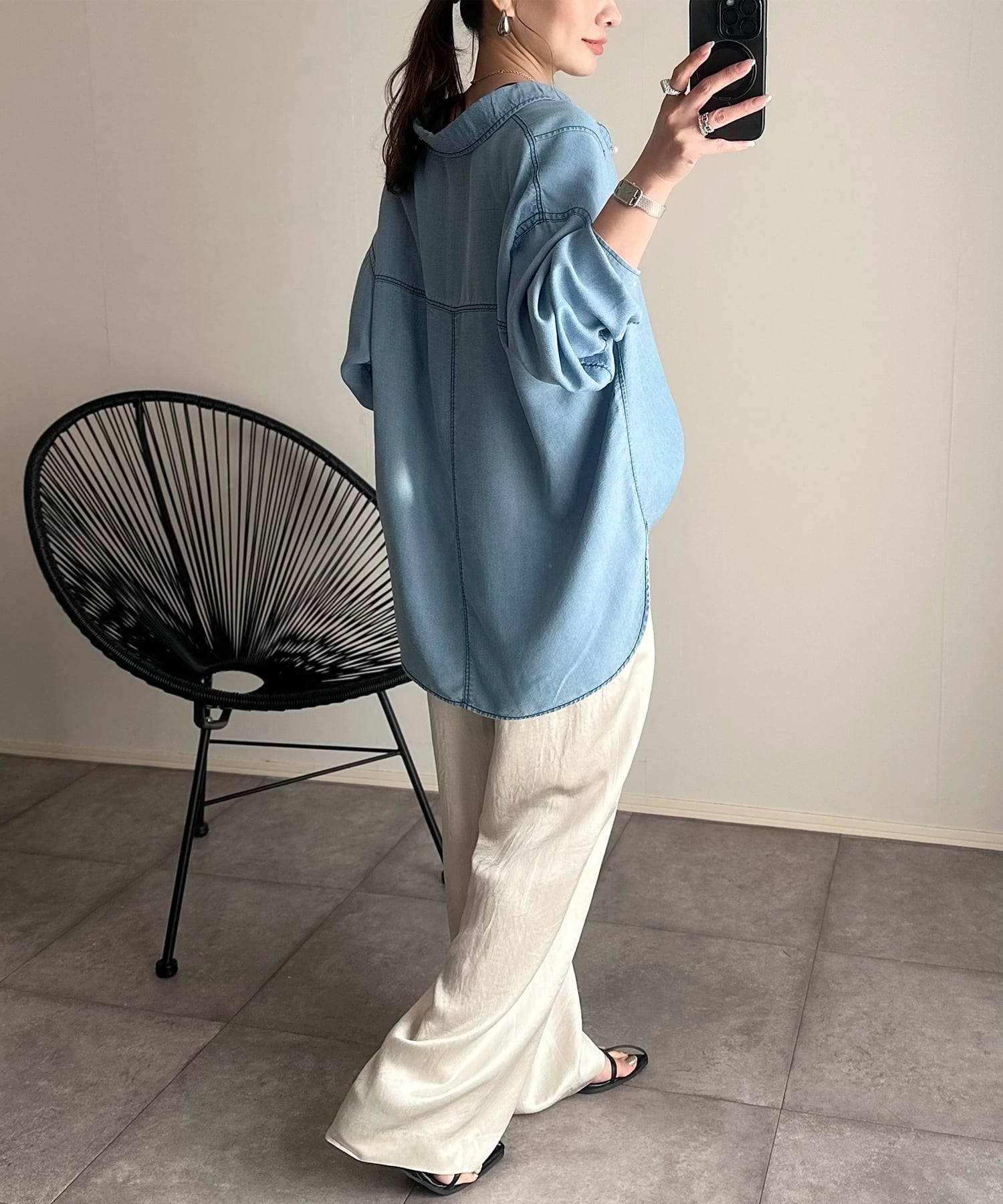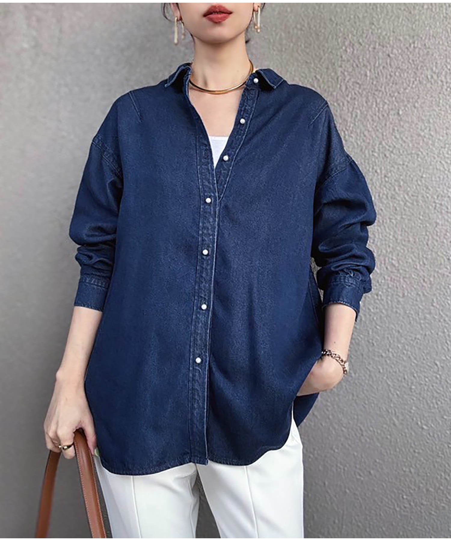 Emma Taylor パール釦オーバーリヨセルデニムシャツ スタイルドア トップス シャツ・ブラウス ブルー ネイビー【送料無料】