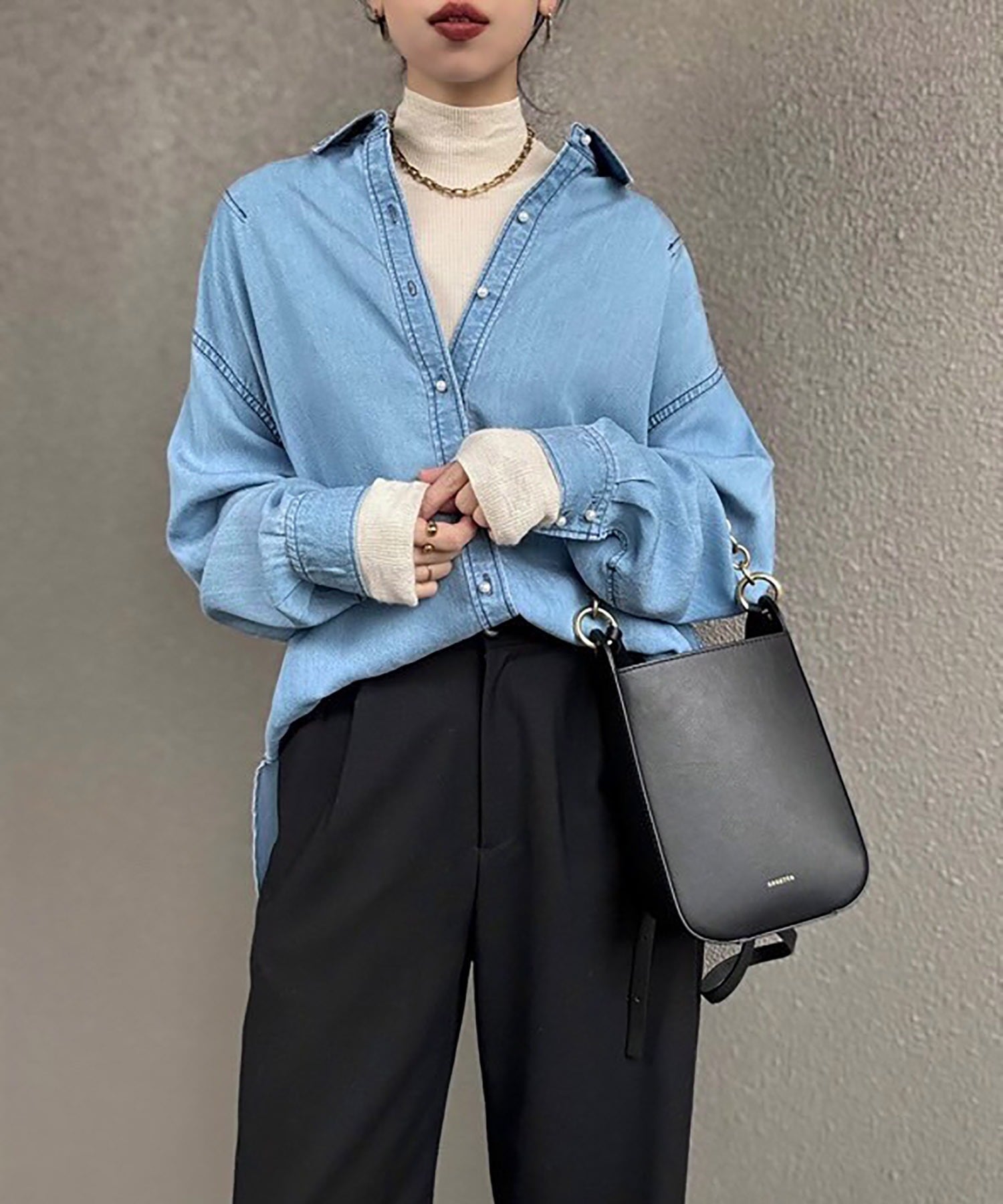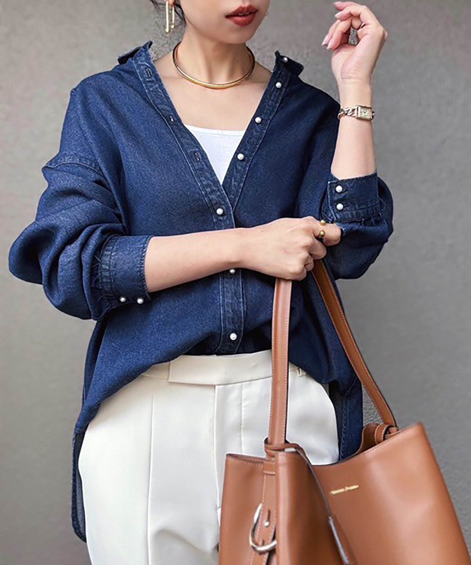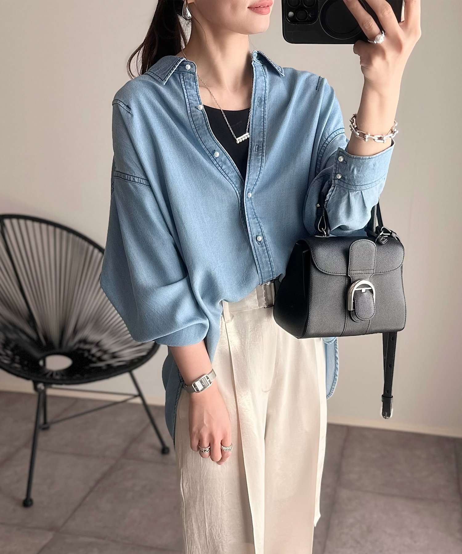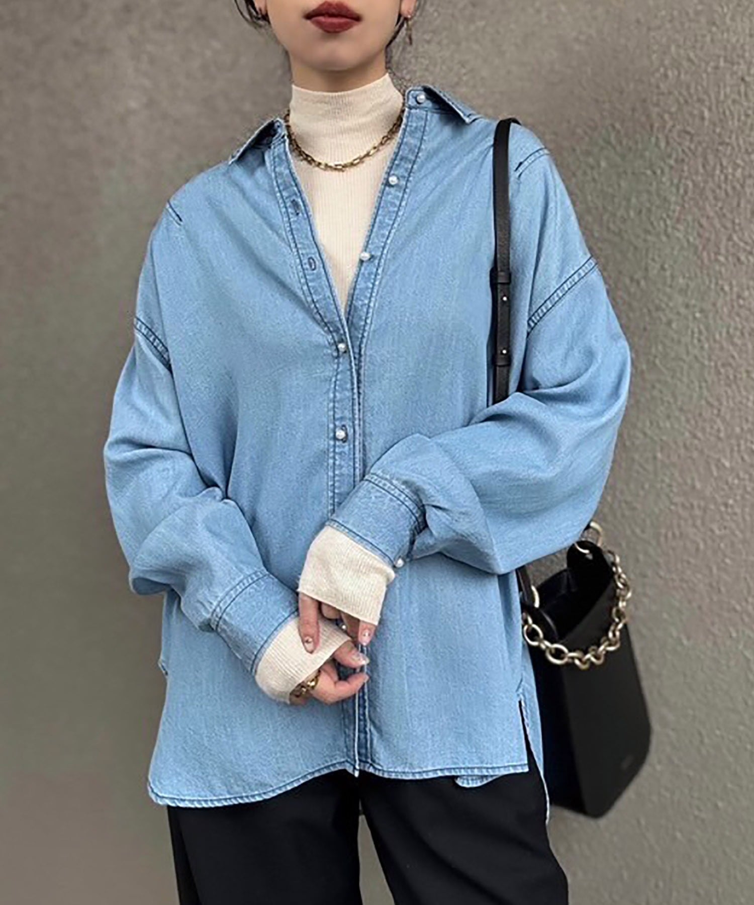 Emma Taylor パール釦オーバーリヨセルデニムシャツ スタイルドア トップス シャツ・ブラウス ブルー ネイビー【送料無料】
