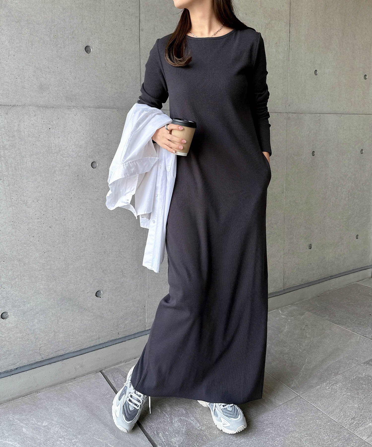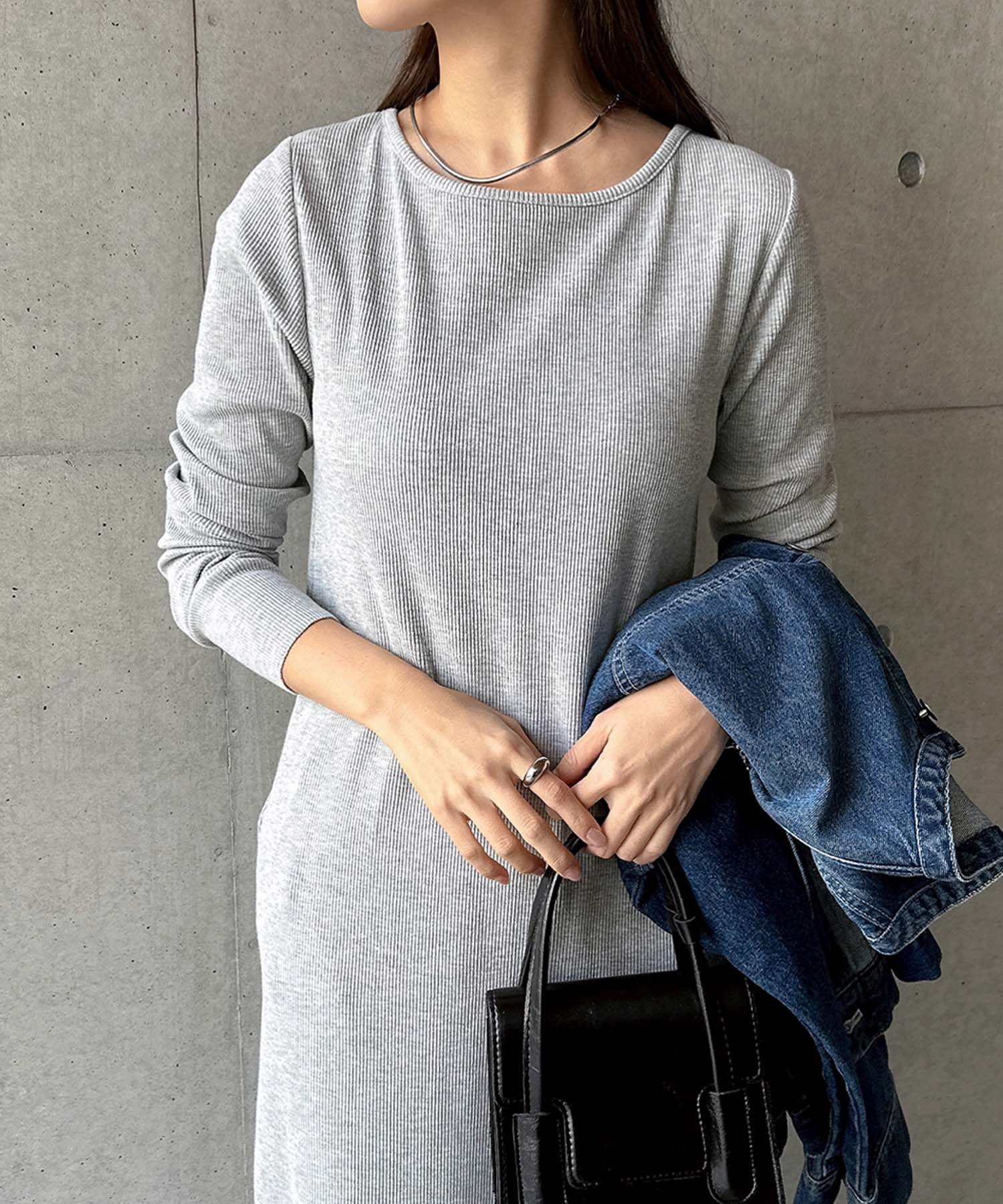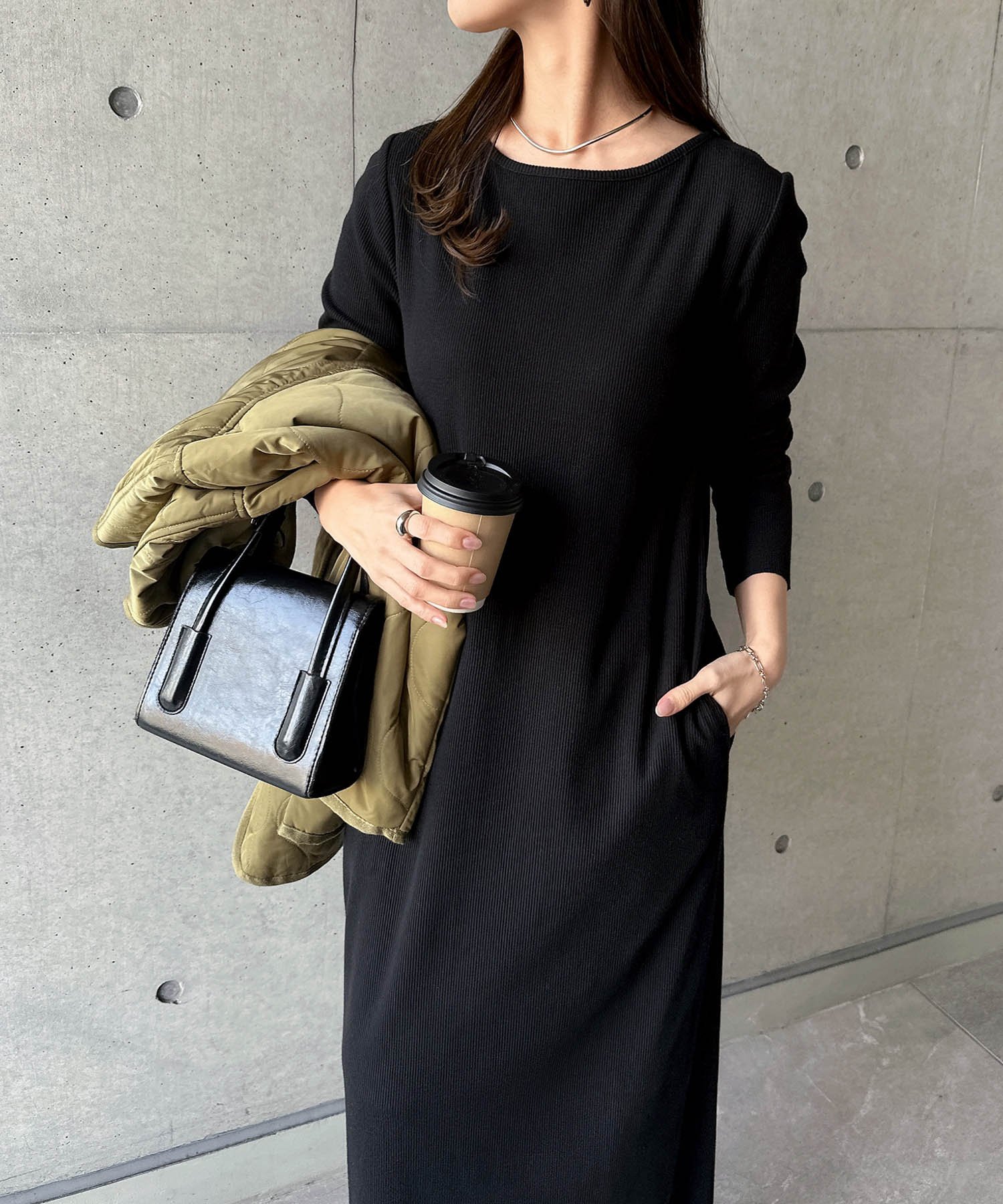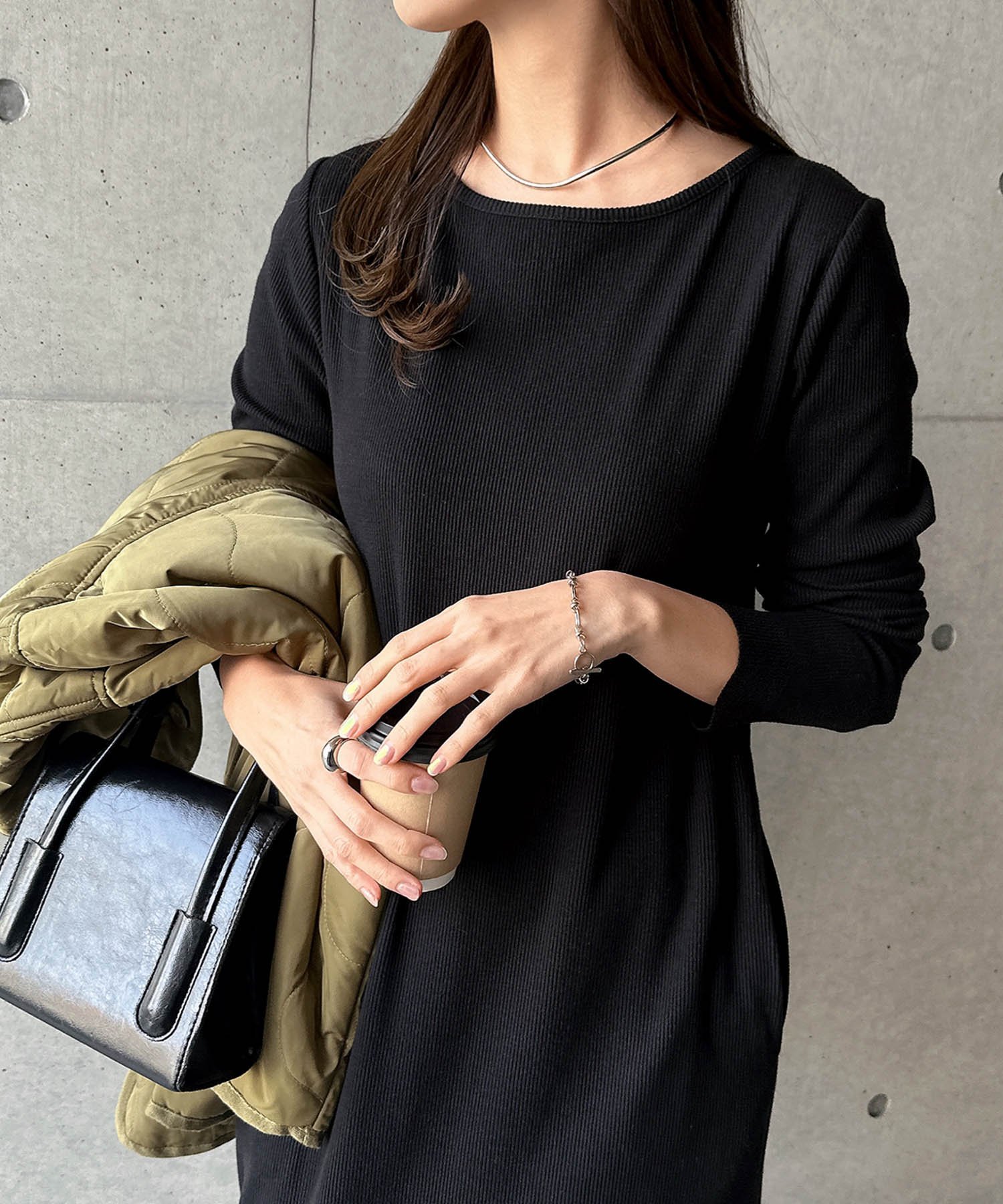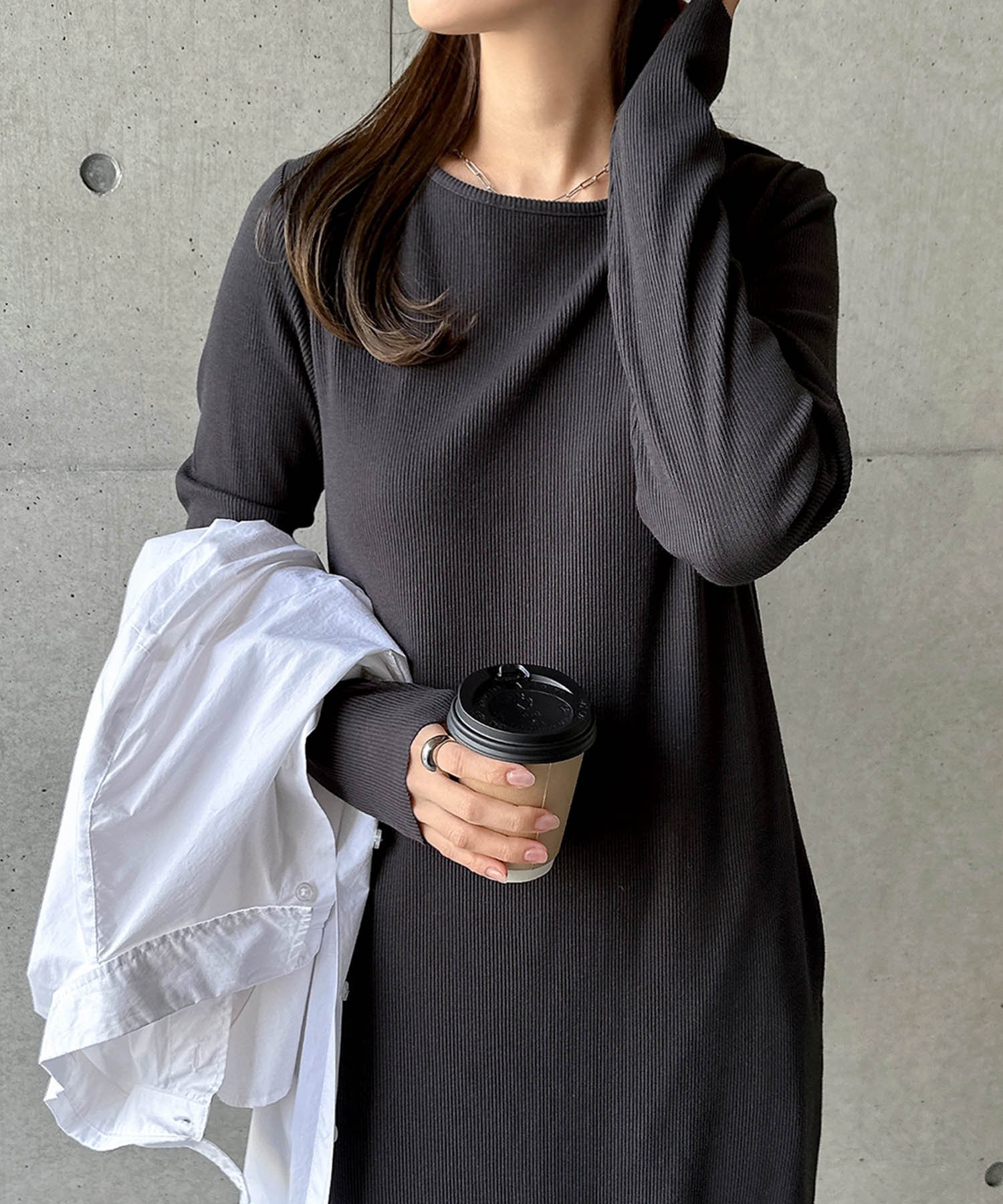 【SALE/25%OFF】andme セルフカットリブ ボートネック 長袖 ワンピース アンドミー ワンピース・ドレス ワンピース ブラック グレー【送料無料】