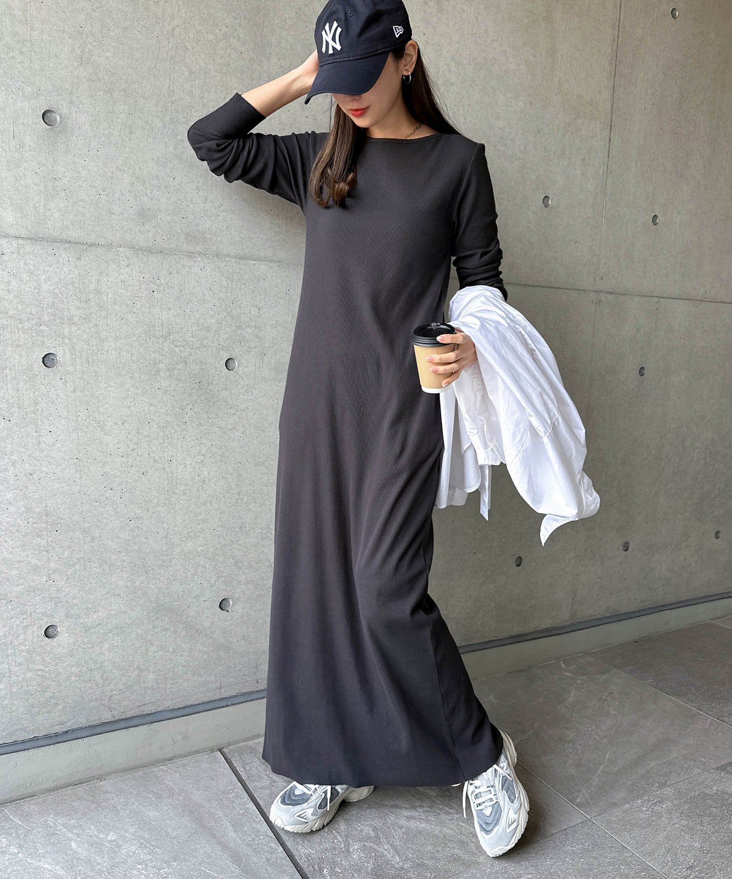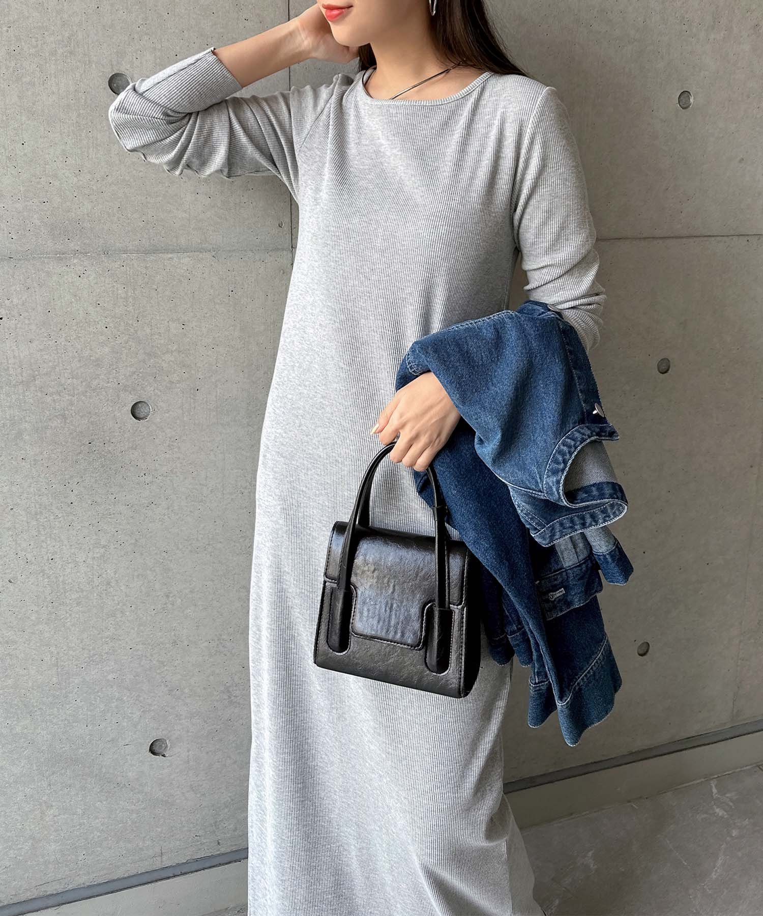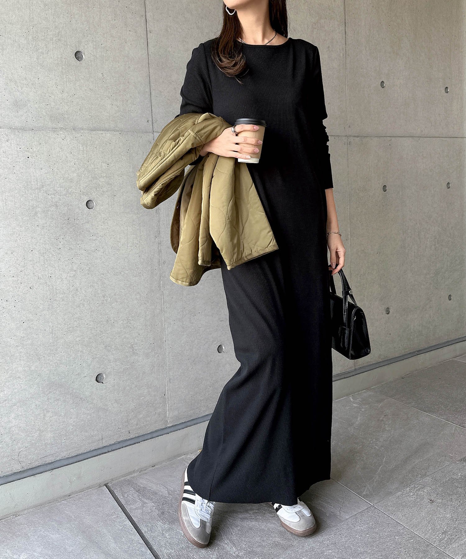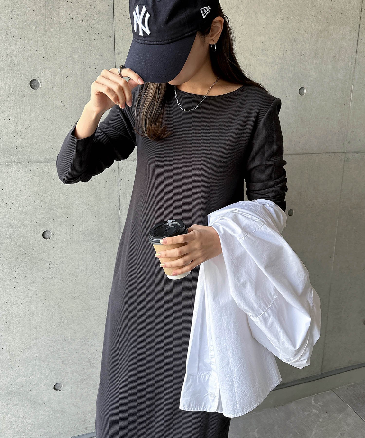 【SALE/25%OFF】andme セルフカットリブ ボートネック 長袖 ワンピース アンドミー ワンピース・ドレス ワンピース ブラック グレー【送料無料】