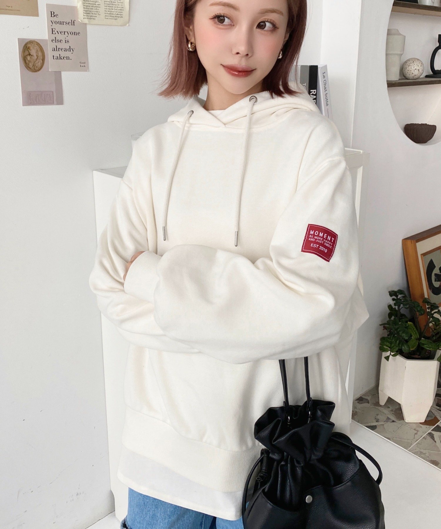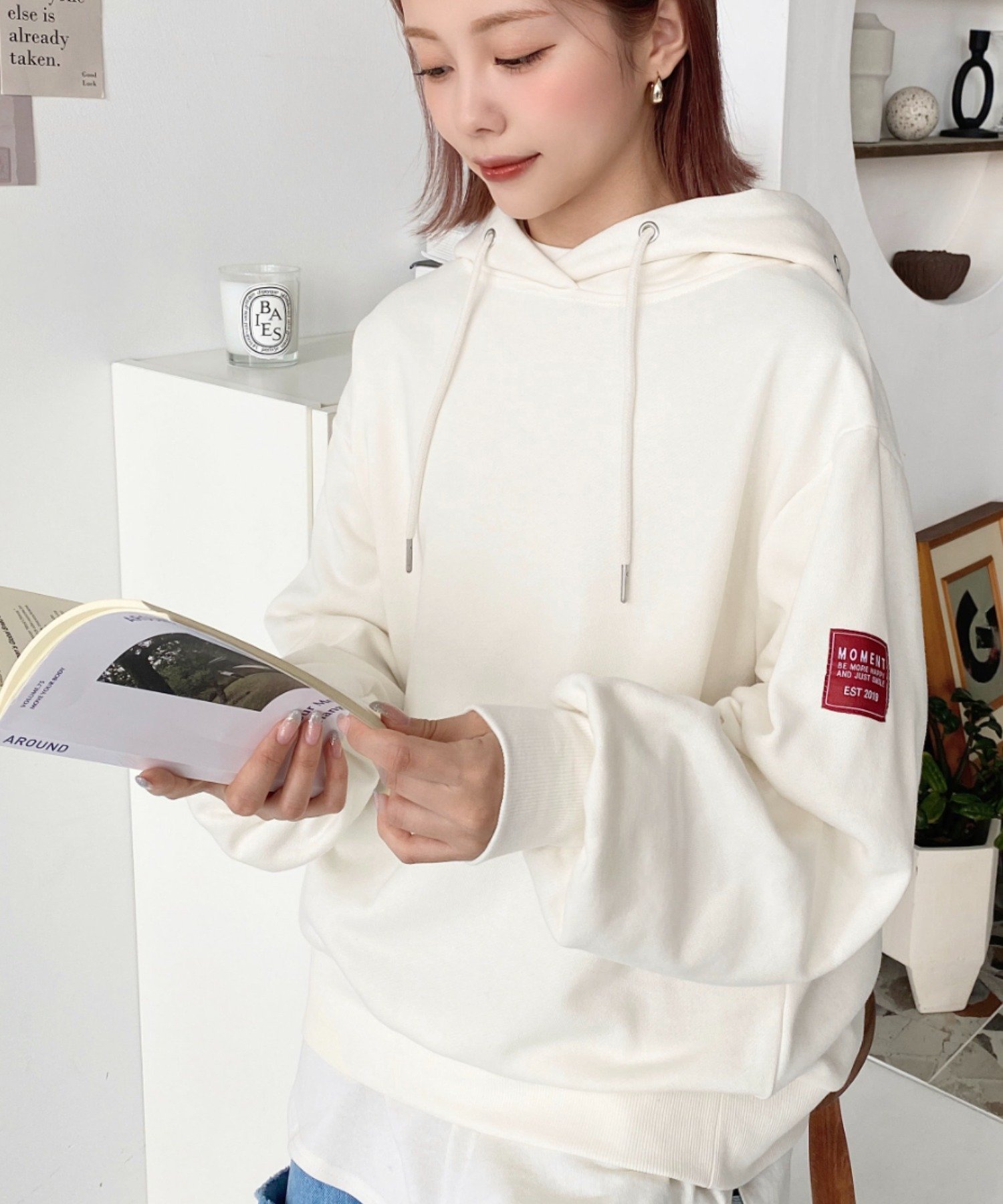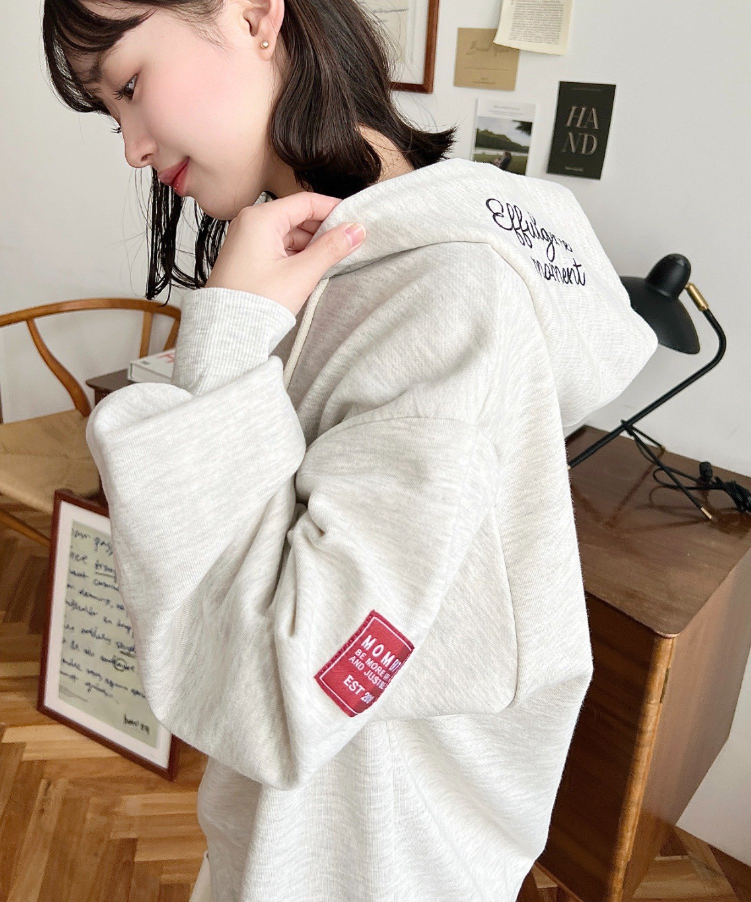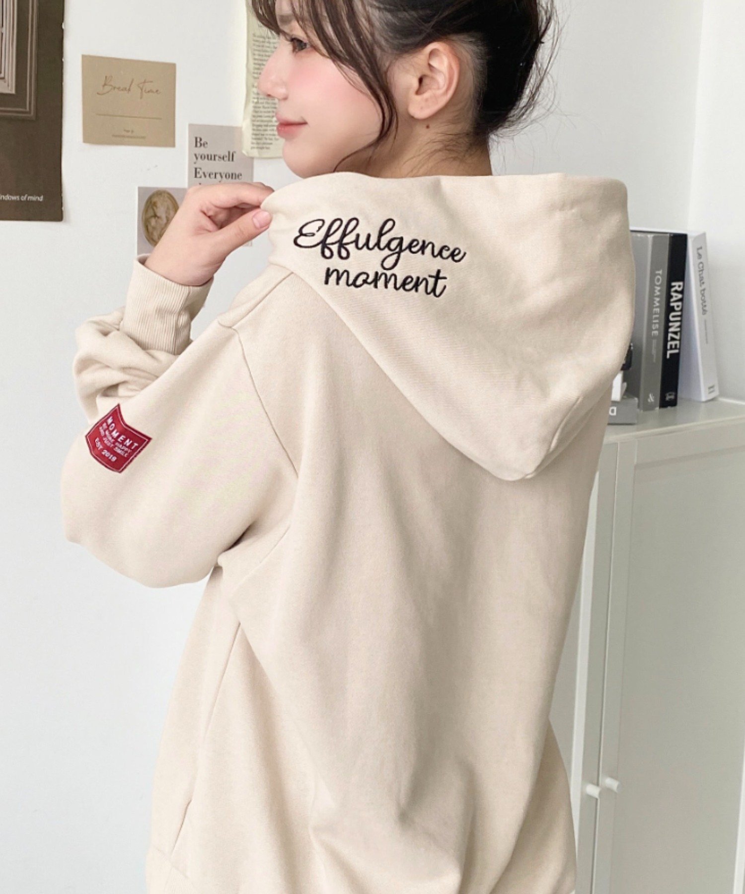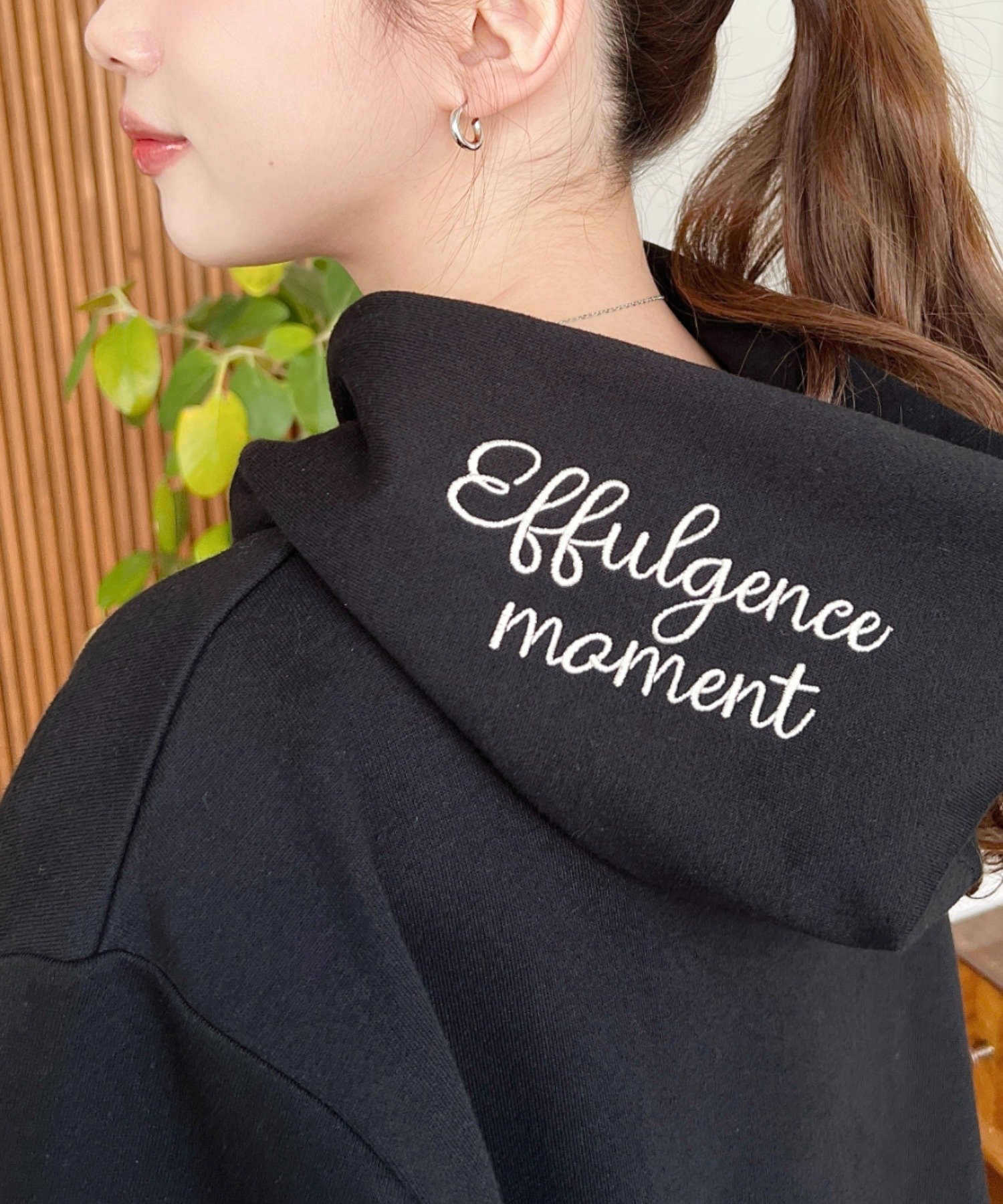 moment+ 裏毛ショート丈ロゴ刺繍ジップアップパーカー モーメントプラス トップス パーカー・フーディー ホワイト ベージュ ブラック【送料無料】