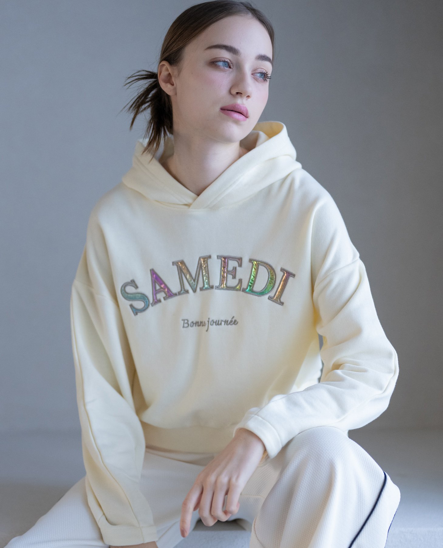 YEVS オーロラパッチワークロゴフーディー イーブス トップス パーカー・フーディー グレー ホワイト【送料無料】