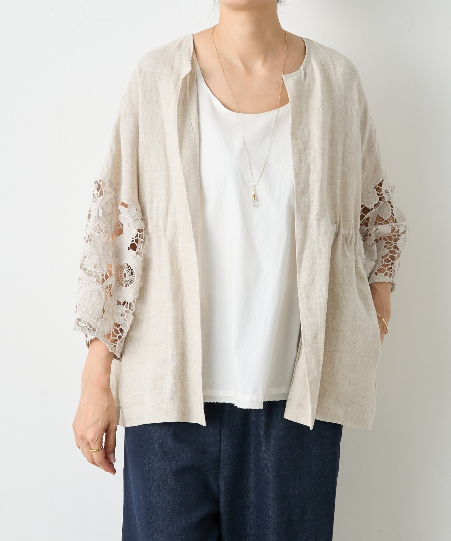 BEARDSLEY 袖レースリネン羽織 ビアズリー ジャケット・アウター その他のジャケット・アウター ベージュ ブラック【送料無料】