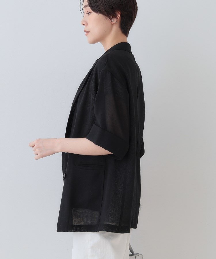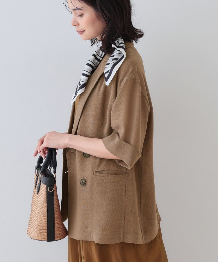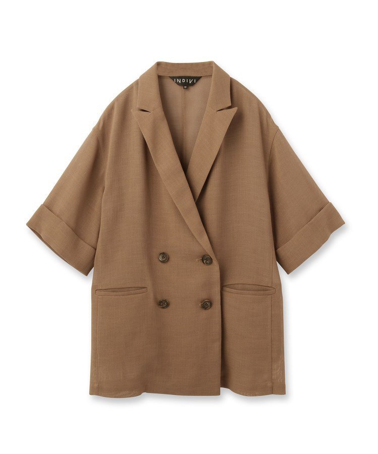 INDIVI 【洗える/メッシュ素材】リネンライク半袖ダブルジャケット インディヴィ ジャケット・アウター テーラードジャケット・ブレザー ブラウン ブラック【送料無料】