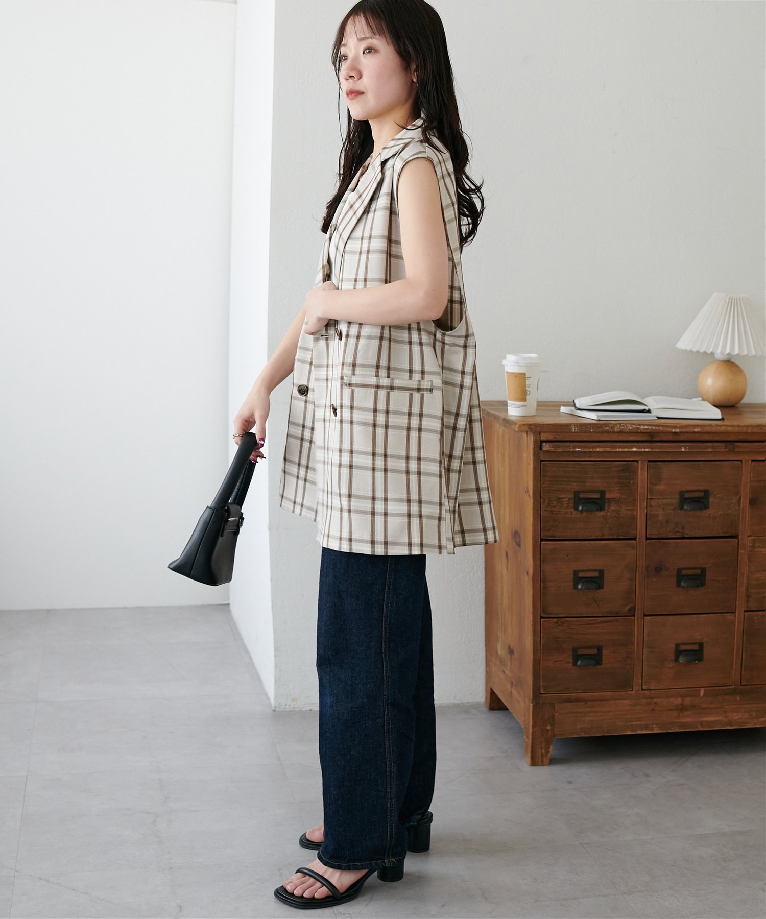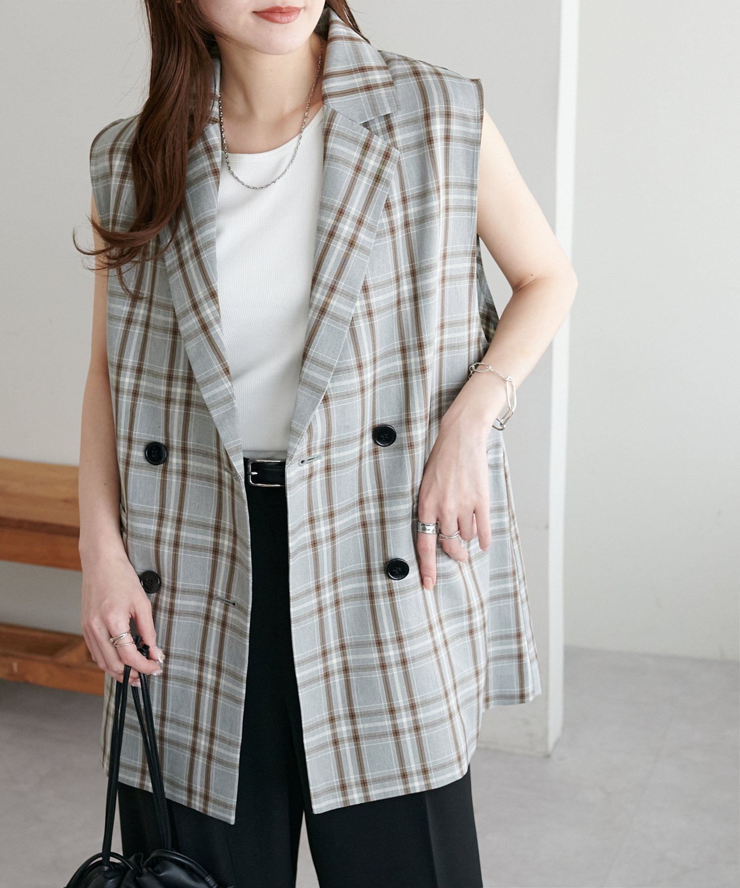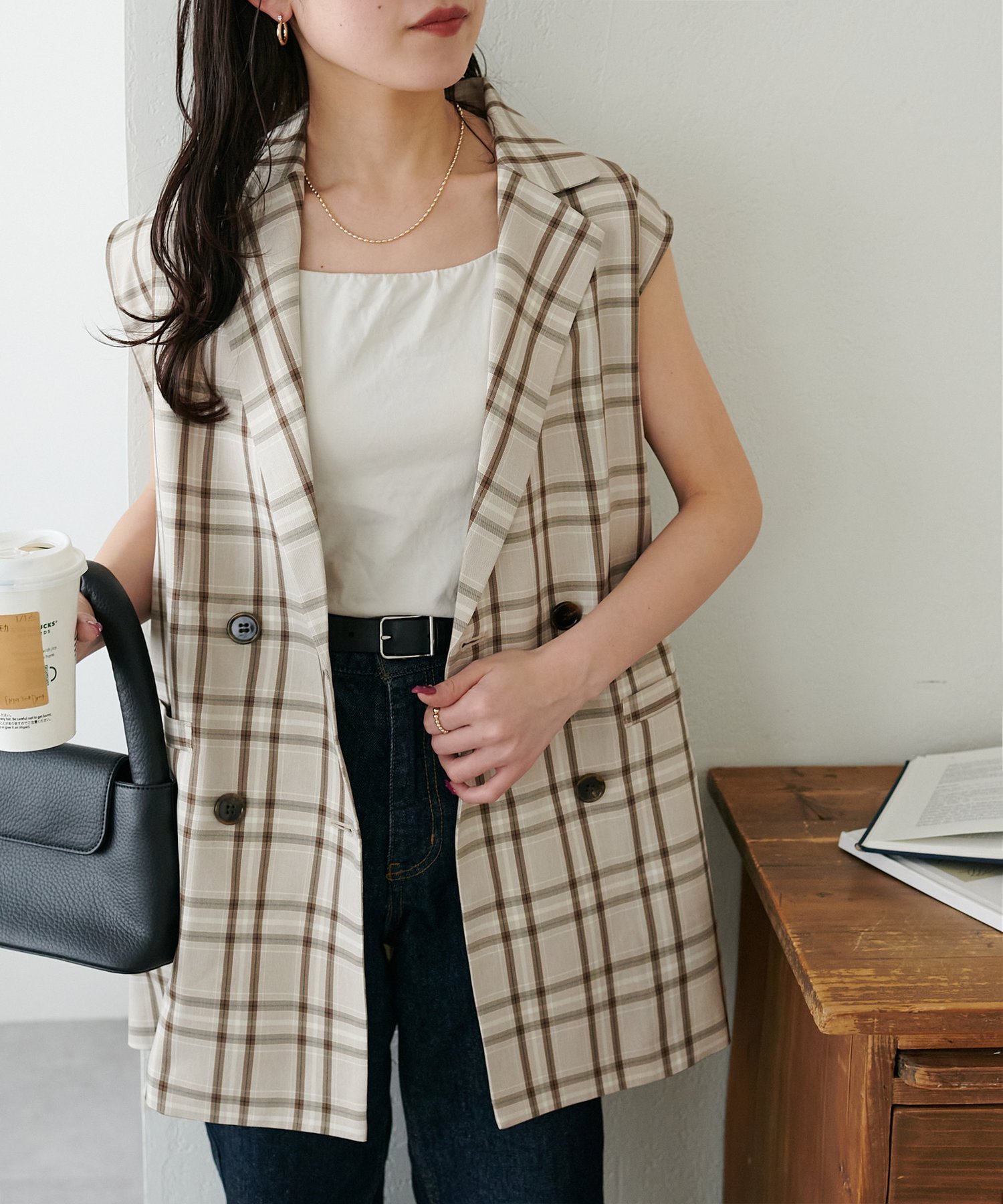 Discoat 【WEB限定】チェックベスト ディスコート トップス ベスト・ジレ ベージュ グレー【送料無料】