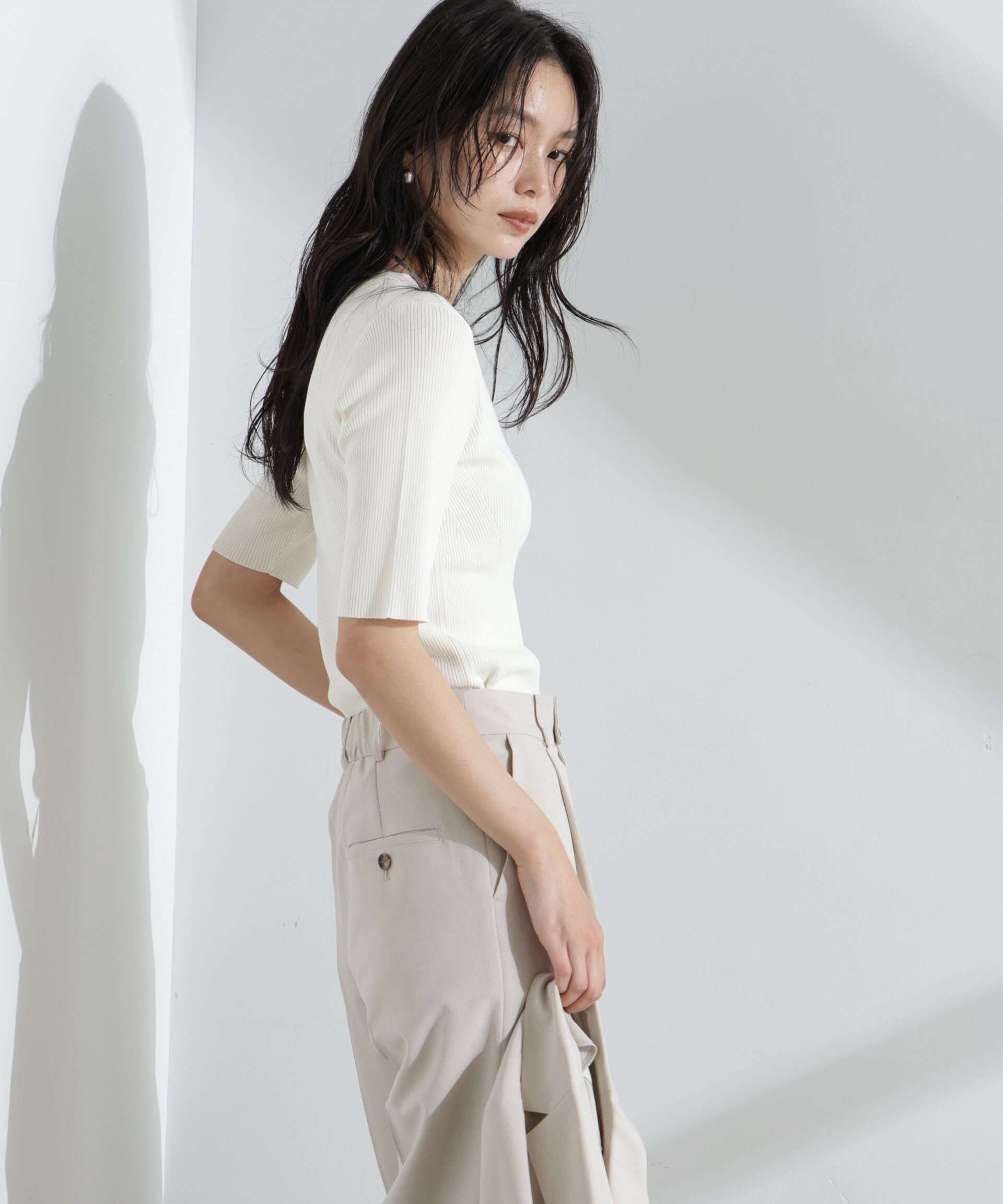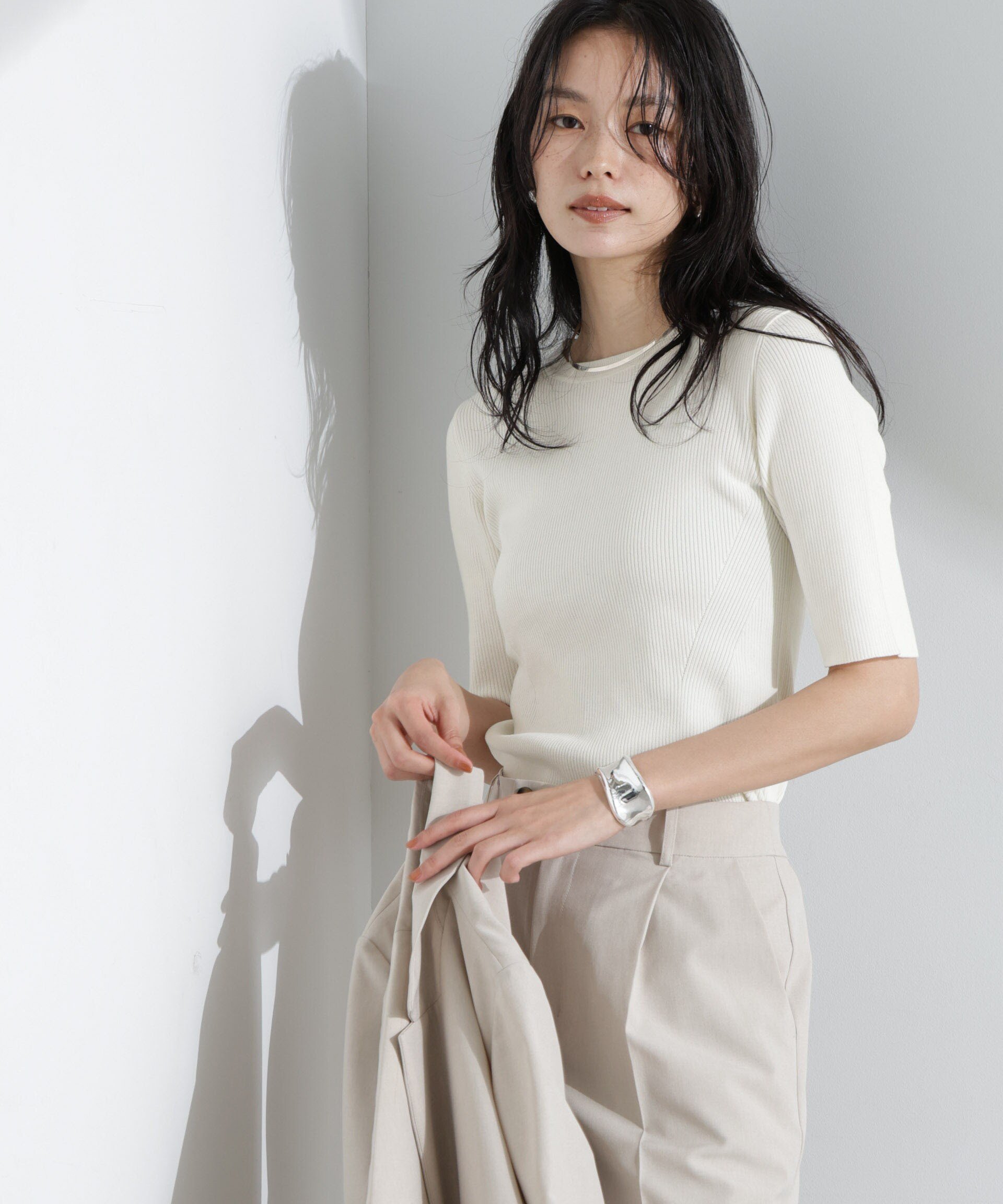 NANO universe ウォッシャブルハイツイスト五分袖リブニット ナノユニバース トップス ニット ホワイト グリーン ブラック【送料無料】