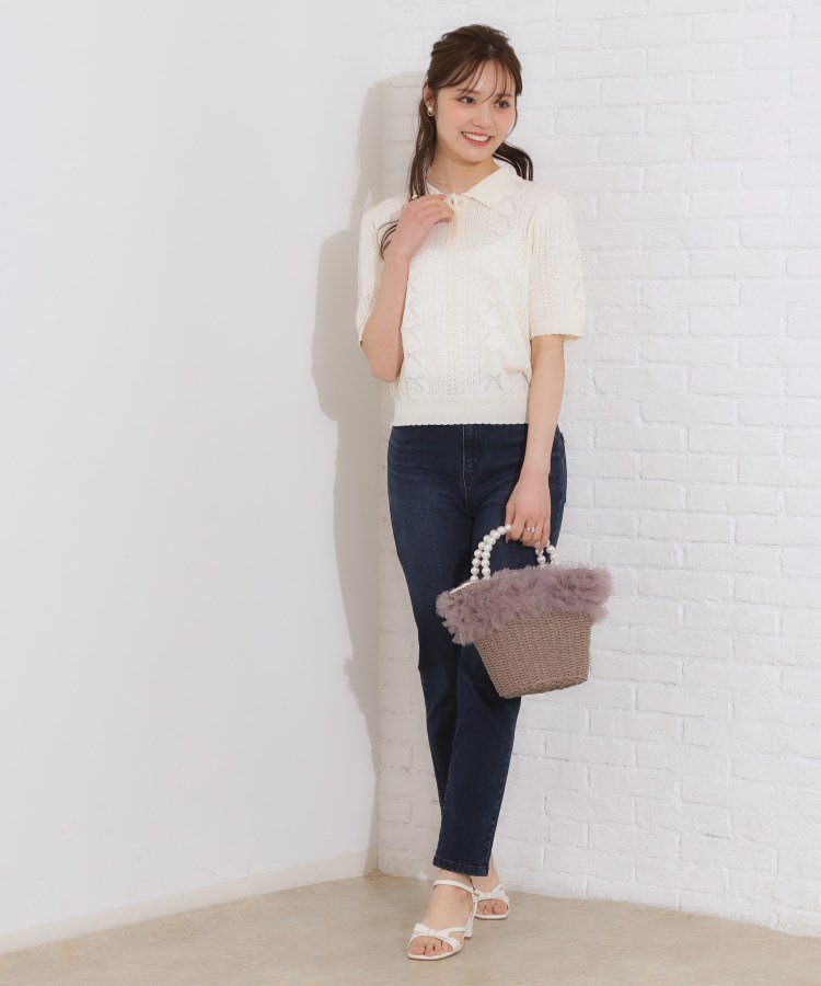 【SALE/9%OFF】Couture Brooch 【洗える・大人可愛い】リボン透かし柄ポロニット クチュールブローチ トップス ニット ホワイト ブルー ブラック【送料無料】