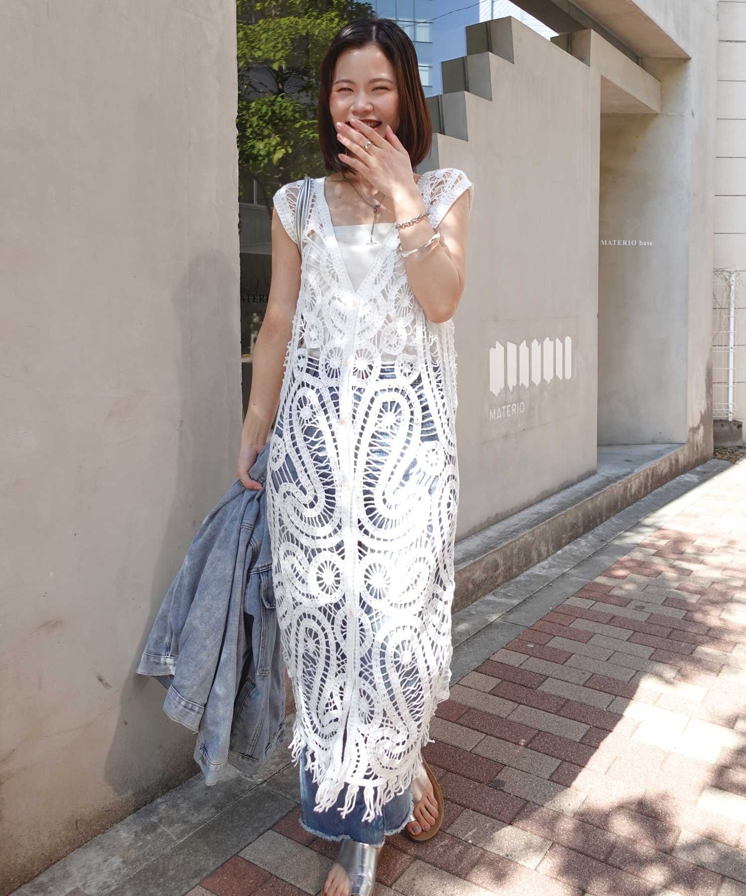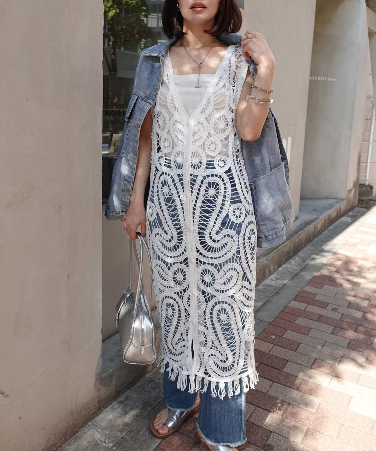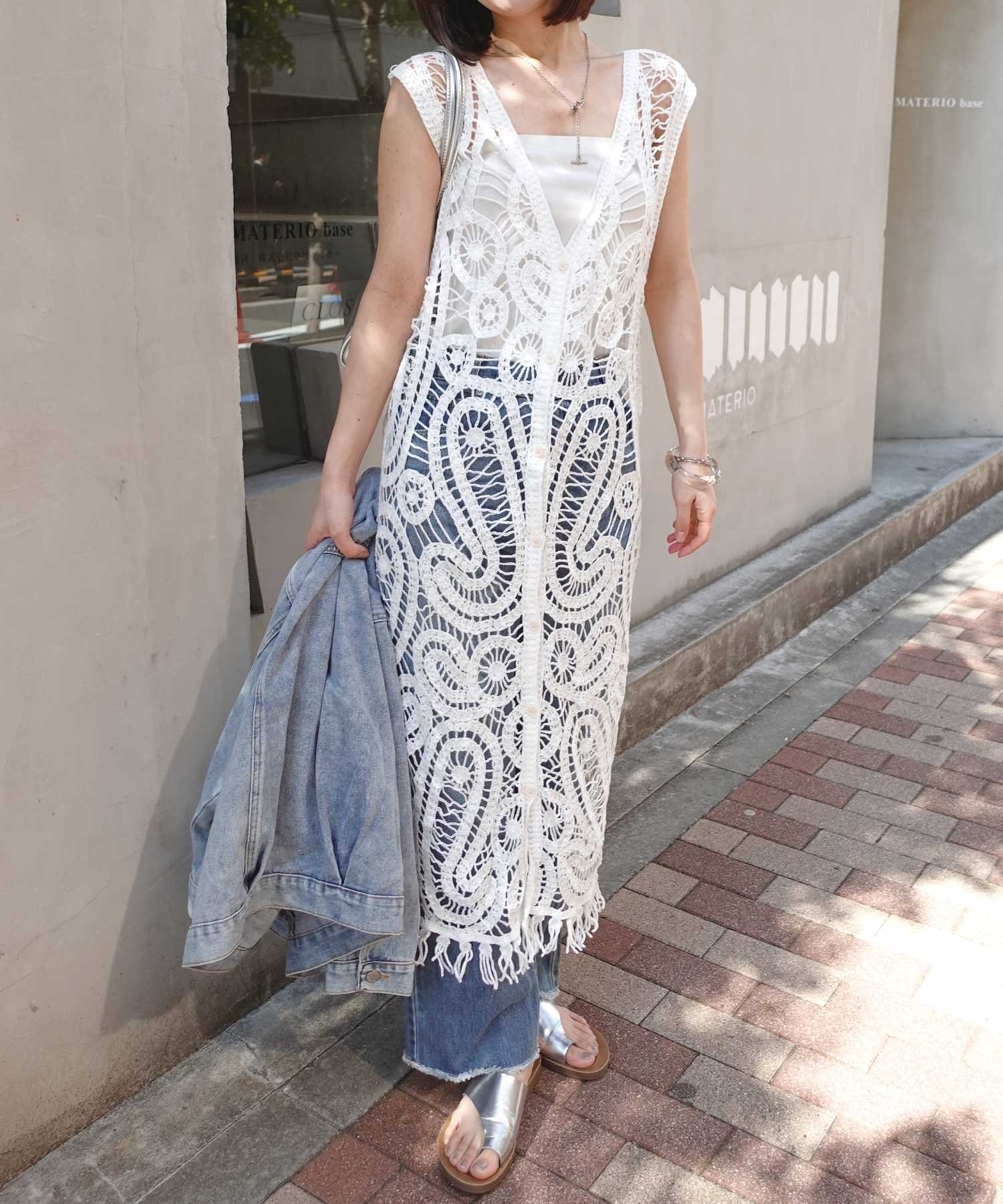 CORNERS クロシェニットフリンジワンピースジレ コーナーズ トップス ベスト・ジレ ベージュ ホワイト【送料無料】