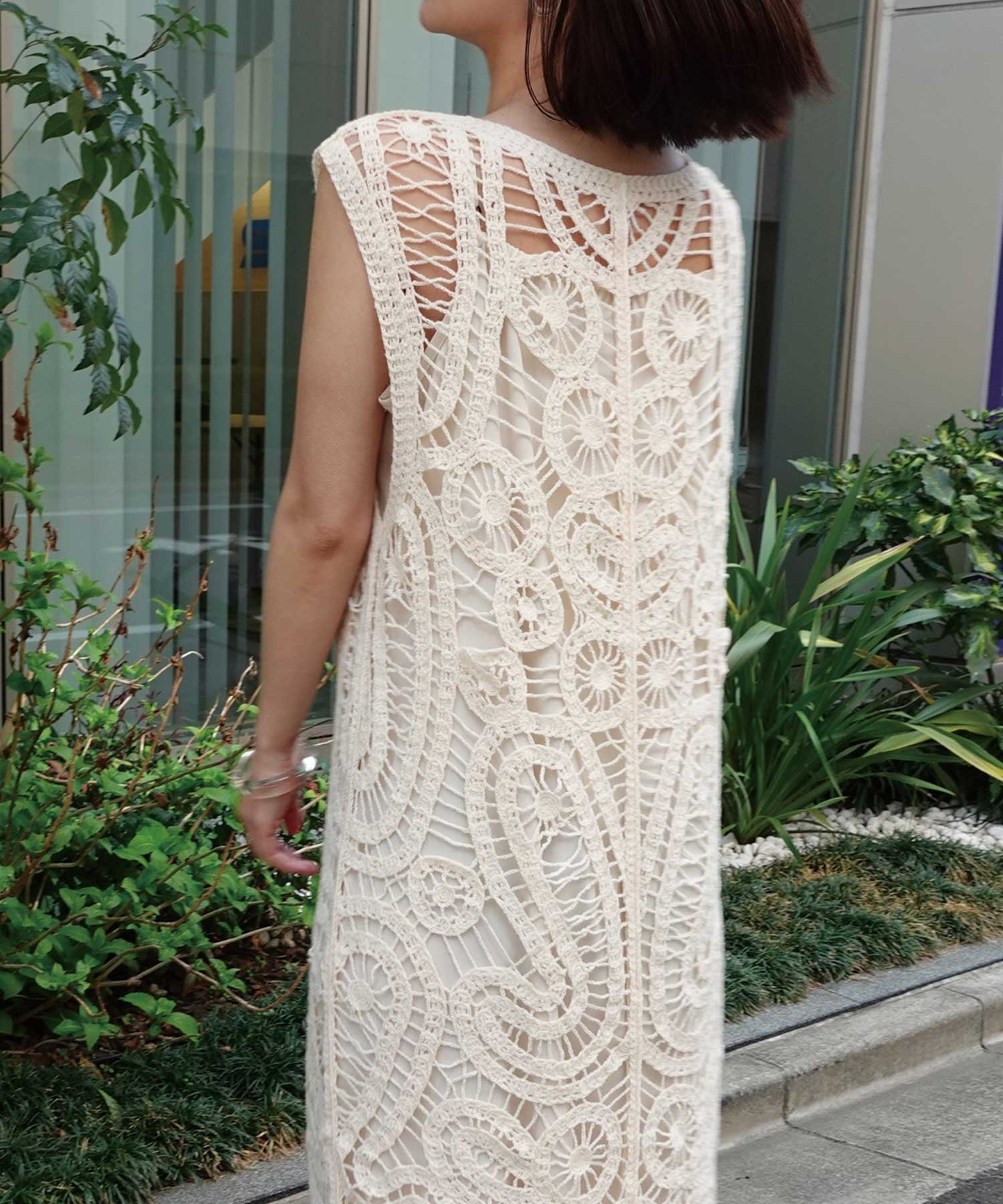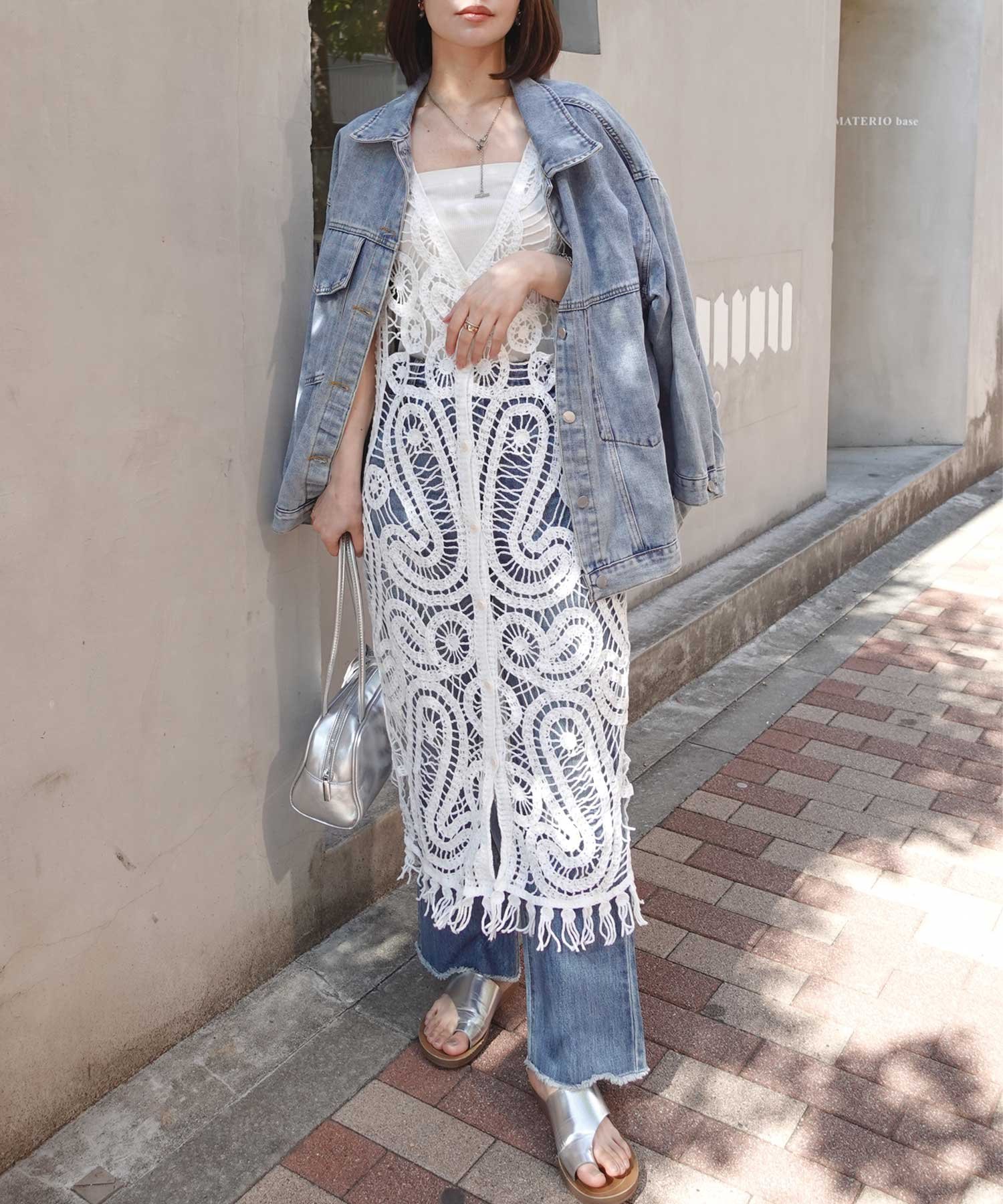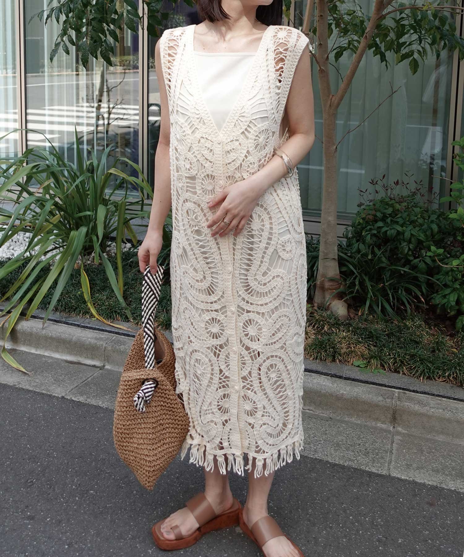 CORNERS クロシェニットフリンジワンピースジレ コーナーズ トップス ベスト・ジレ ベージュ ホワイト【送料無料】