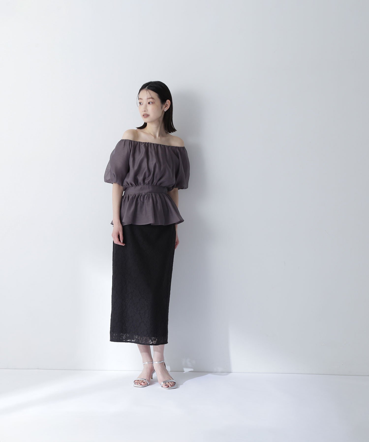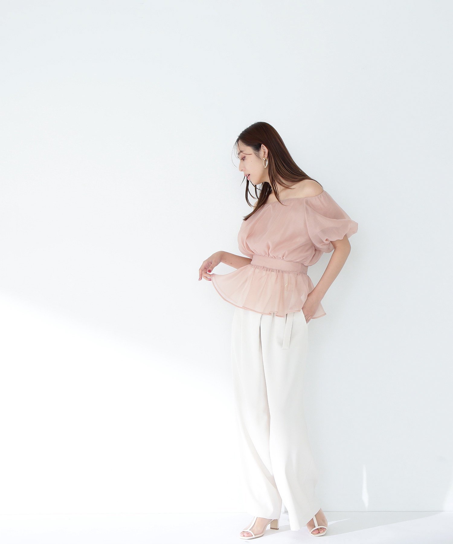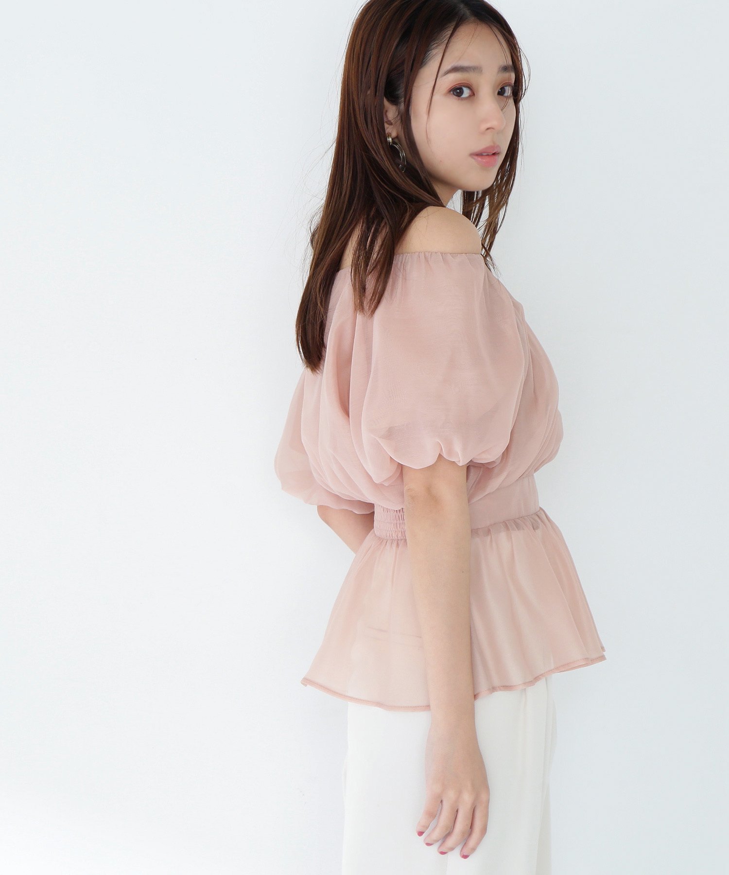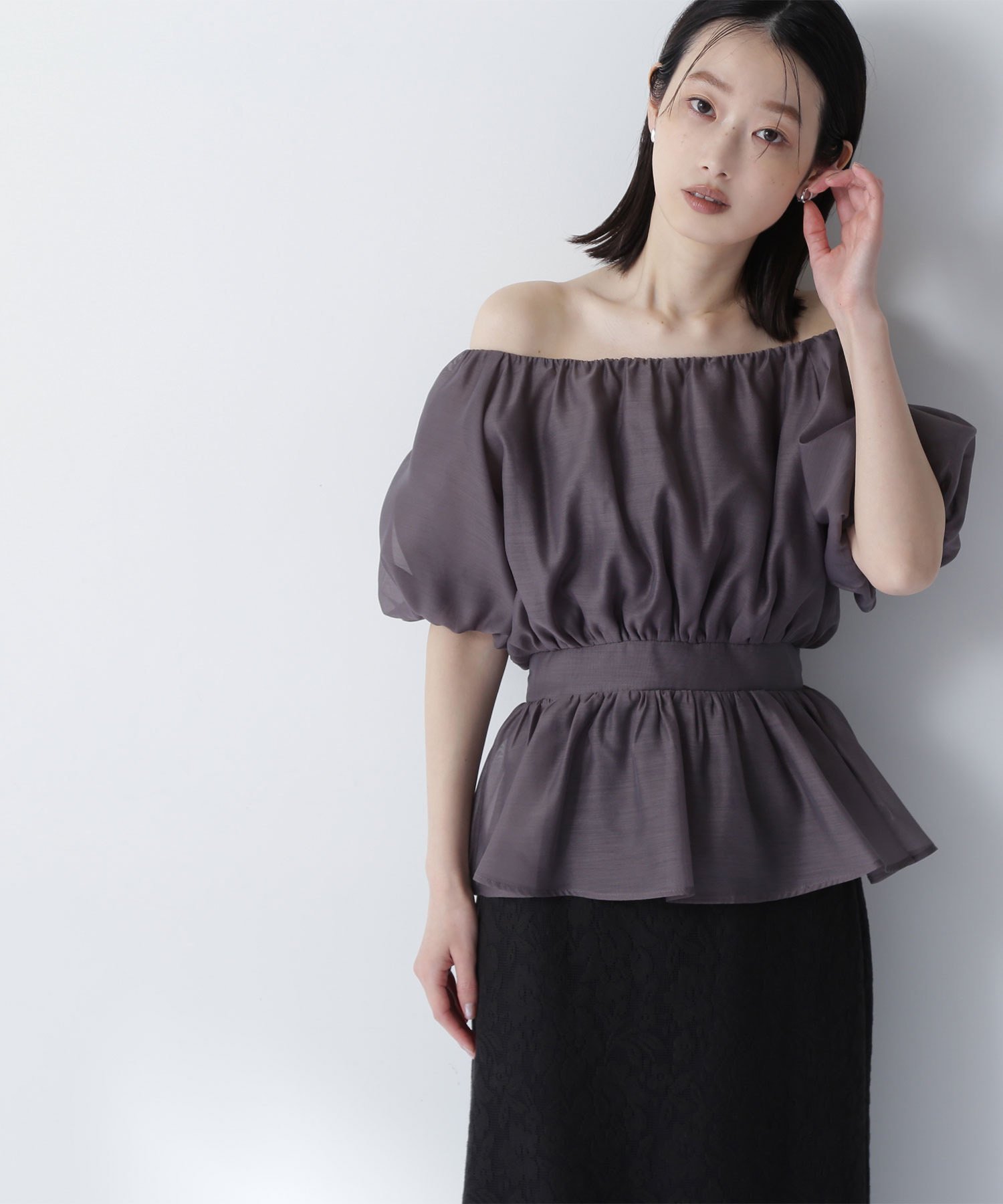 NATURAL BEAUTY BASIC シアーギャザーペプラムブラウス半袖 ナチュラルビューティベーシック トップス シャツ・ブラウス グレー ブルー レッド ベージュ【送料無料】