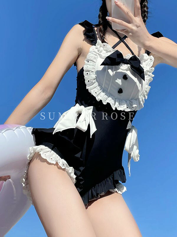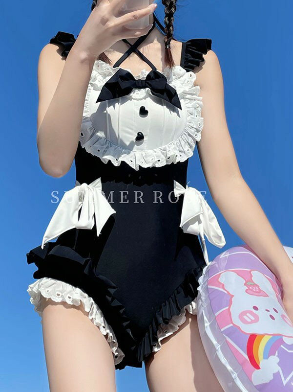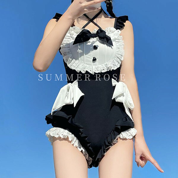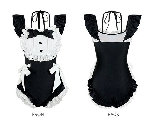 レディース 水着 レオタード パッド付 かわいい メイド リボン フリル 小胸 夏 海 ビーチ プール 旅行 S M L XL dm155t2t2w9