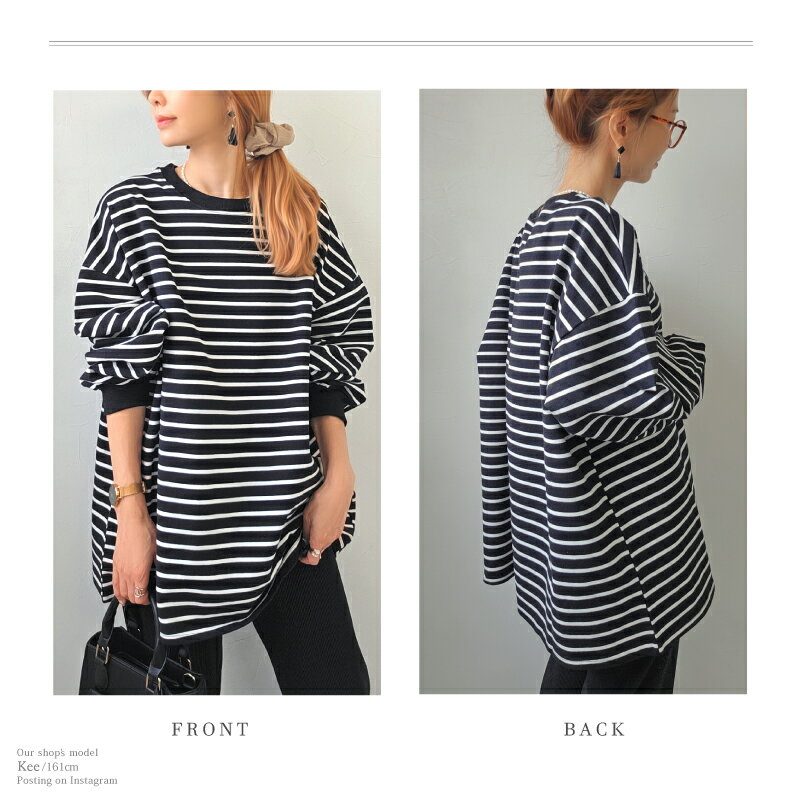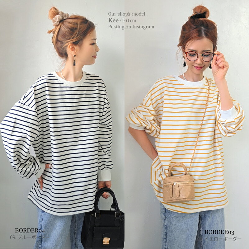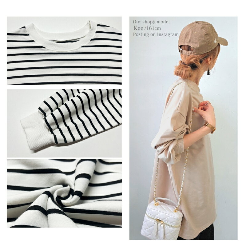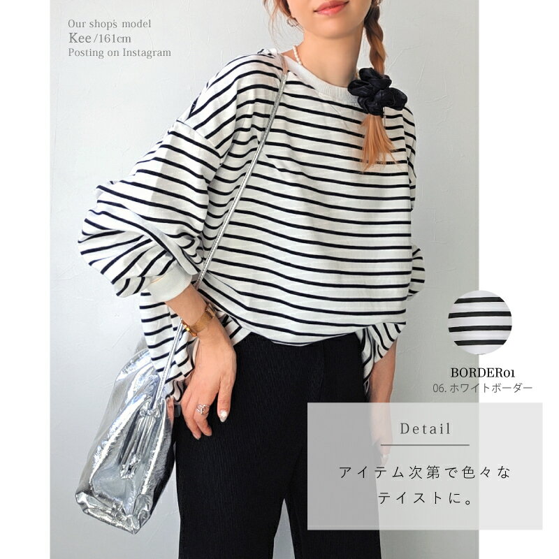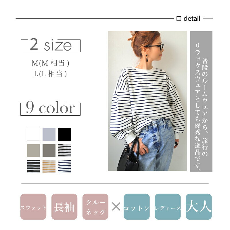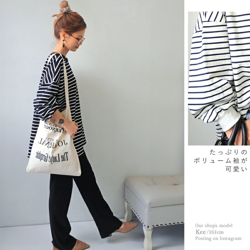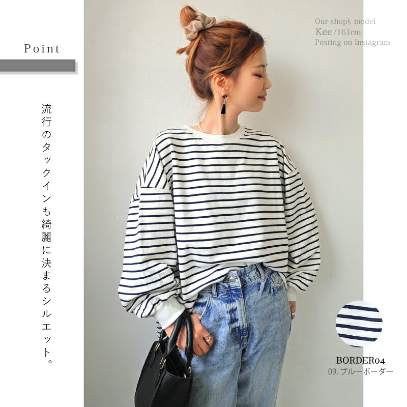 【クーポンで2380円】Tシャツ 長袖 ボリューム袖 ゆったり スウェット レディース プルオーバー ボーダー [コットン 袖リブ 厚手 M L 綿 ぽわん袖 きれいめ オーバーサイズ ビッグシルエット 大きい 抜け感 アースカラー ゆるシルエット カジュアル ルーム ウェア ]