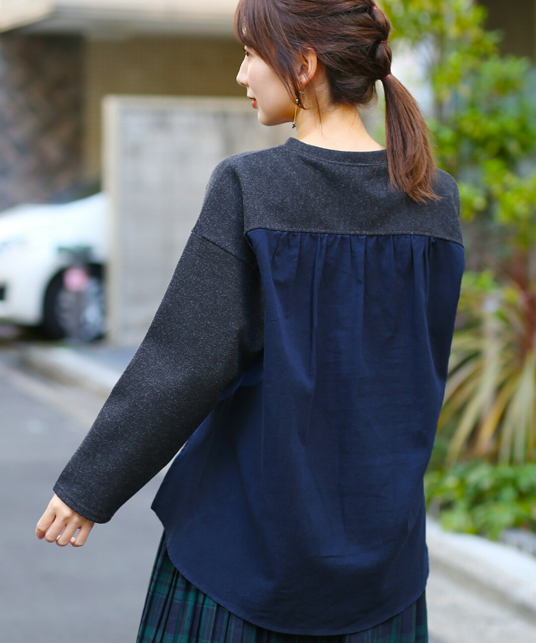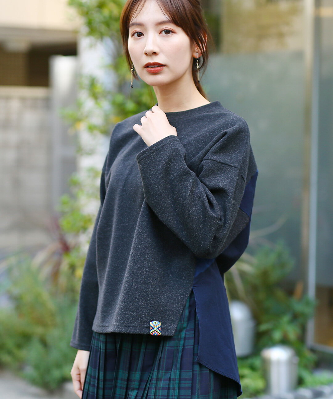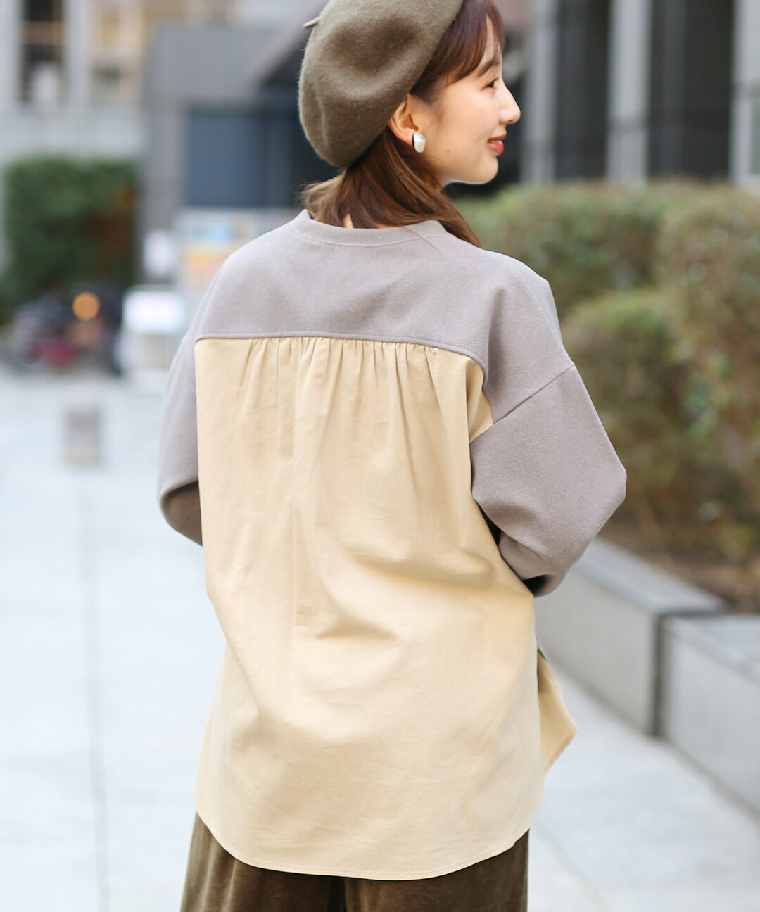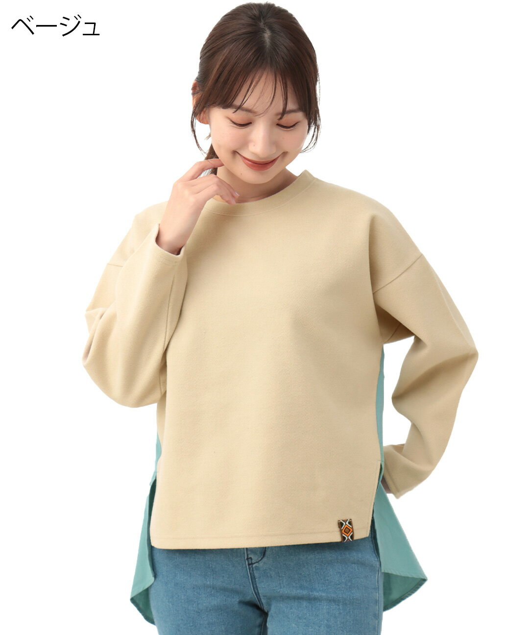 異素材コンビプルオーバー / デザイントップス レディース 秋 冬 無地 配色 ベージュ グレー チャコールグレー ゆったり 長袖 クルーネック バックシャン ウールライク フェイクウール カットソー スウェット カジュアル エスニック チチカカ TITICACA